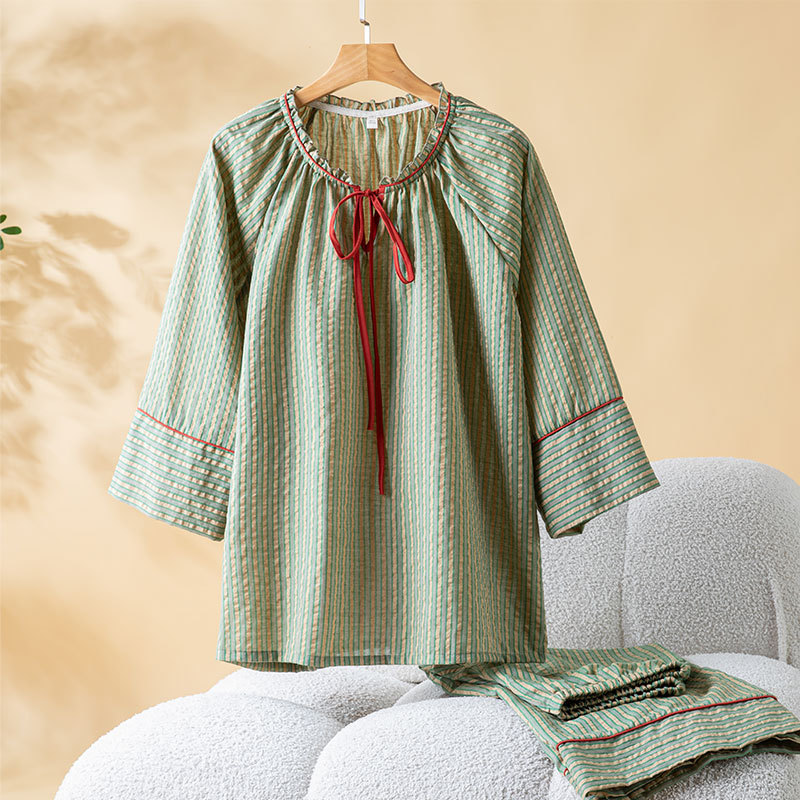 商品名称:(总)洛兰沙家居馆 2026年春季新款纯棉睡衣女条纹长袖圆领套头休闲家居服套装可外穿