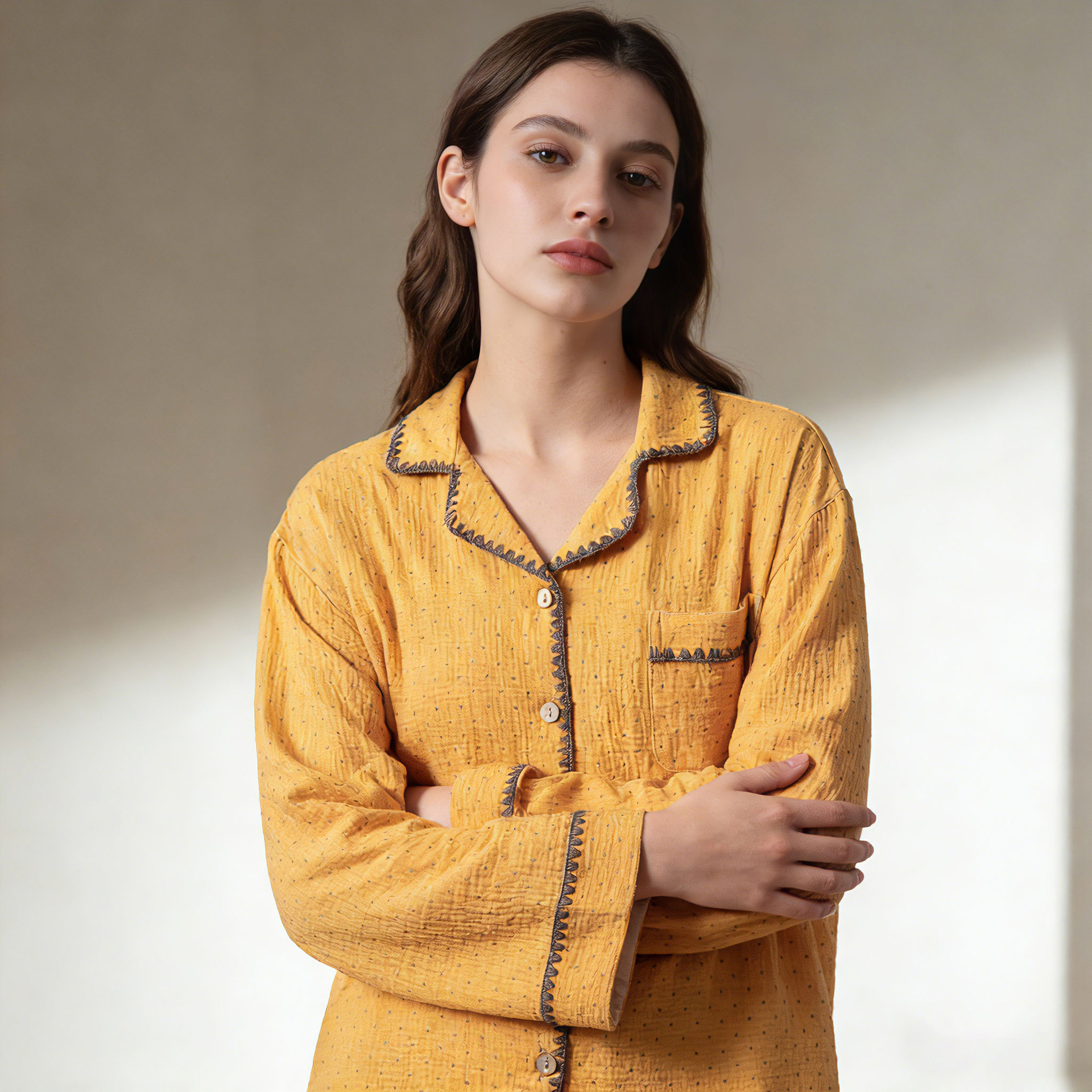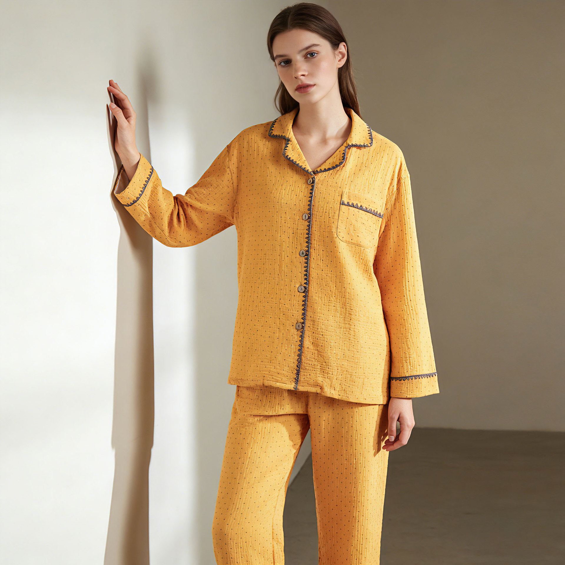 (总)洛兰沙家居馆 日式纯棉情侣睡衣春秋夏季无印风男女纱布长袖长裤家居服套装,女款粉格,女款绿格,男款咖格