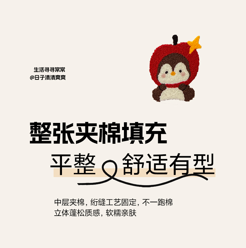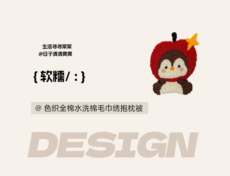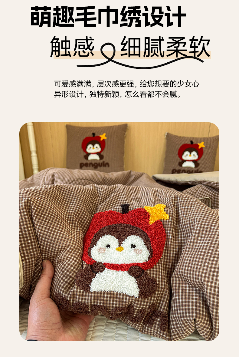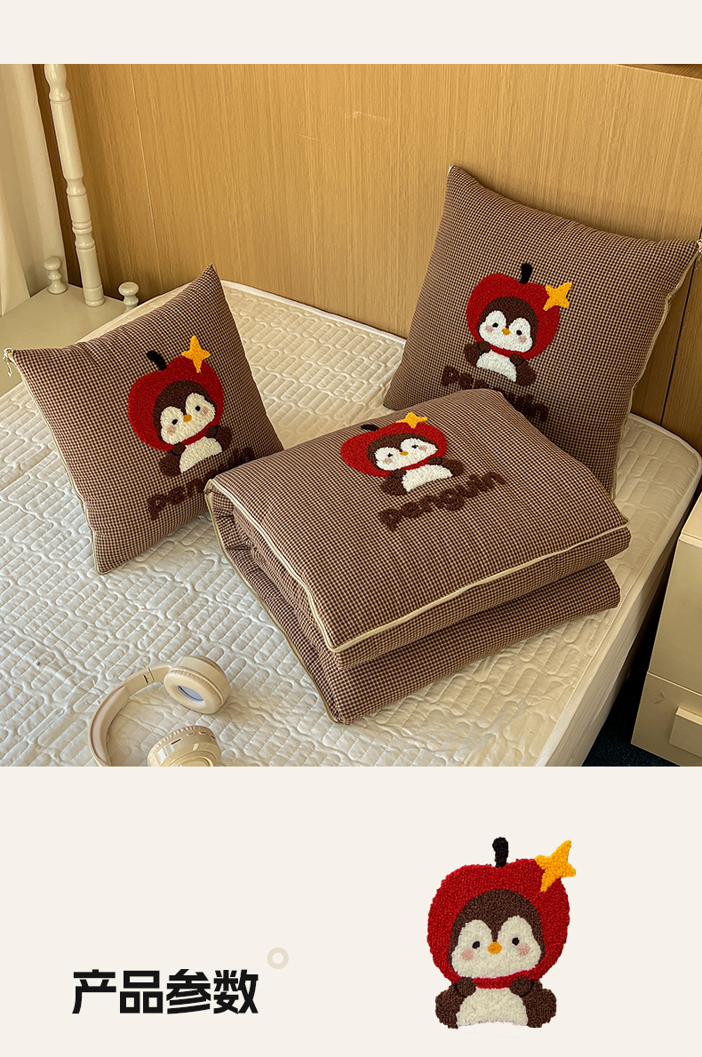 商品名称:番茄+ 2026春夏新款色织全棉纯棉水洗棉毛巾绣抱枕被 苹果企鹅-咖格