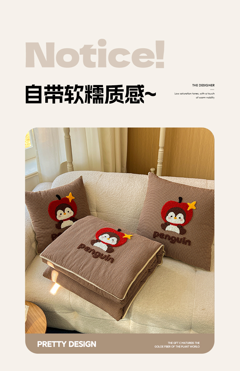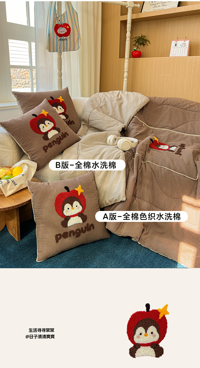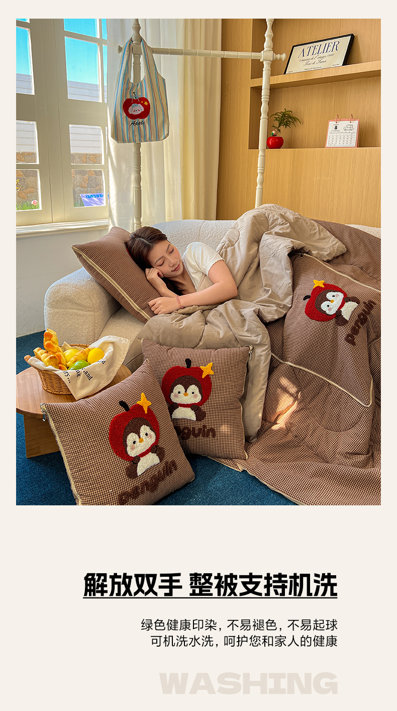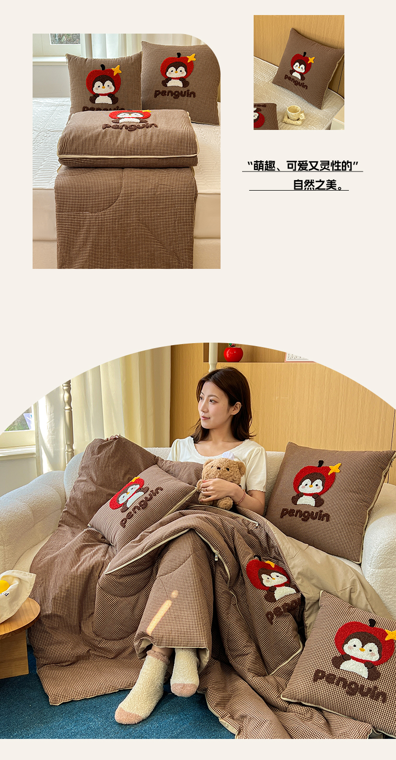 番茄+ 2026春夏新款色织全棉纯棉水洗棉毛巾绣抱枕被 苹果企鹅-咖格