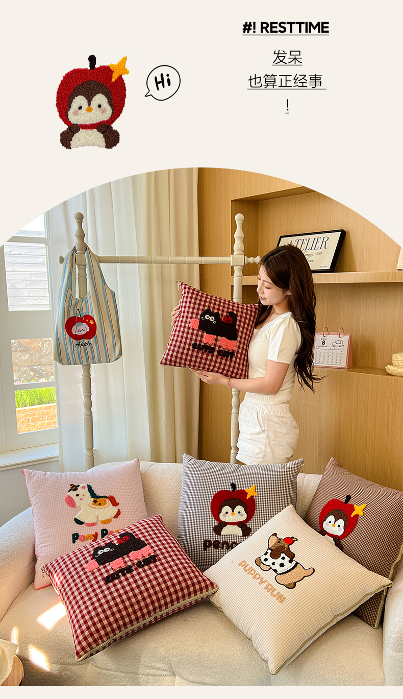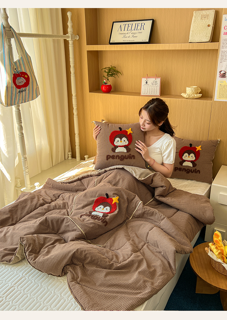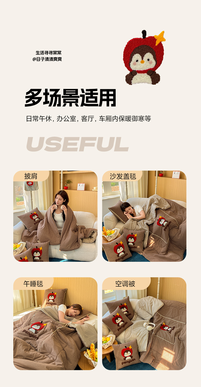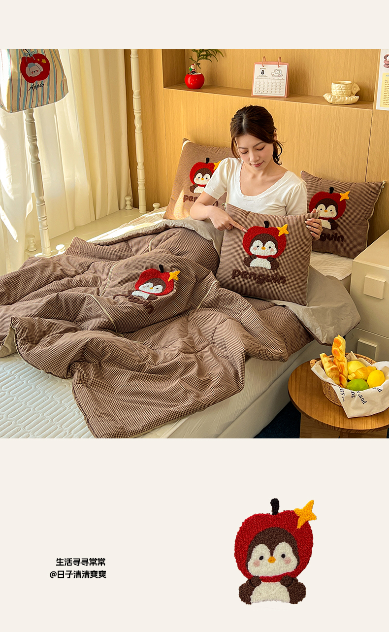 番茄+ 2026春夏新款色织全棉纯棉水洗棉毛巾绣抱枕被 苹果企鹅-咖格