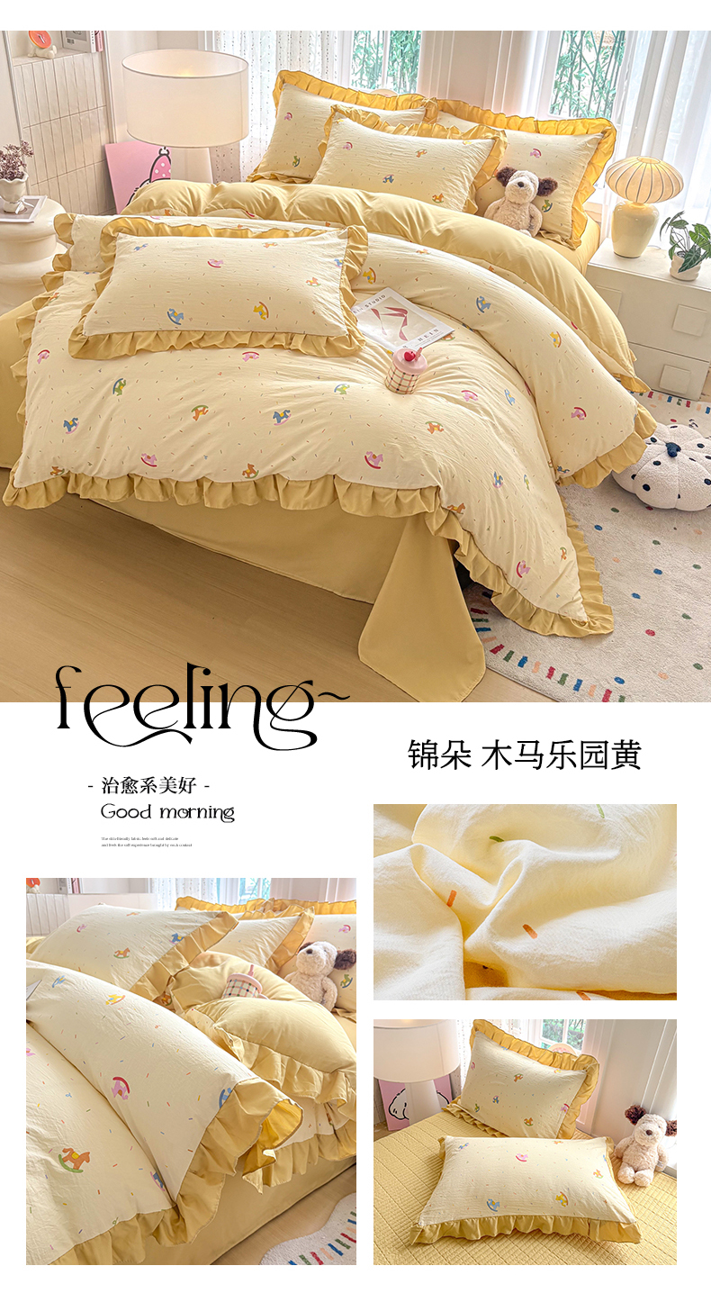 当前位置: 91家纺网 > 商品网购 > 床品套件 > 四件套 > 其它四件套 > 铠畅 2026春夏新款锦朵系列 韩版水洗棉小清新古棉床单床笠四件套 锦朵 木马乐园黄