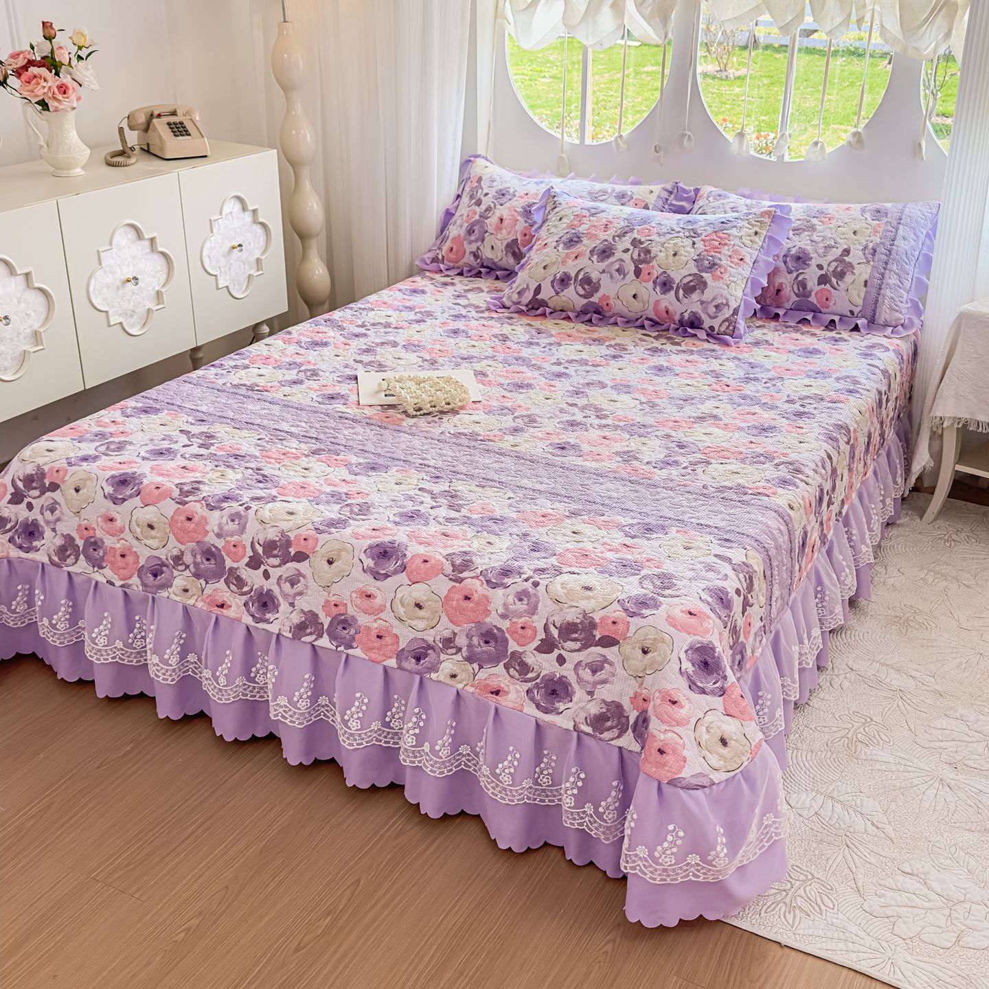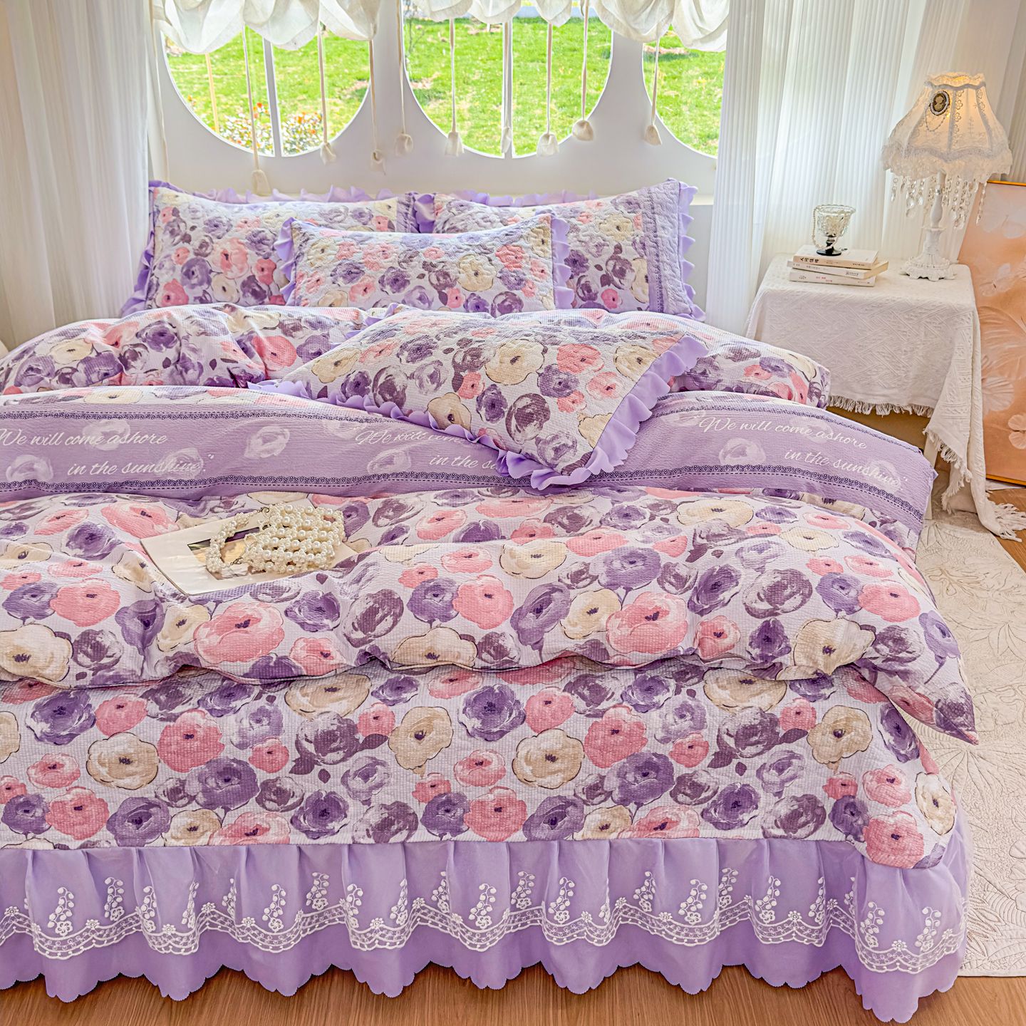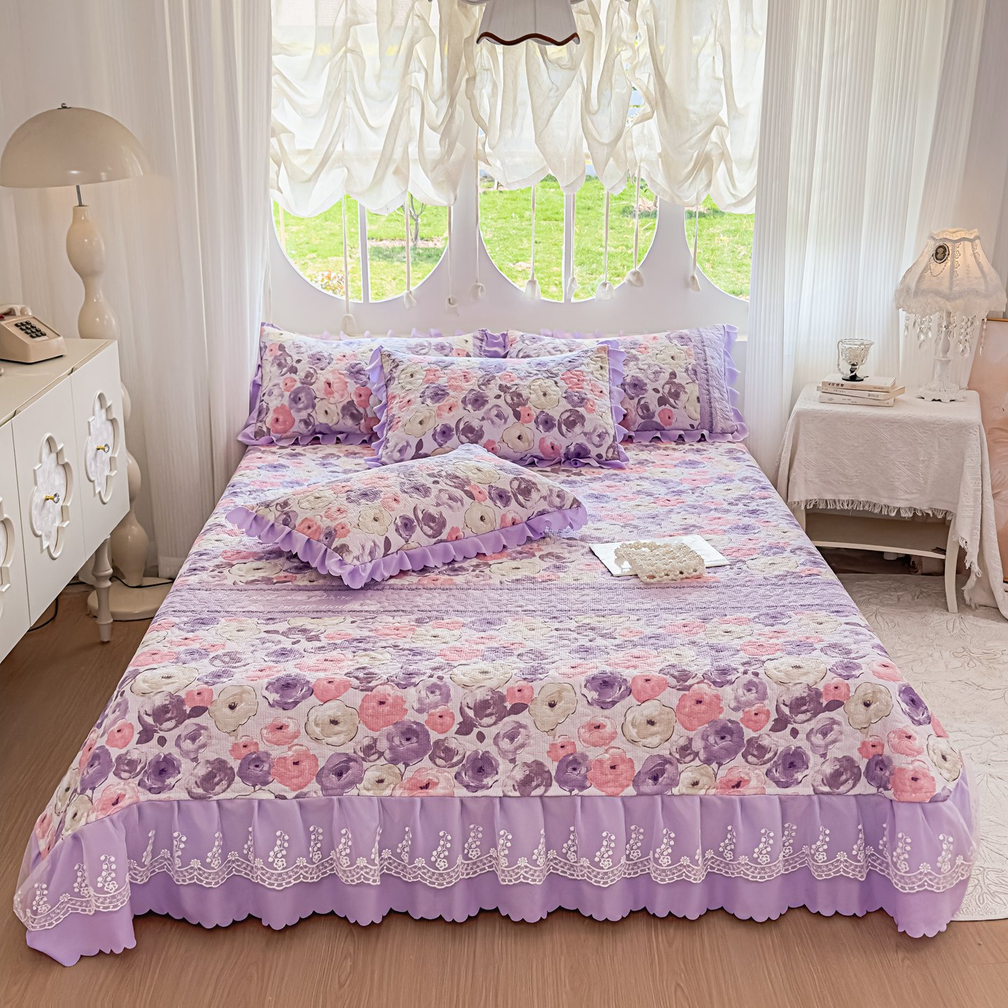 (总)雅眠居 2026直播爆款泡芙棉双层蕾丝花边床盖四件套,红色小马,莫奈花园,甜心-粉,甜心-灰,甜心-蓝,甜心-绿,甜心-紫,薰衣草,织梦时空