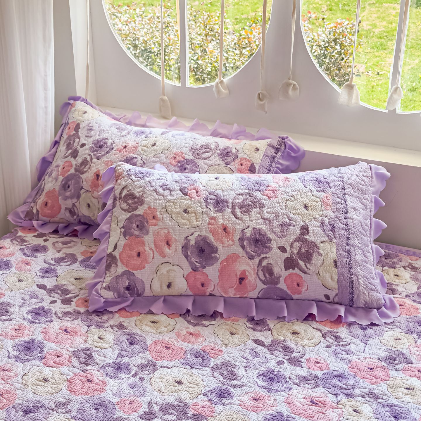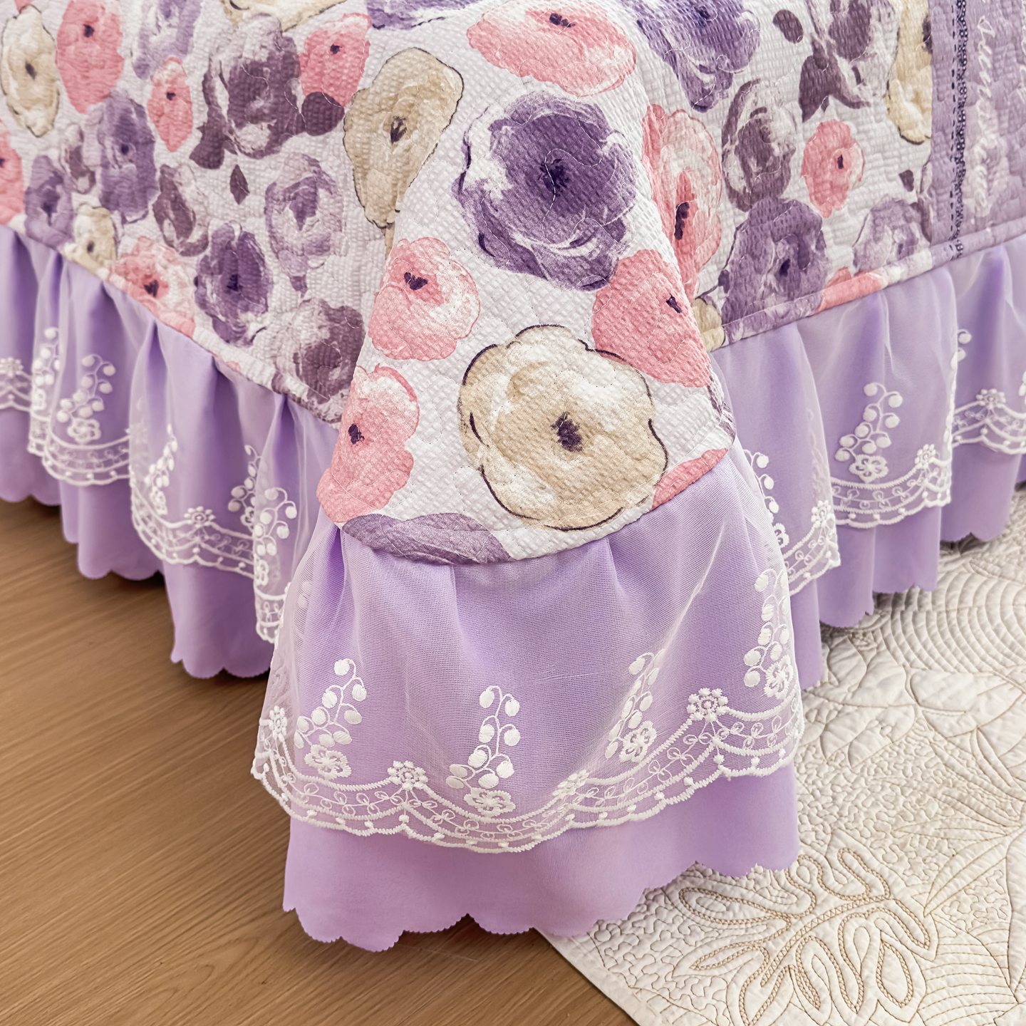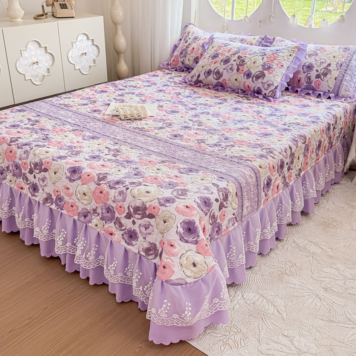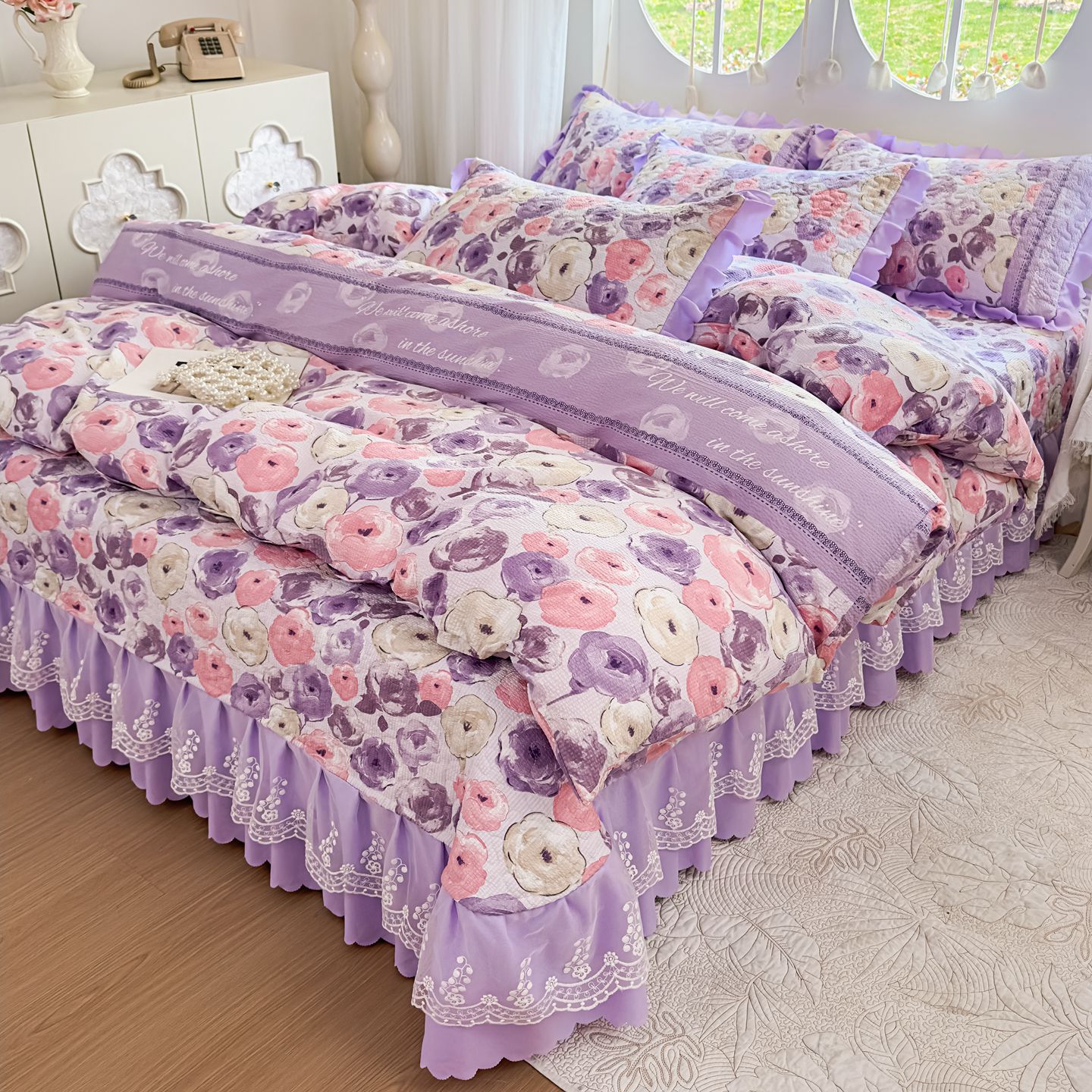 (总)雅眠居 2026直播爆款泡芙棉双层蕾丝花边床盖四件套,红色小马,莫奈花园,甜心-粉,甜心-灰,甜心-蓝,甜心-绿,甜心-紫,薰衣草,织梦时空