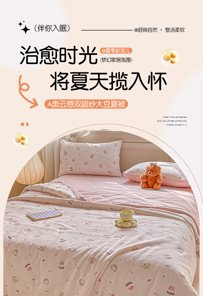 秋泽家纺 2026新款A类云感双层纱大豆纤维夏凉被空调被小清新印花夏被 奶糯粉喵
