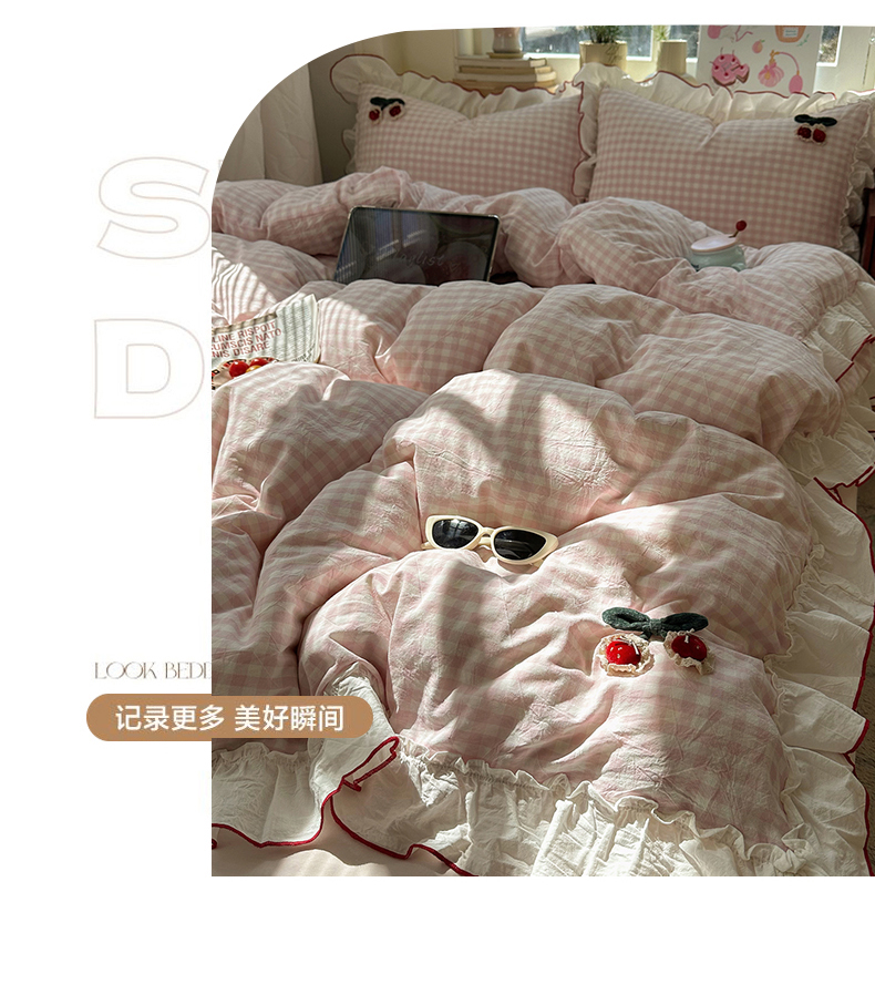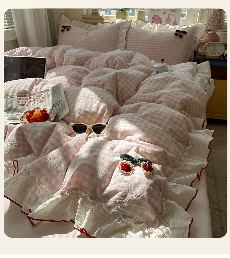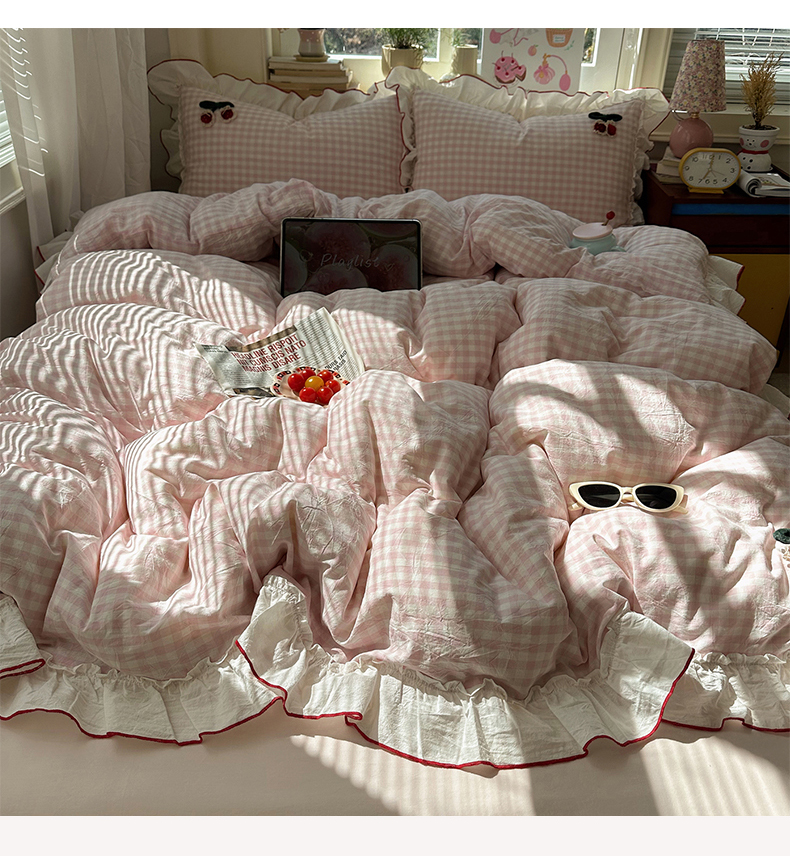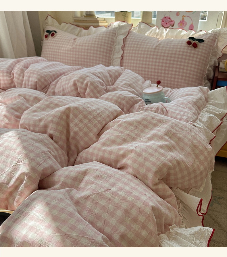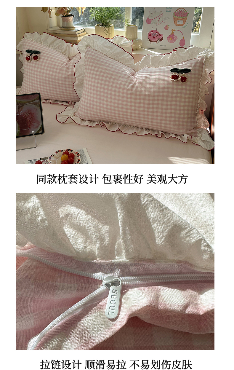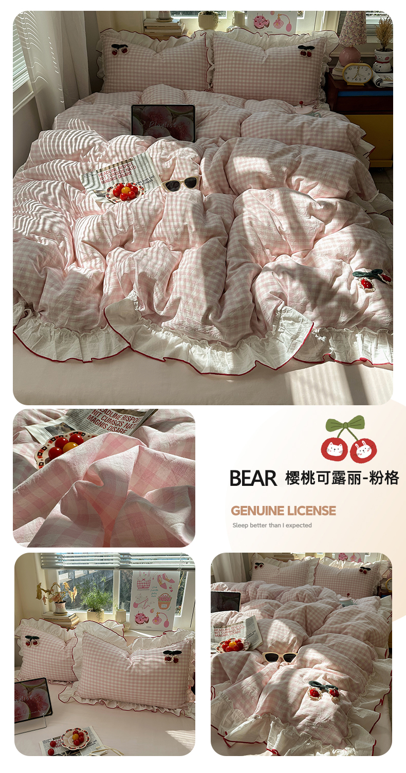 首尔家纺 2026新款全棉色织水洗棉四件套花边款小红书ins风-樱桃可露丽 樱桃可露丽-粉格