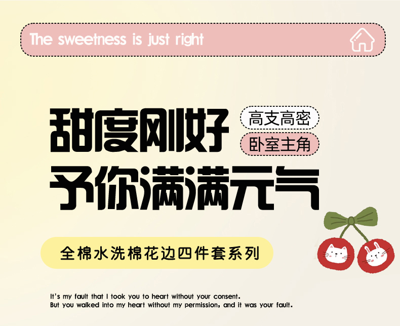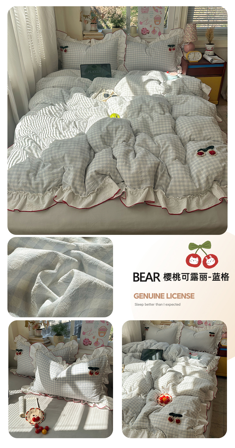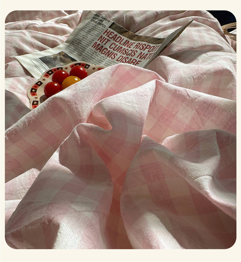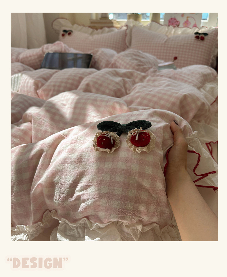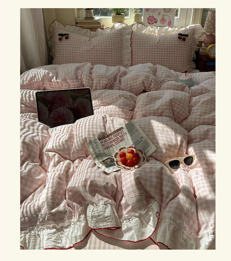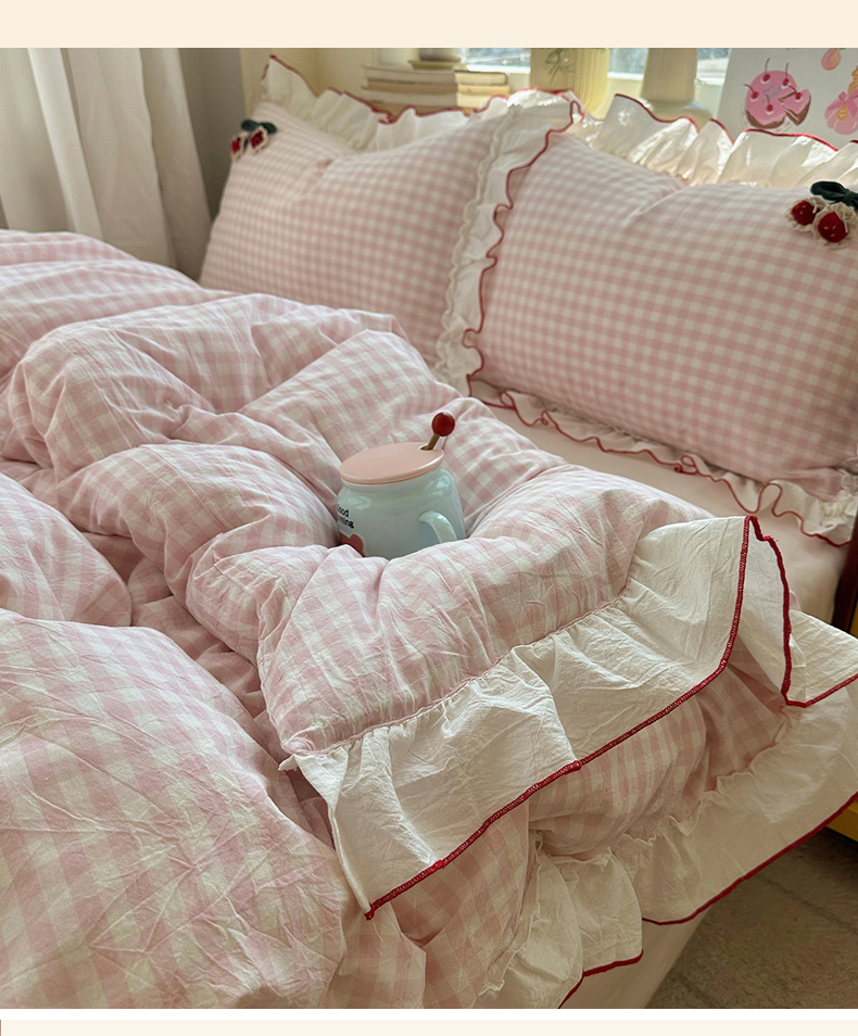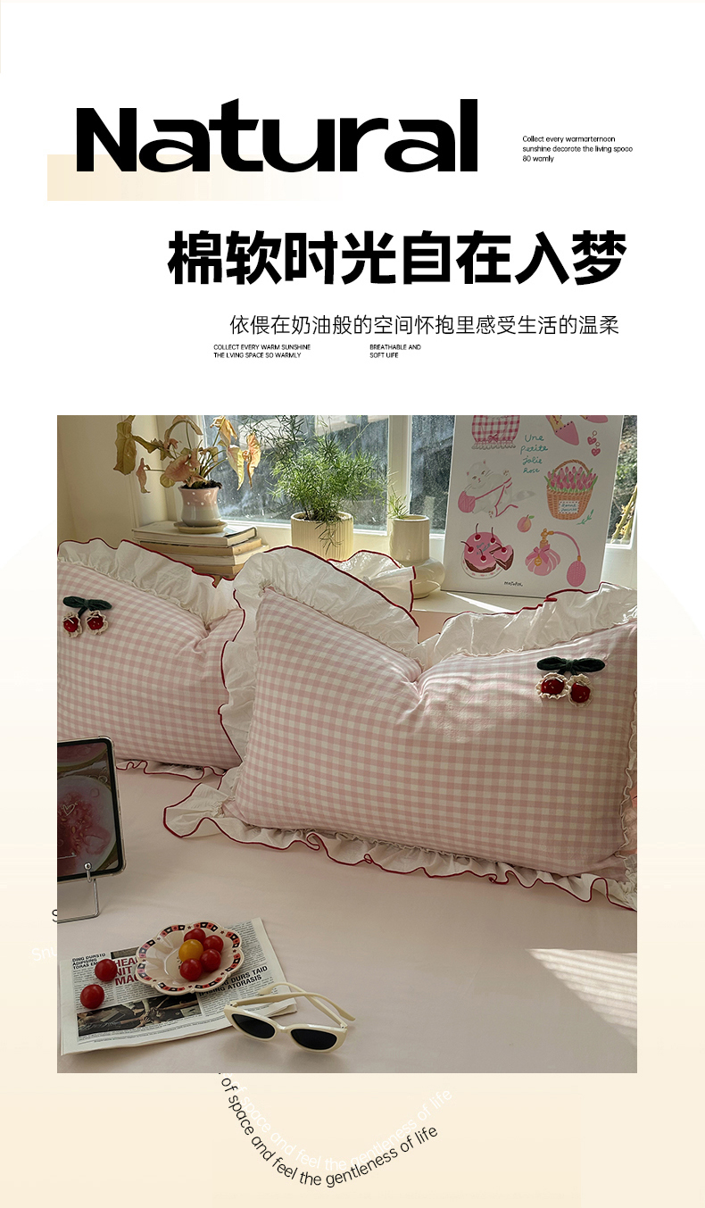 首尔家纺 2026新款全棉色织水洗棉四件套花边款小红书ins风-樱桃可露丽 樱桃可露丽-粉格