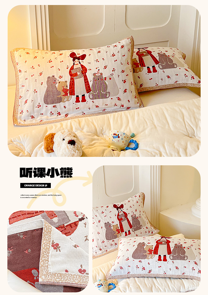 (总)乐家毛巾被(工厂自产自销) 2026新款四层色织全棉提花纱布软萌枕巾,白底条纹花,调皮小狗,粉底条纹花,黑猫小鱼,蝴蝶结,花花小熊,开心云朵,萝卜兔子,帽子熊,面包小猫,气球小熊,泰迪兄弟,条纹草莓,条纹鸭梨,条纹樱桃,眼镜猫,樱桃小狗,长鼻象,长耳狗,组合图