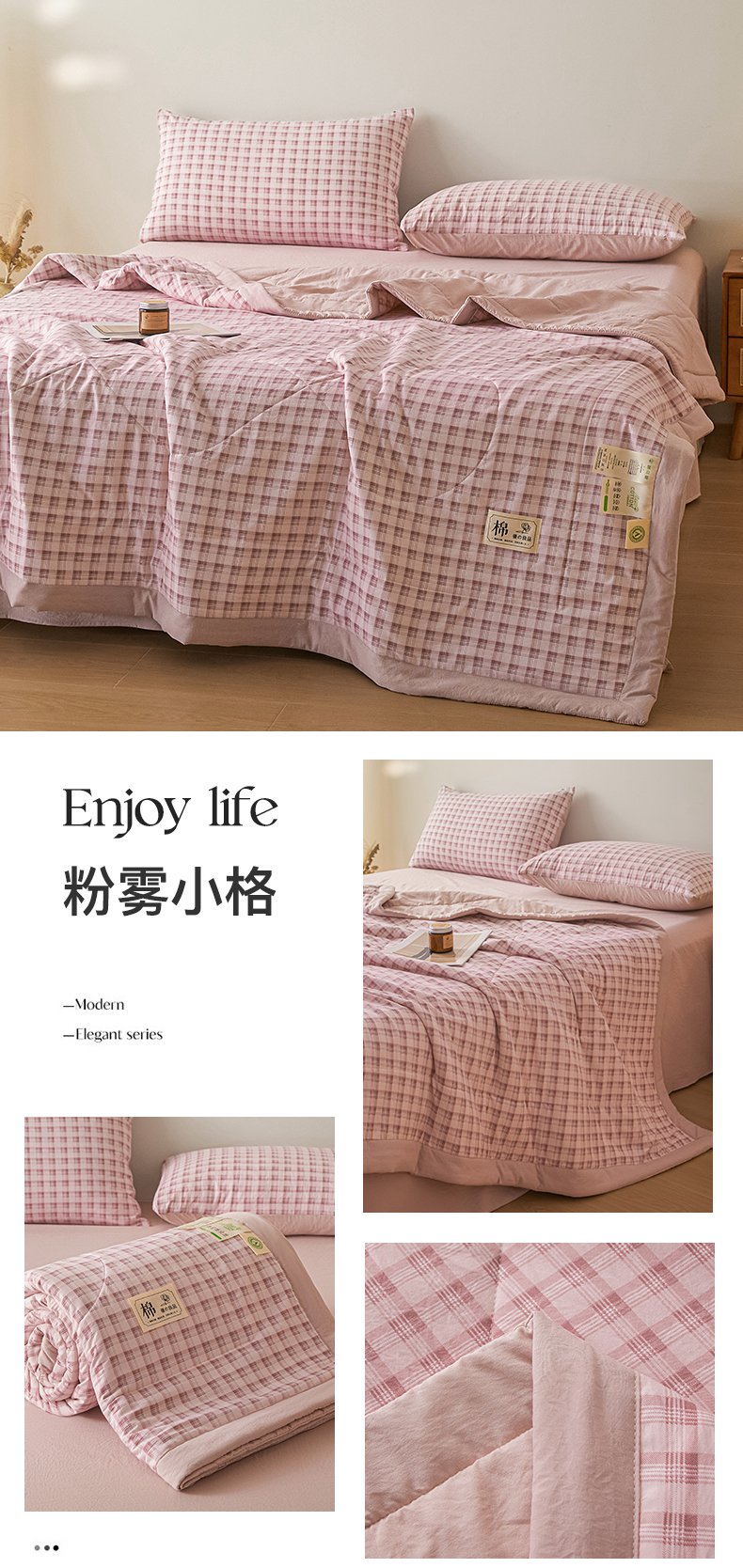 (总)寐眠 2023新款全棉色织水洗棉儿童夏被,粉大格,粉小格,灰白格,蓝大格,蓝小格,雾蓝格,小粉格