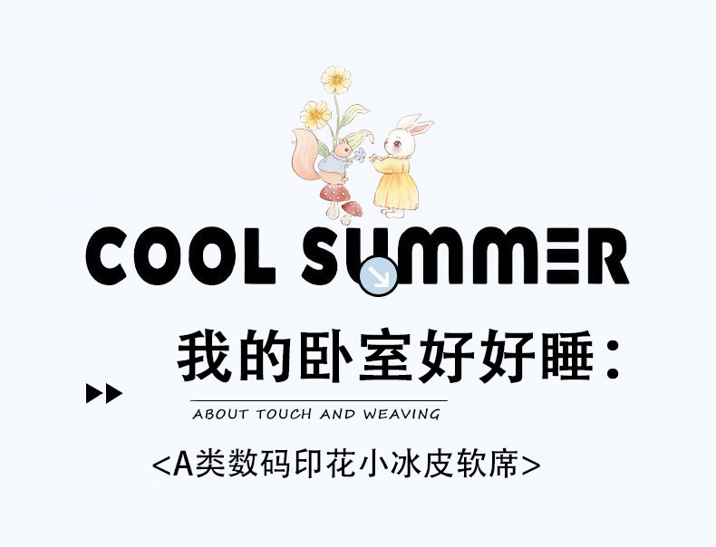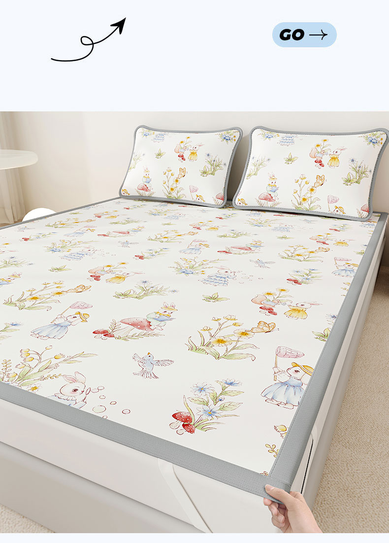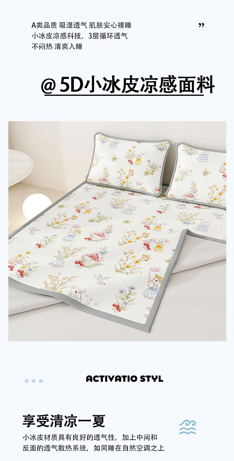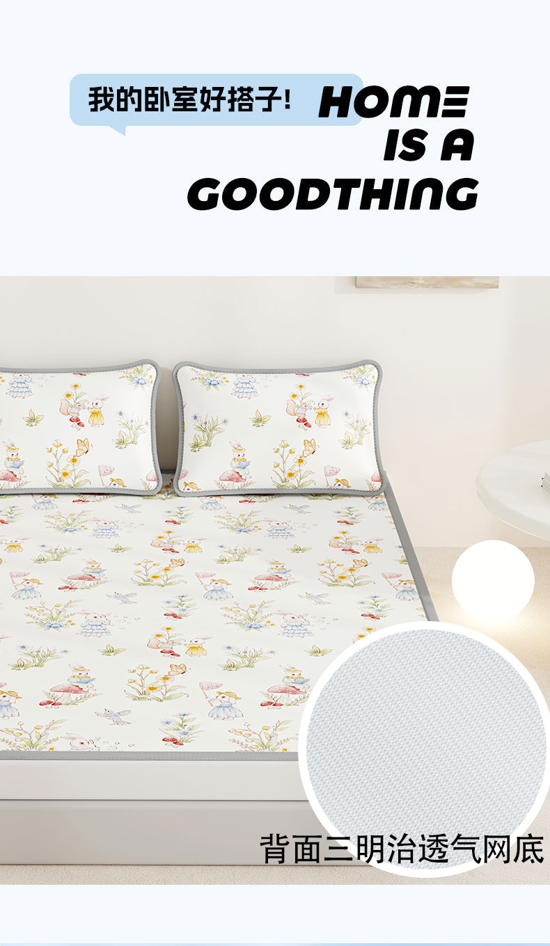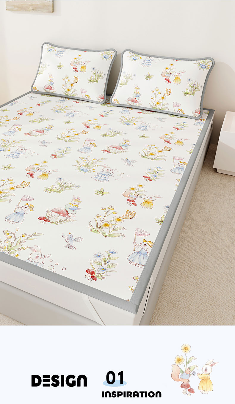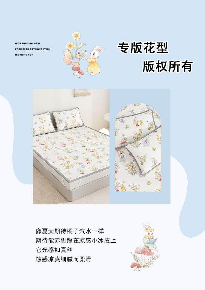 • 91家纺网 家纺一手货源 找家纺 奇丝雅 2026A类数码印花大版卡通冰丝凉席双人席可机洗学生宿舍空调软席三件套三明治网底 精灵小兔