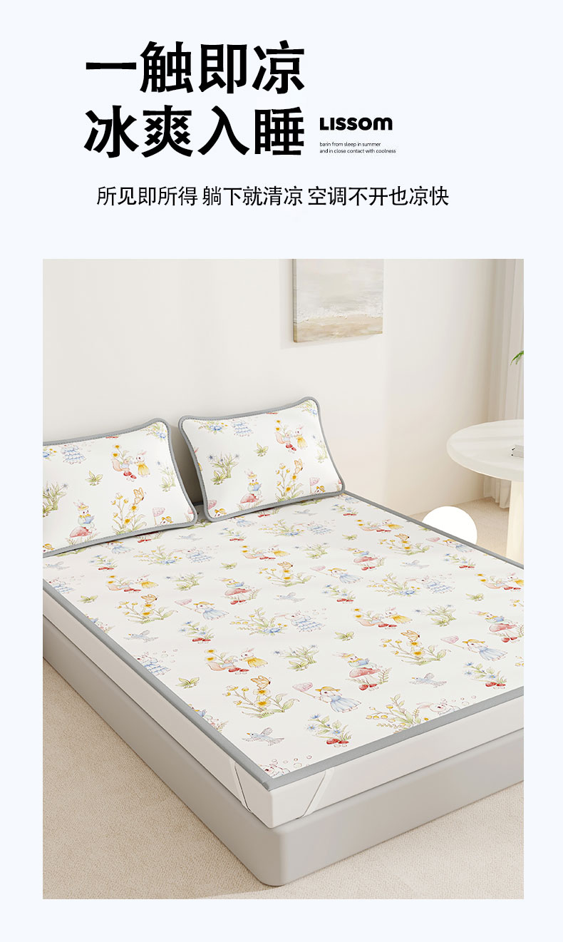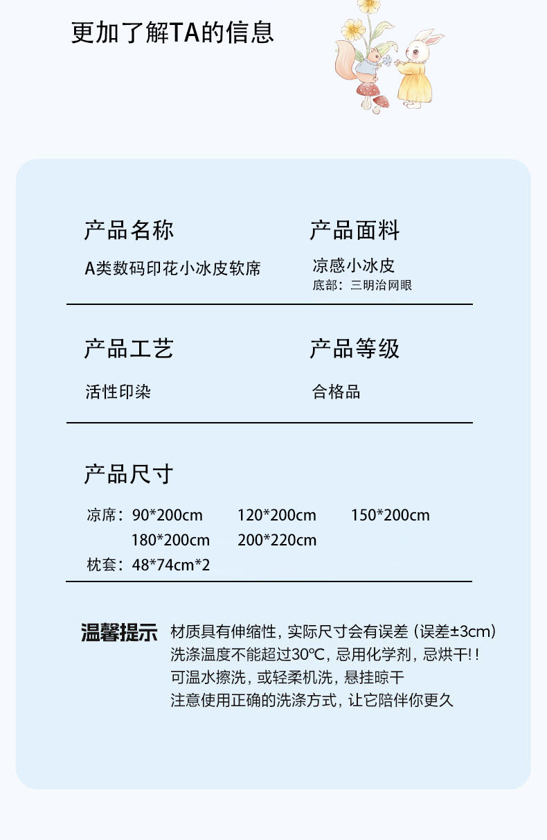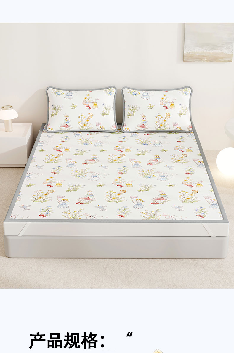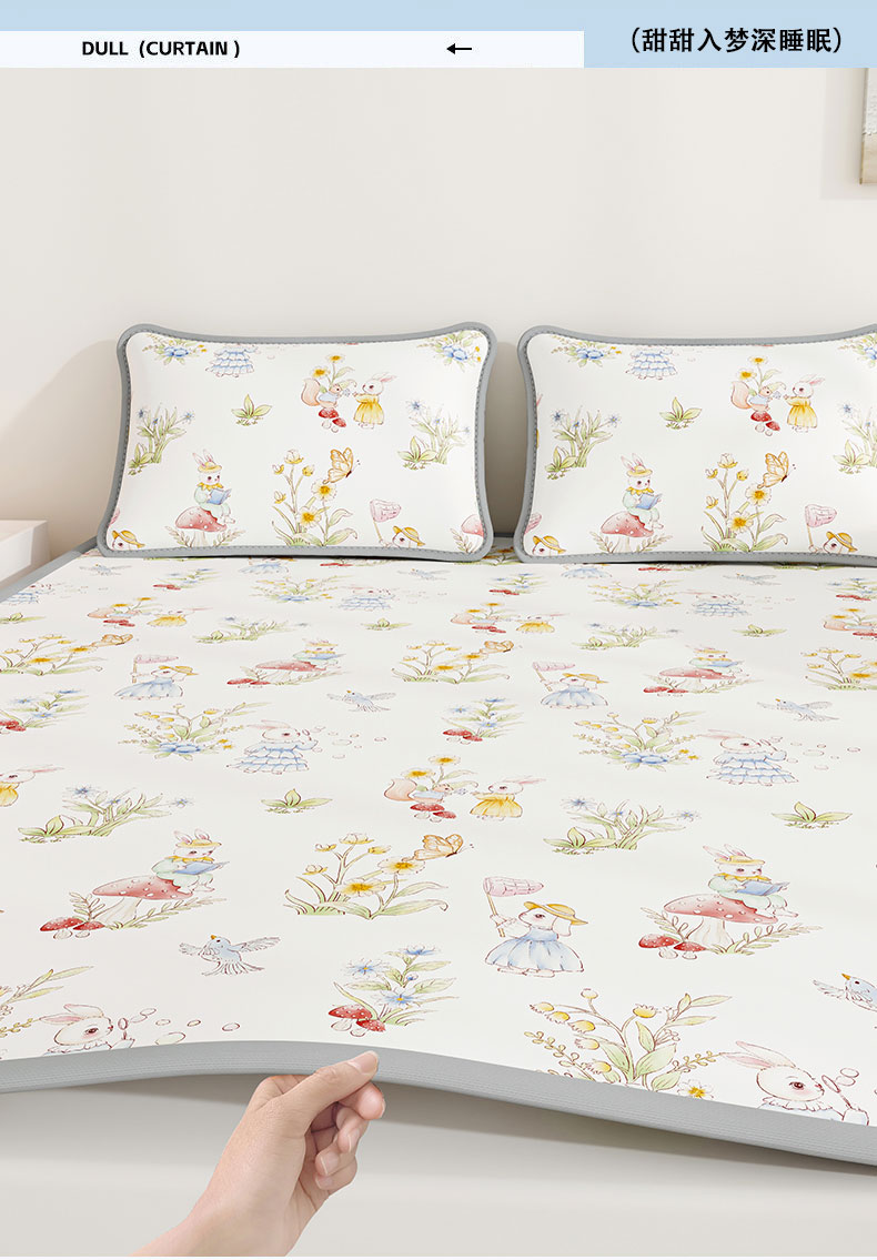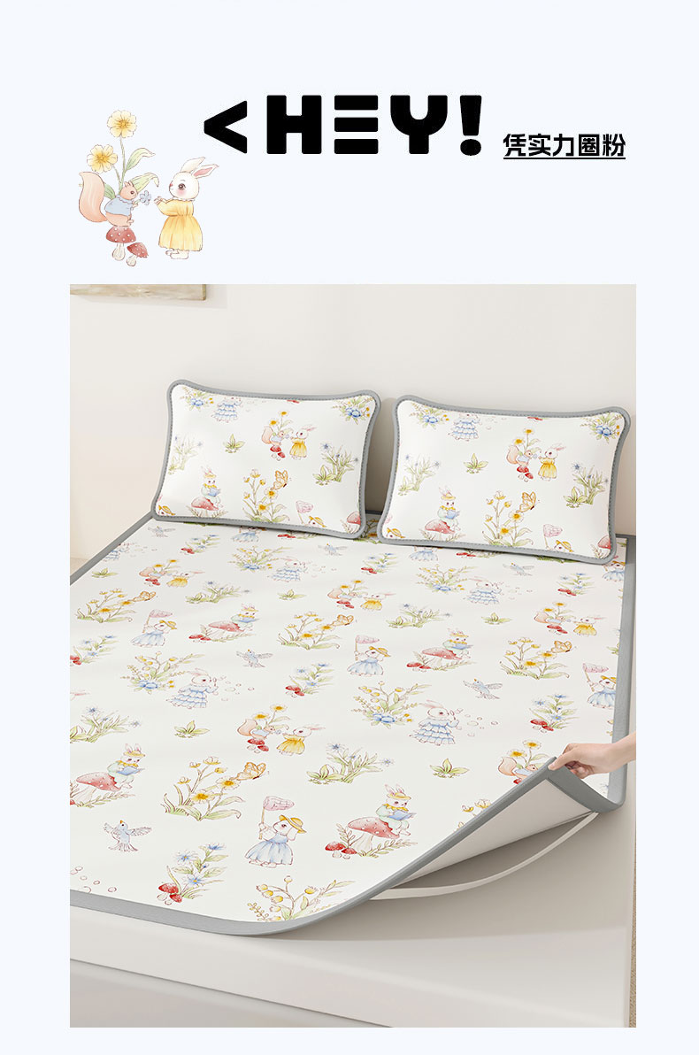 当前位置: 91家纺网 > 商品网购 > 床上用品 > 凉席 > 奇丝雅 2026A类数码印花大版卡通冰丝凉席双人席可机洗学生宿舍空调软席三件套三明治网底 精灵小兔
