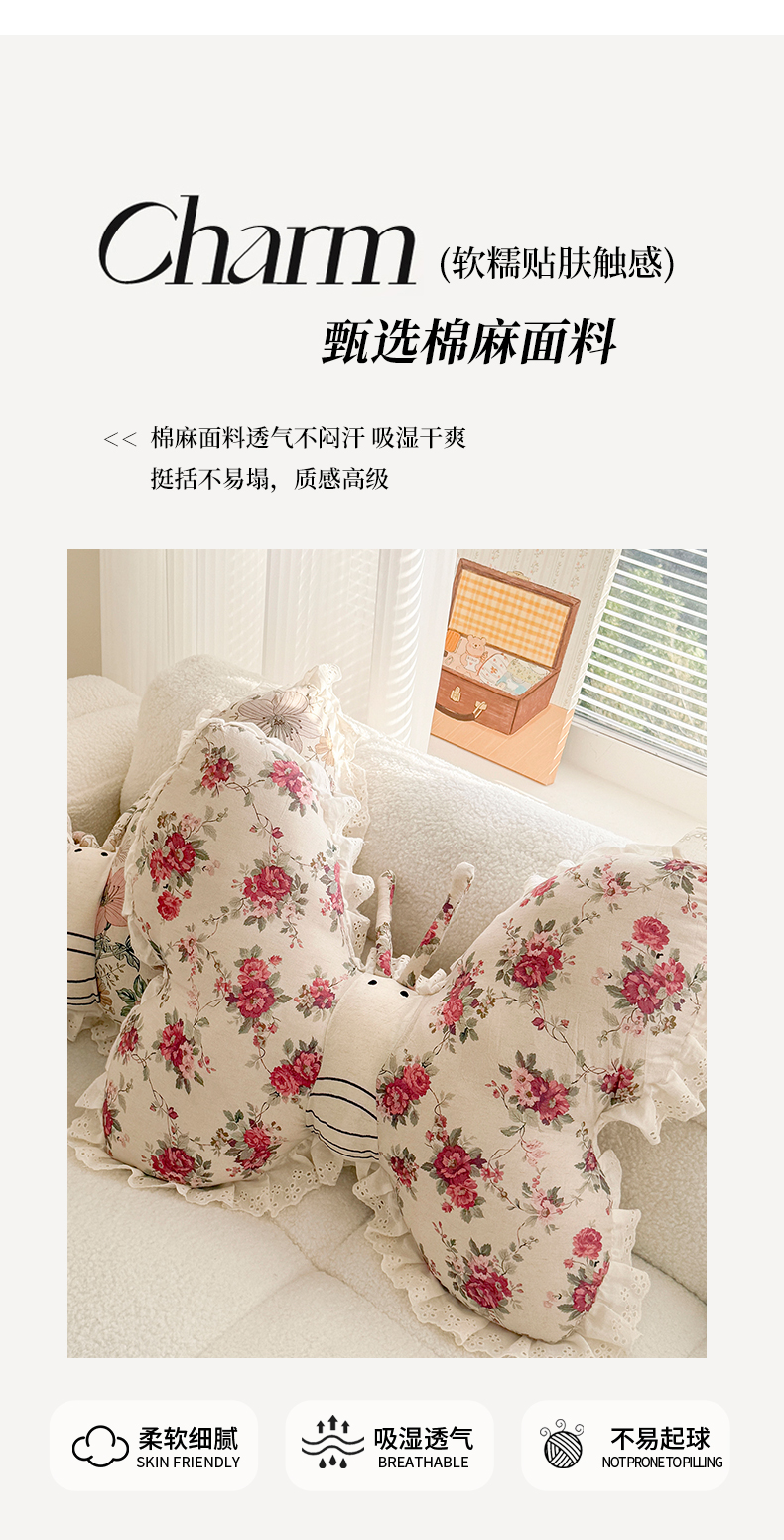 蔻眠 花边款棉麻刺绣蝴蝶抱枕靠枕异型枕芯 青瓷花语