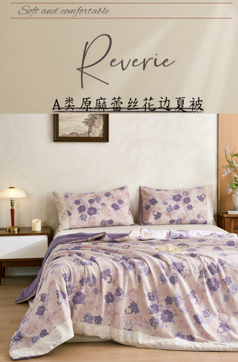 商品名称:梦舒羽 2026新款A类夏天原麻全棉蕾丝花边加厚夏被宿舍双人床仿亚麻被子被芯 安紫