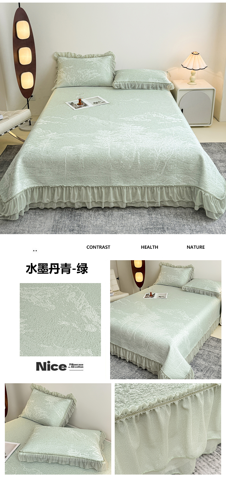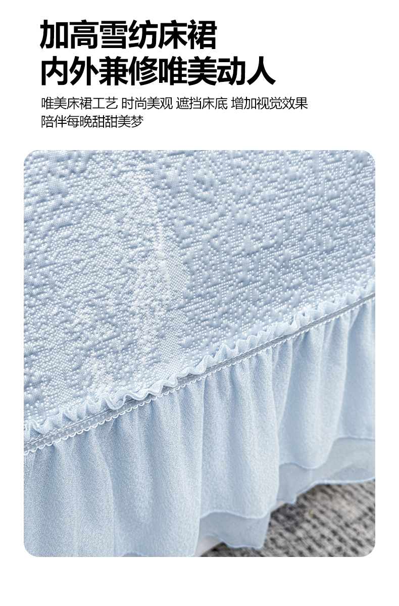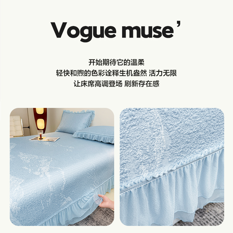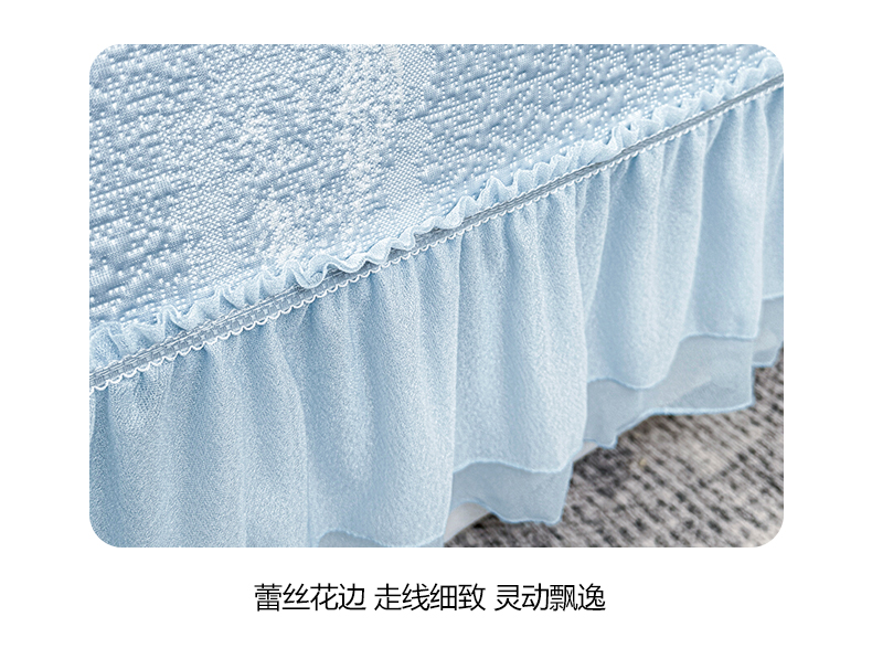 (总)慕木家纺 2026新款A类乙纶双面提花560克冰豆豆花边床盖款床裙迎客松系列(提供买家秀),迎客松-蓝,迎客松-绿,迎客松-粉,迎客松-灰