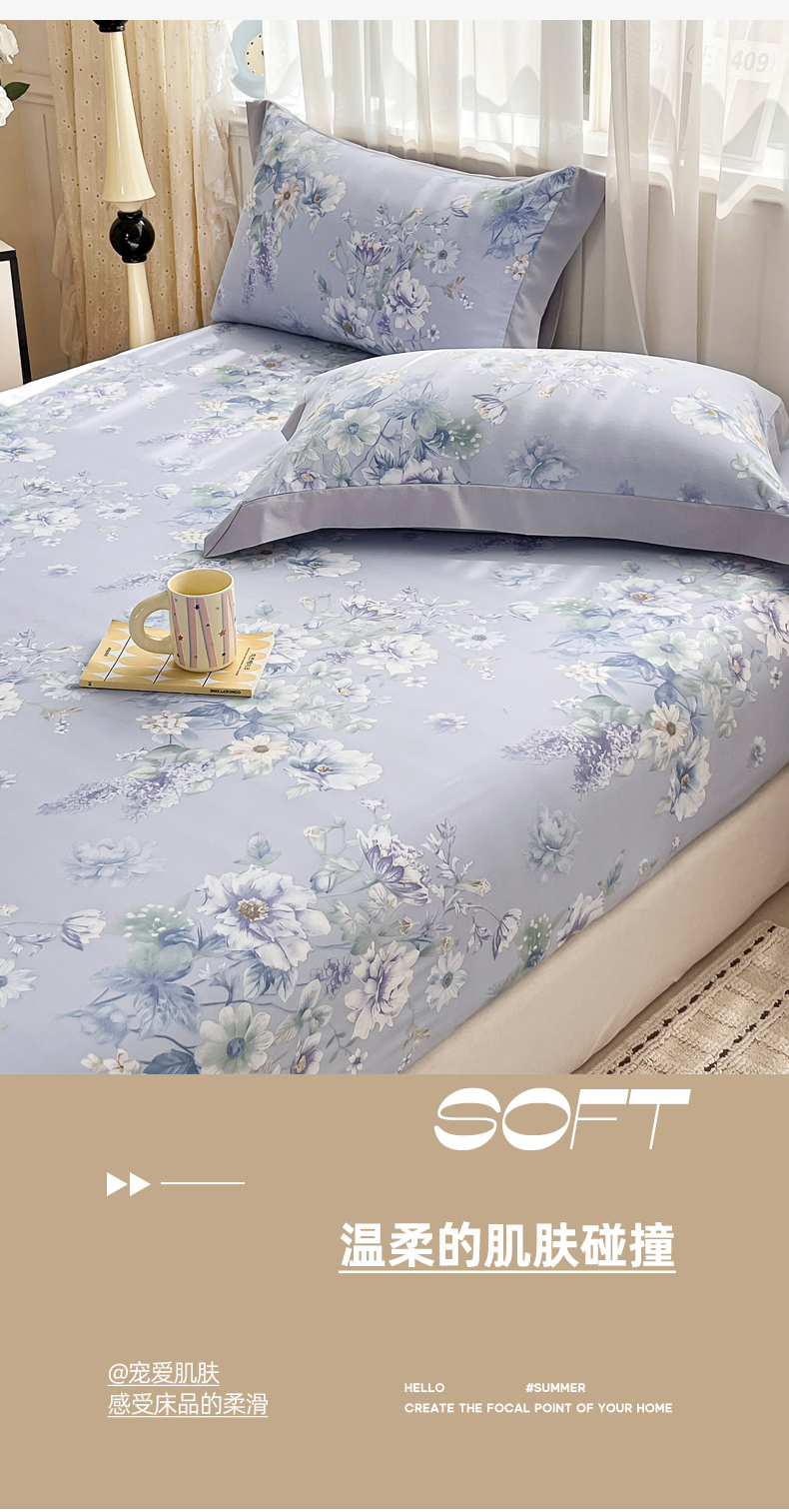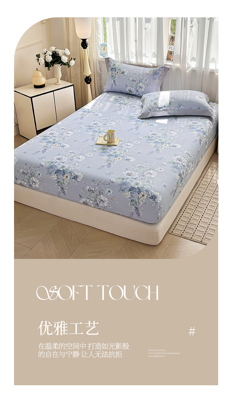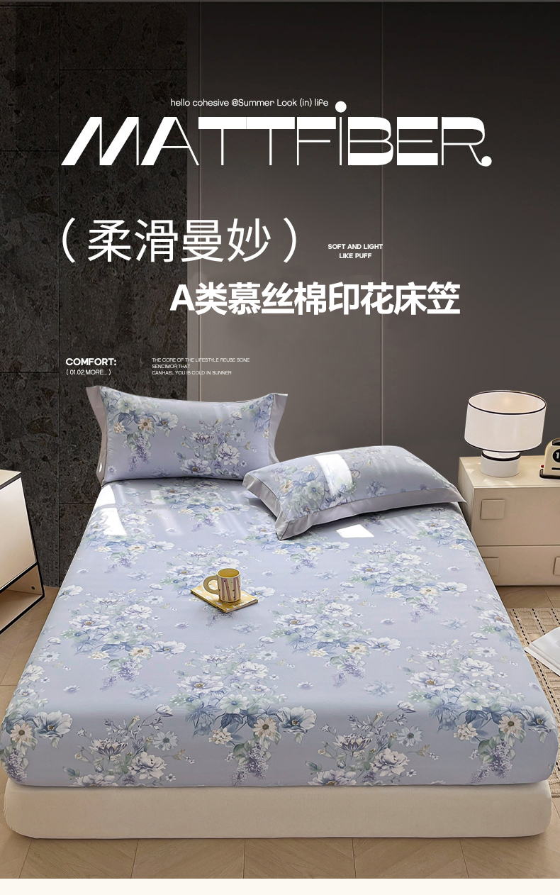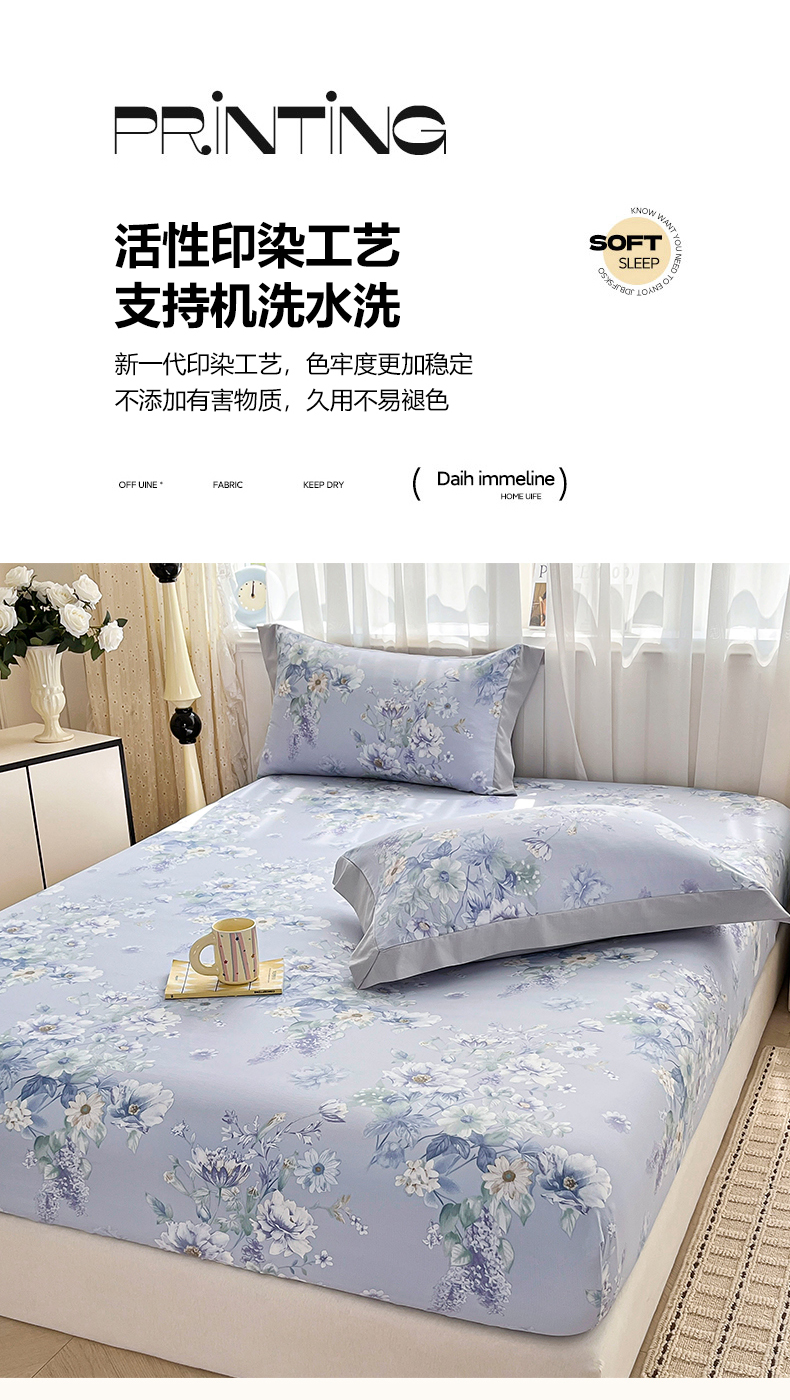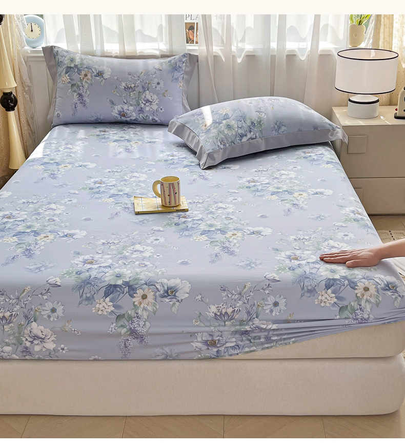 • 91家纺网 家纺一手货源 找家纺 慕木家纺 2026新款A类纯色印花慕丝棉床笠系列(抽空压缩可供跨境)(提供买家秀) 蓝庭叙