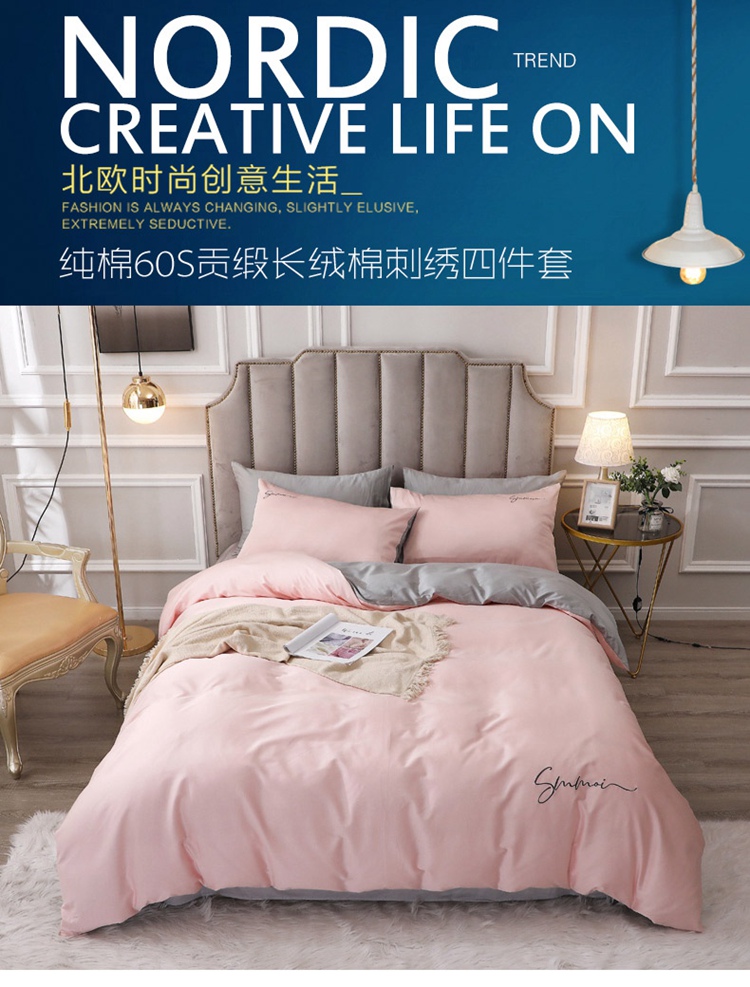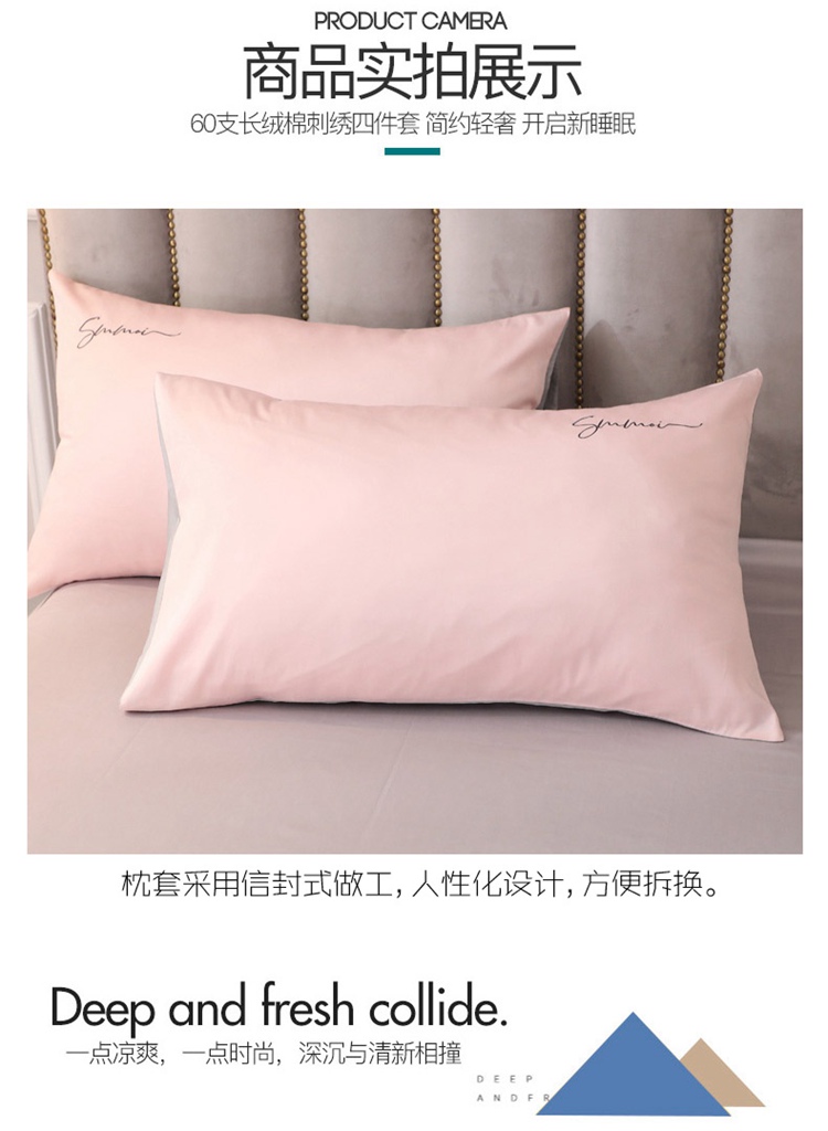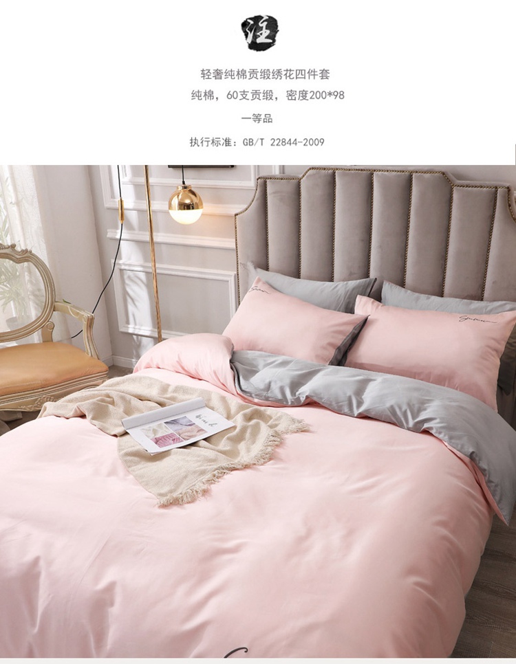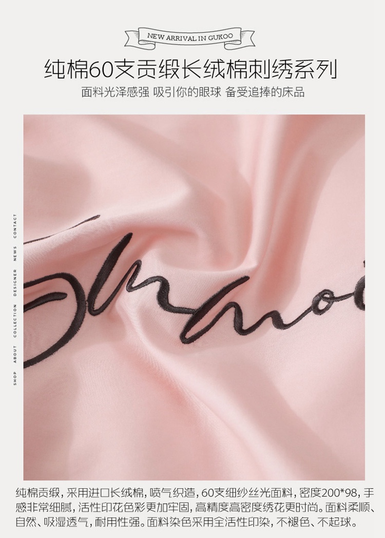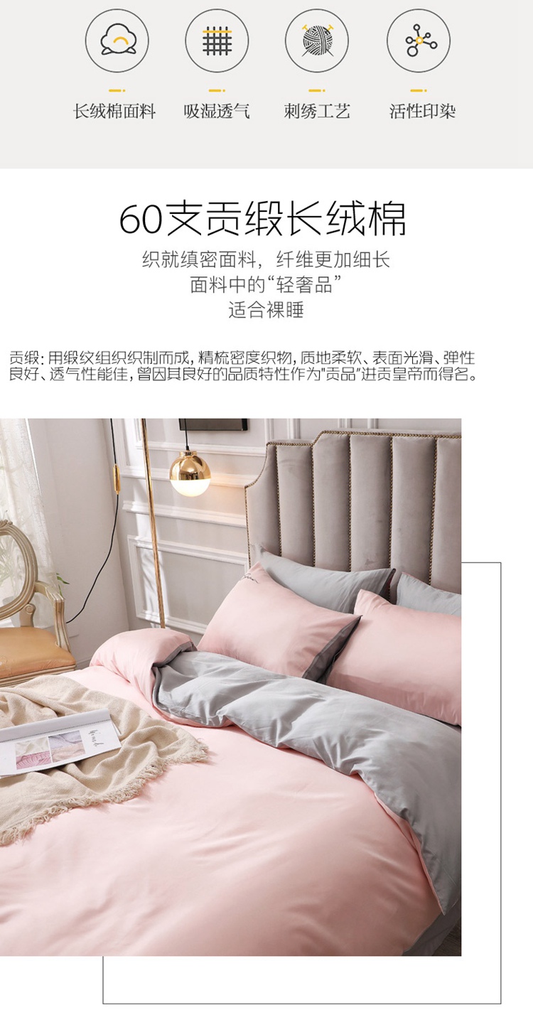 商品名称:2021新款纯色拼色纯棉全棉60S贡缎长绒棉绣花四件套 浅玉