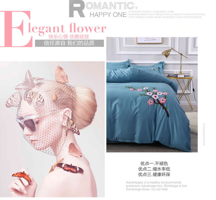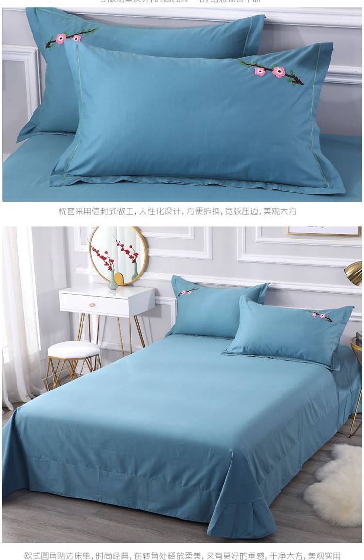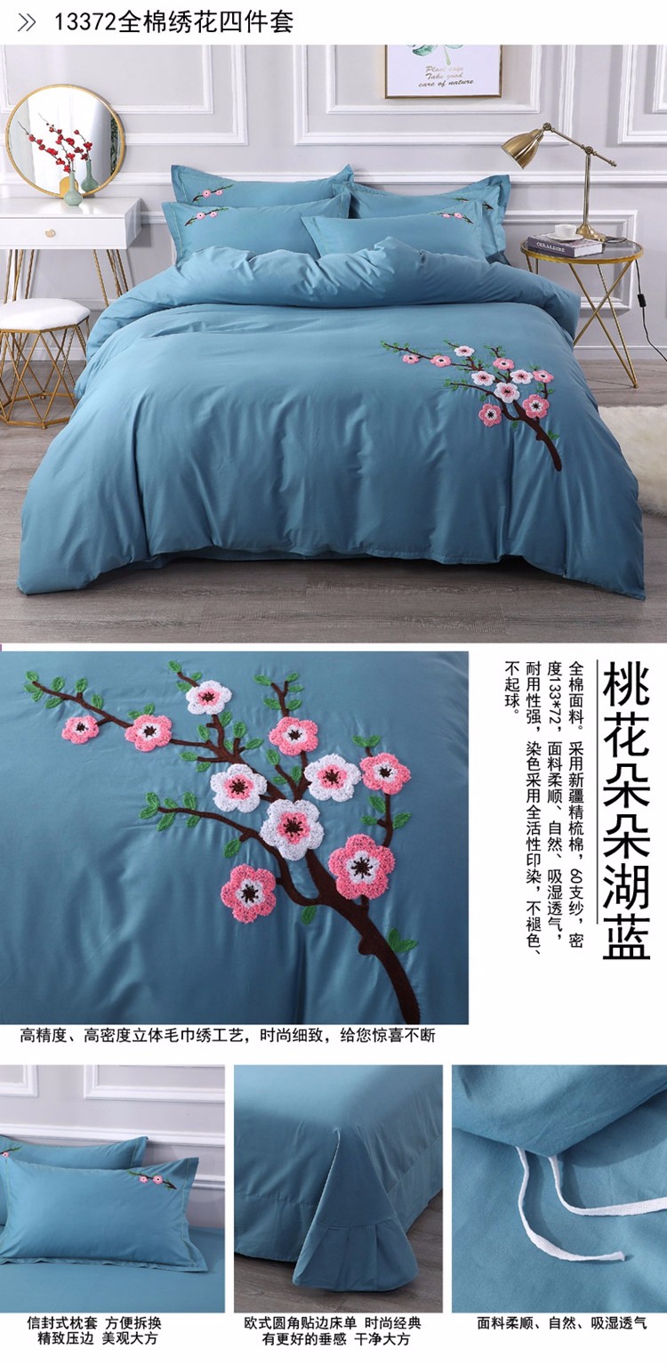 商品名称:2021新款全棉13372毛巾绣纯棉刺绣花四件套桃花朵朵湖蓝