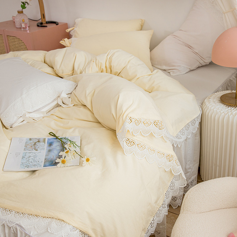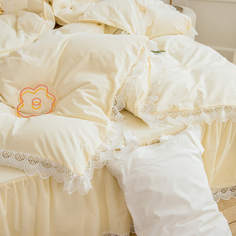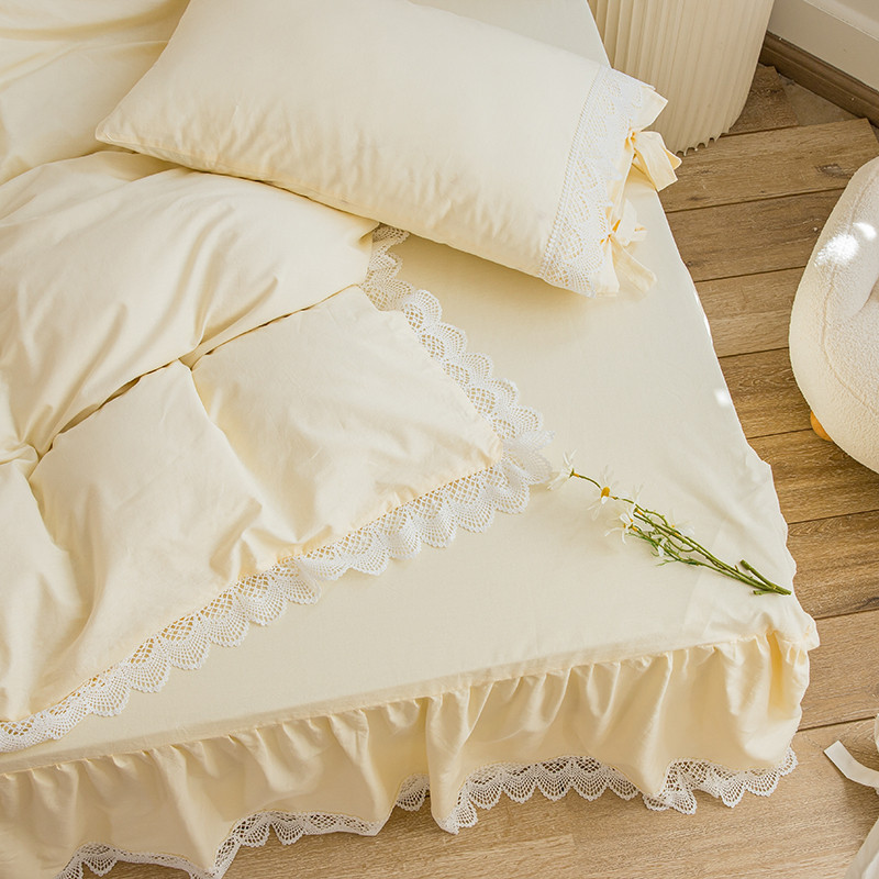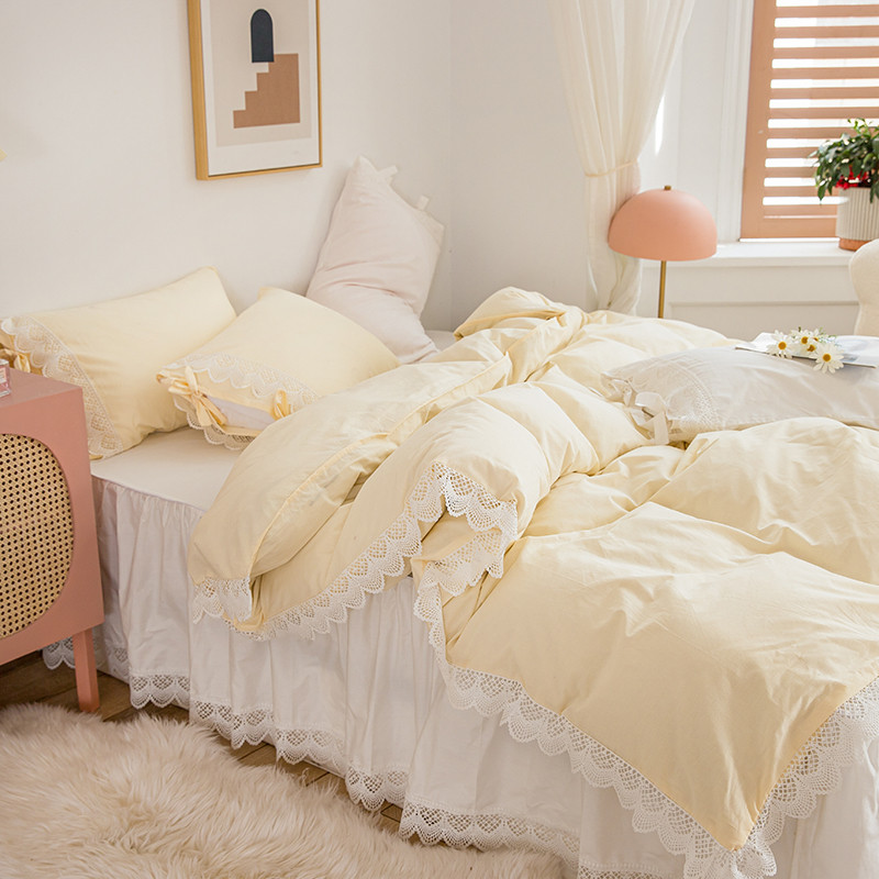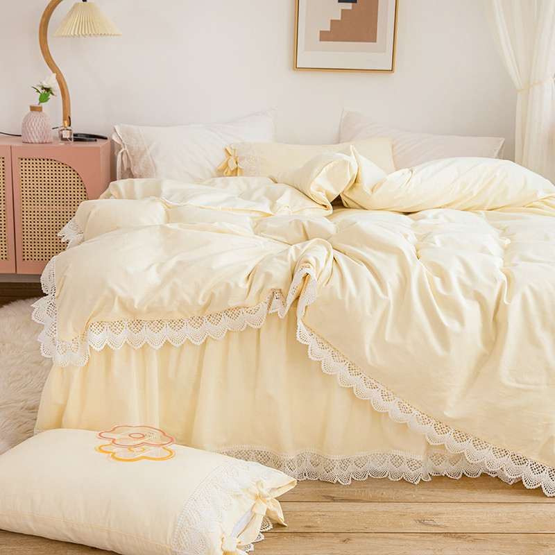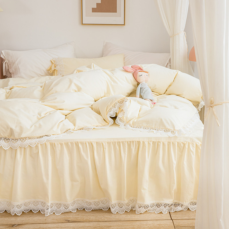 淑女公社2021新全棉喷气13376镂空花边床裙四件套 梨花-奶油黄