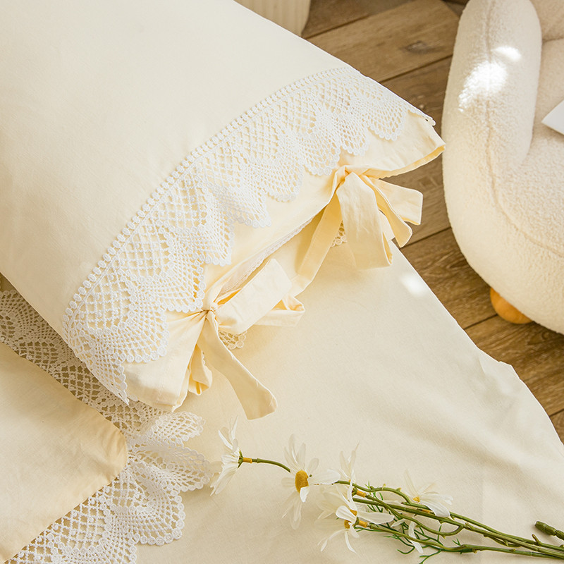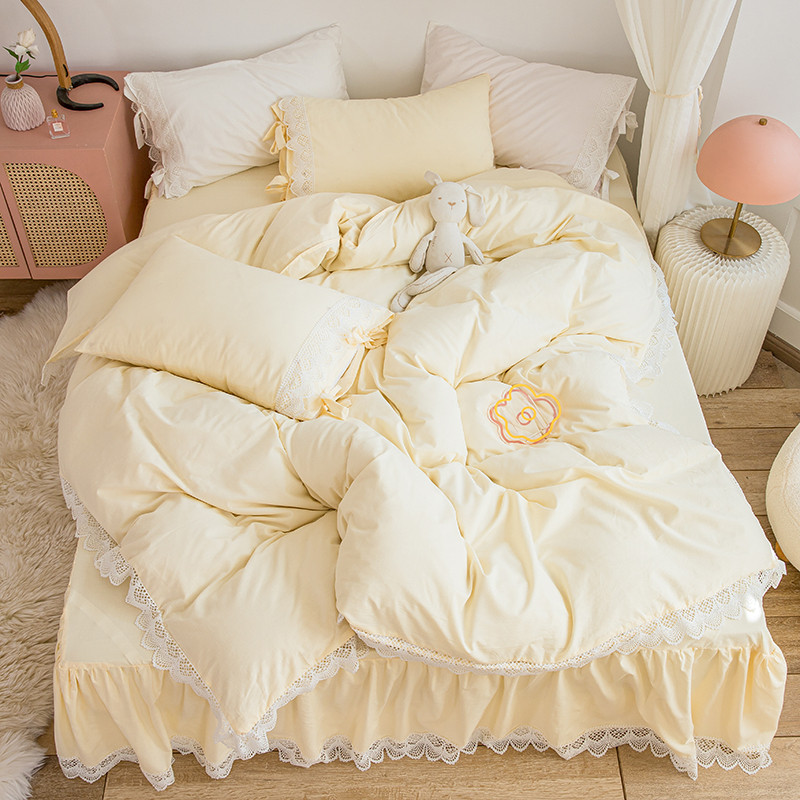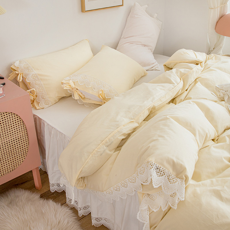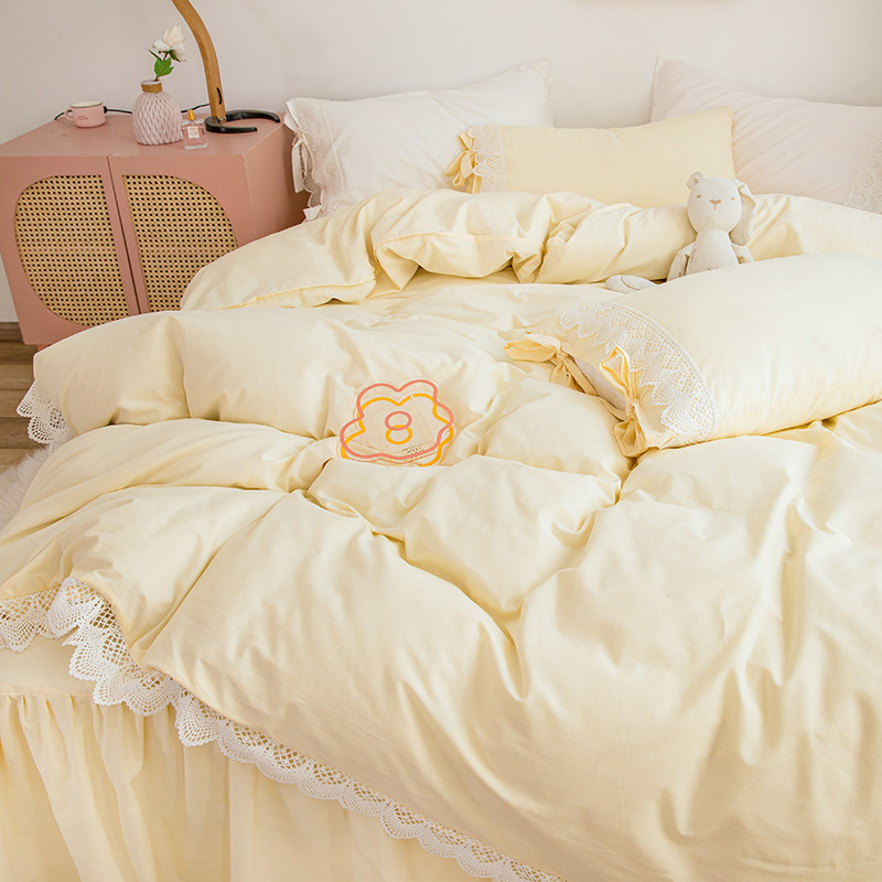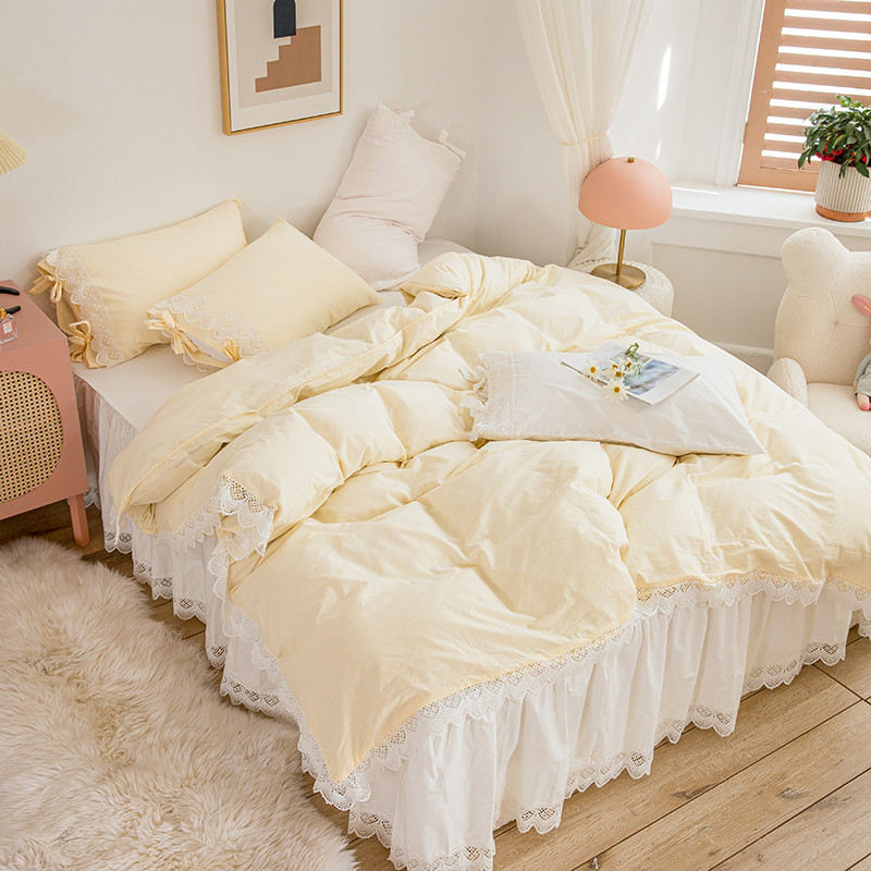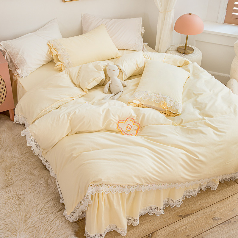 淑女公社2021新全棉喷气13376镂空花边床裙四件套 梨花-奶油黄