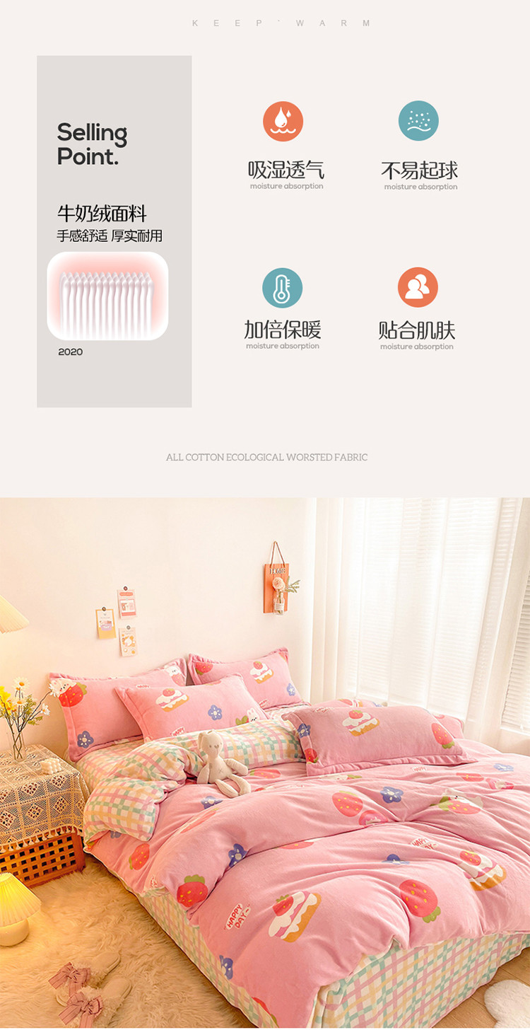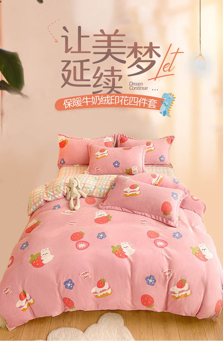 沐棉 2021新款卡通牛奶绒四件套新拍 草莓小兔