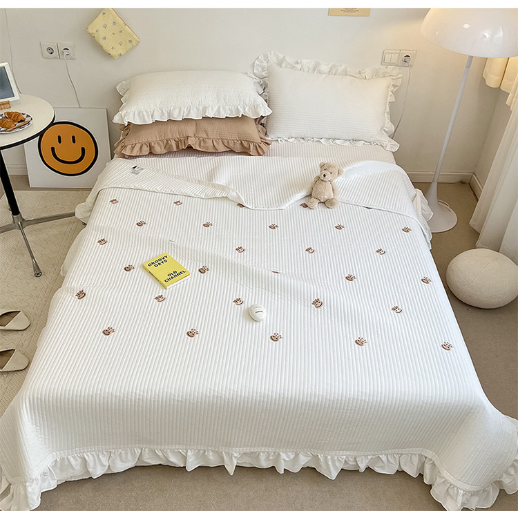 漫调ins风韩版荷叶边水洗全棉绗缝刺绣夏被/床盖三件套牛白