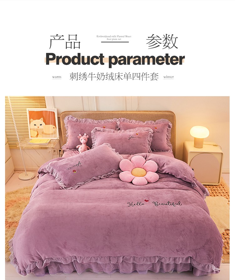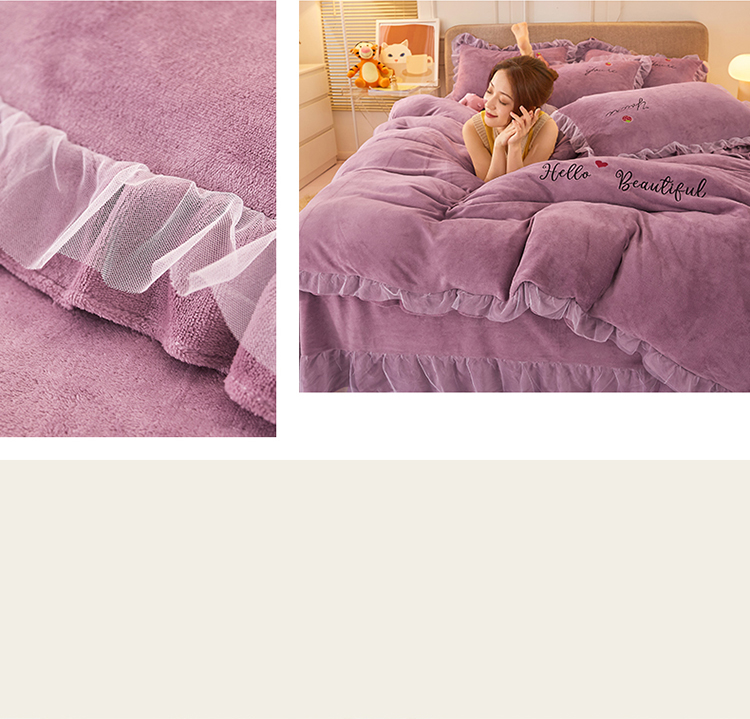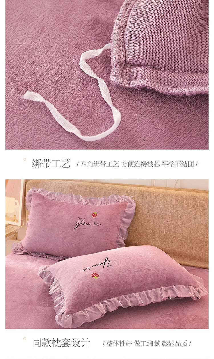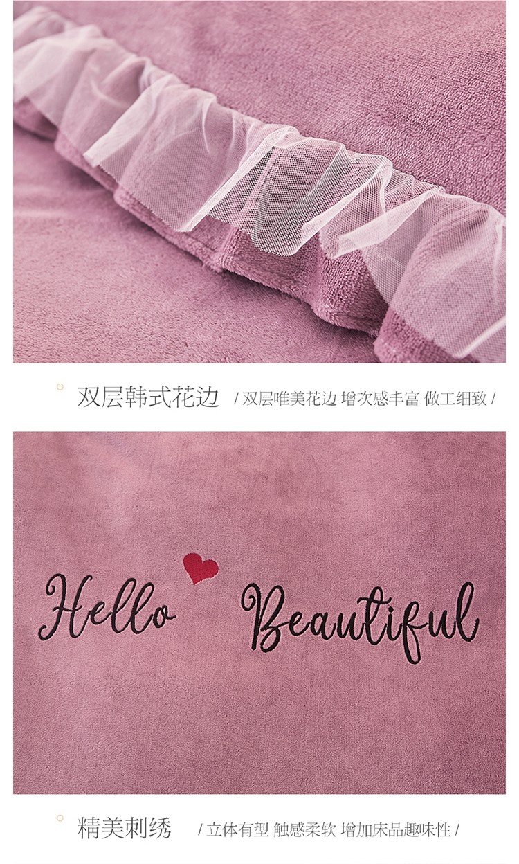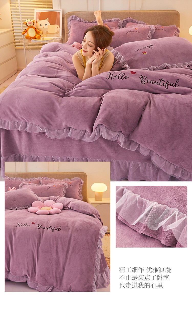 商品名称:找底底新款230g牛奶绒法莱绒刺绣蕾丝边床裙款四件套 雾紫