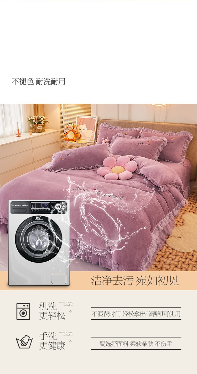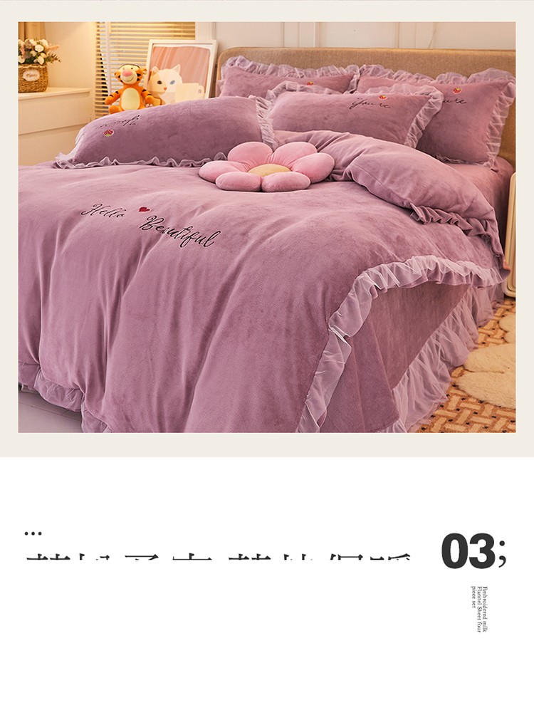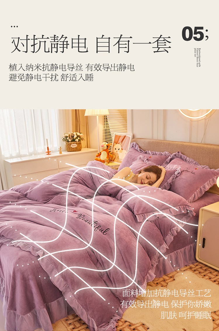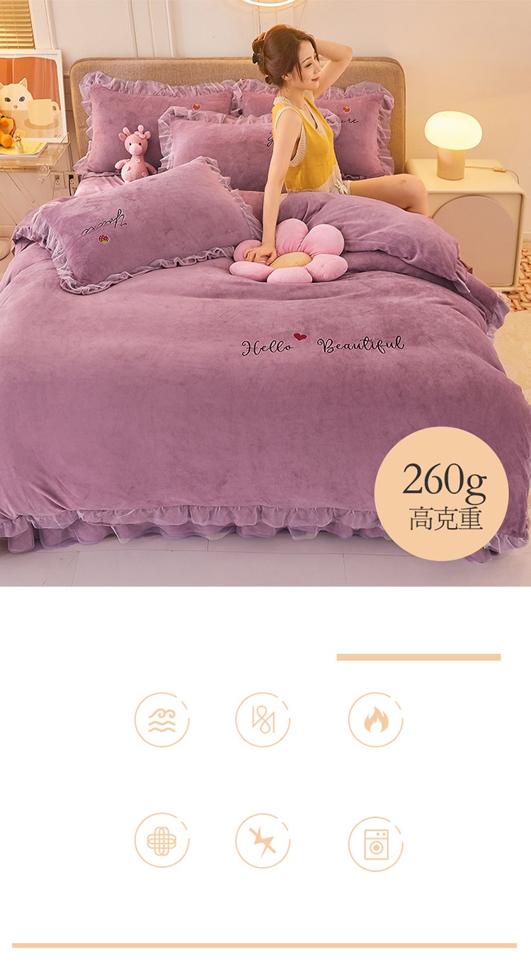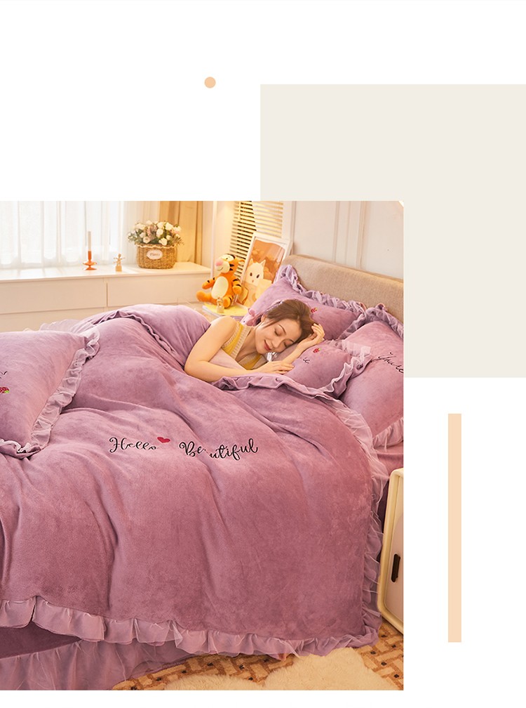 商品名称:找底底新款230g牛奶绒法莱绒刺绣蕾丝边床裙款四件套 雾紫