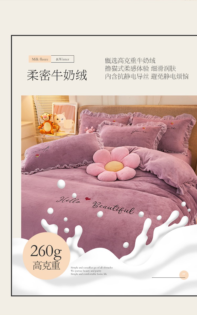 (总)找底底家纺 2025新款花边9-10斤牛奶绒床盖款四件套,花妖,梨花落,小樱桃,紫蔻