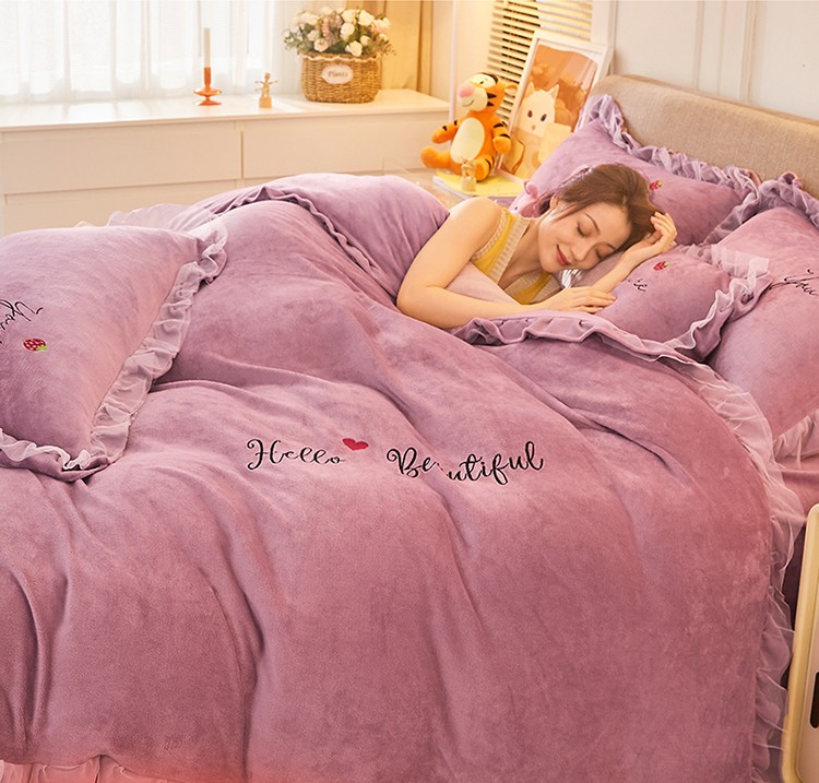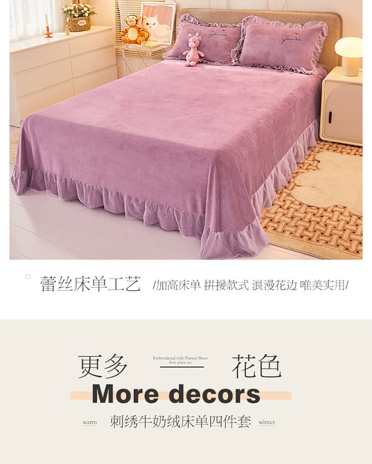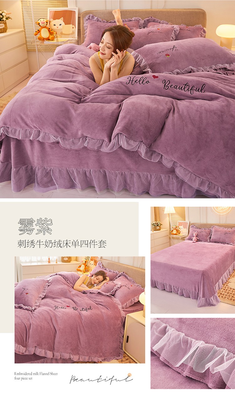 找底底新款230g牛奶绒法莱绒刺绣蕾丝边床裙款四件套 雾紫