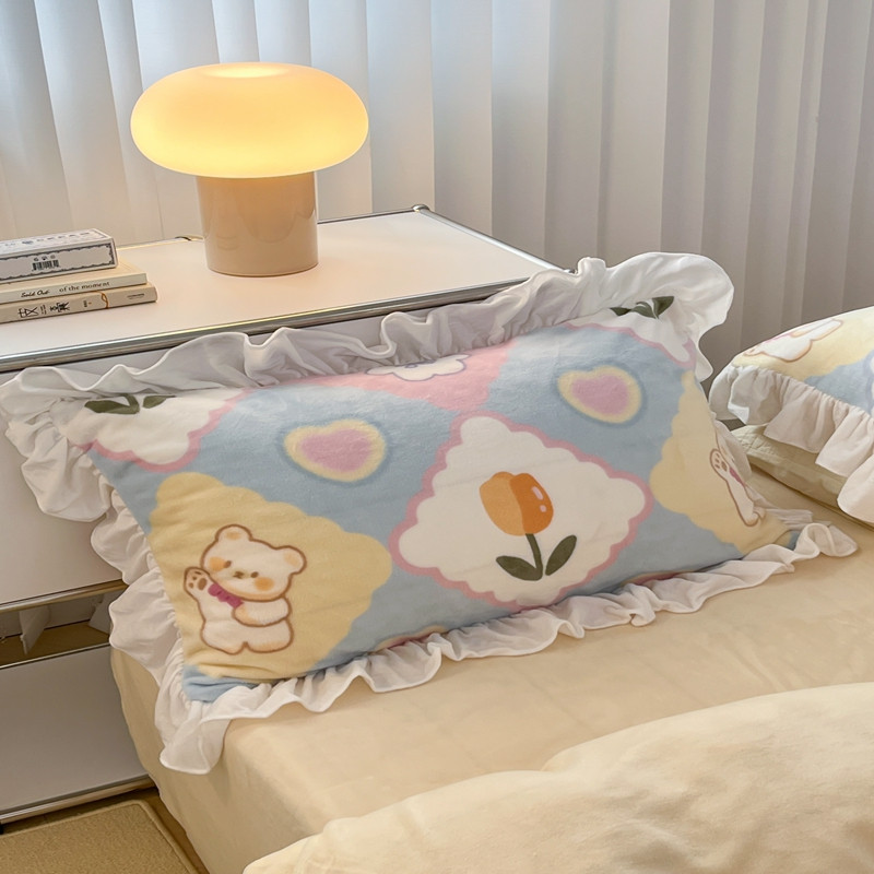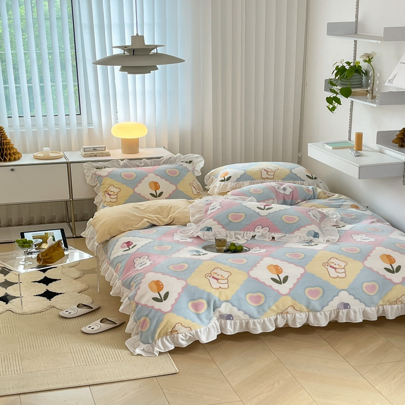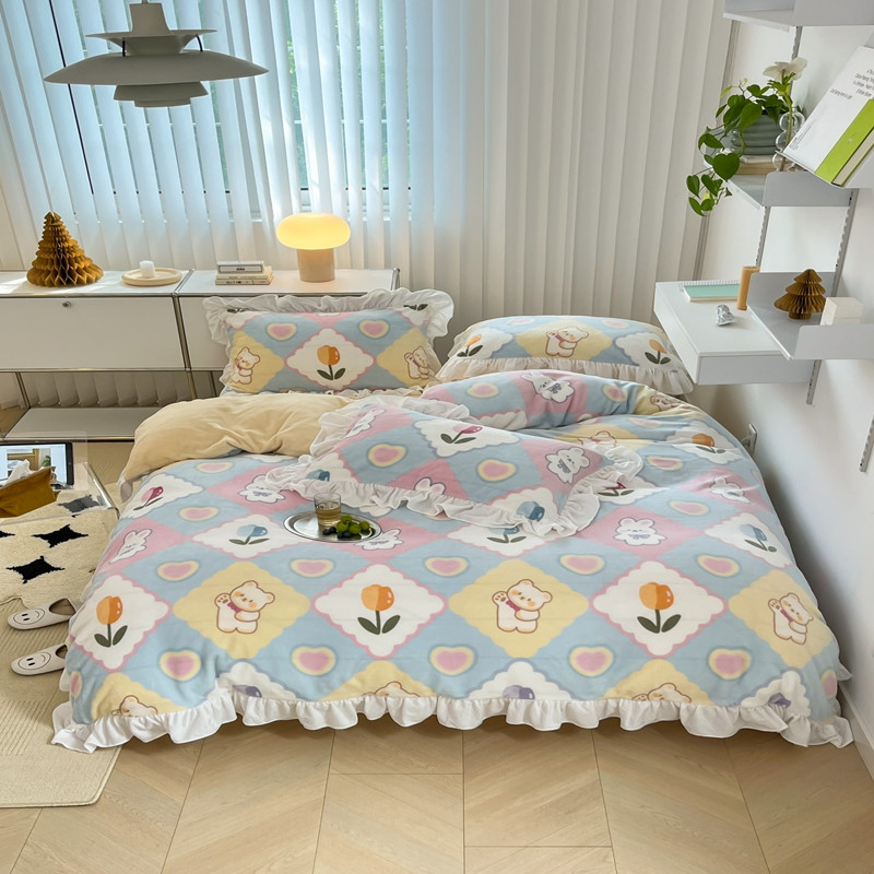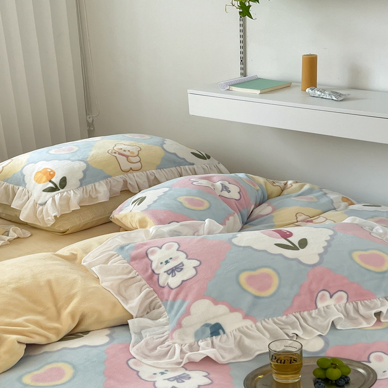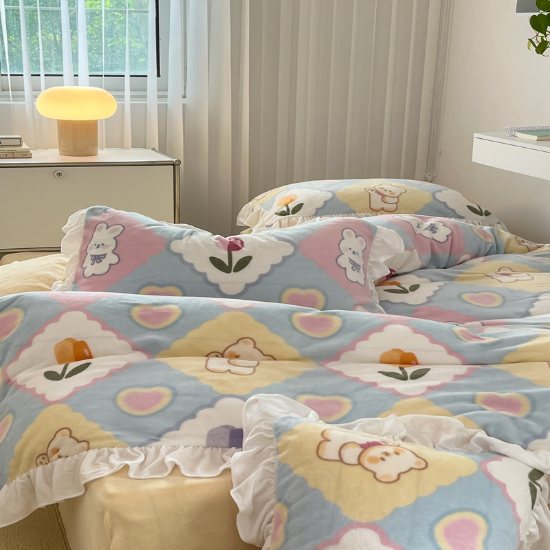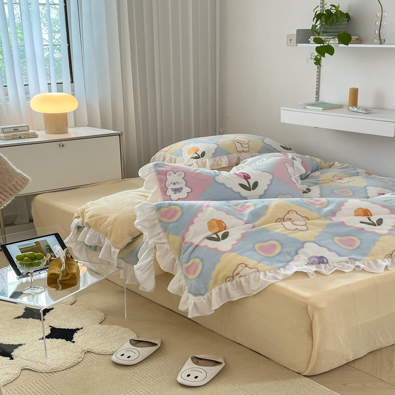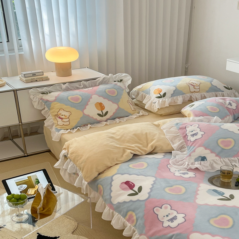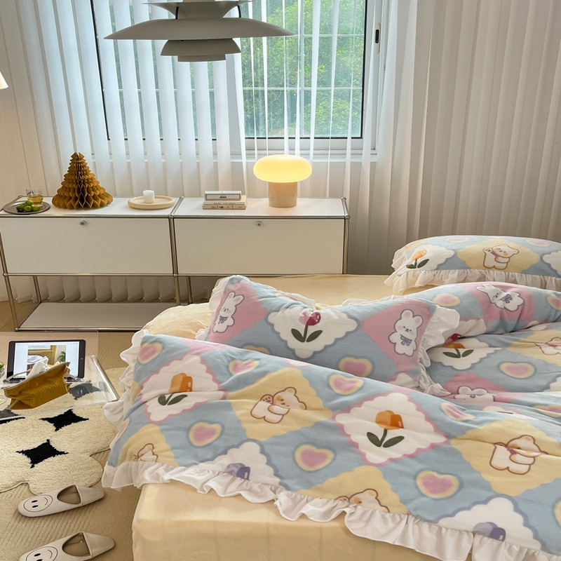 昔可 2022新款花边牛奶绒四件套 爱心菱格兔