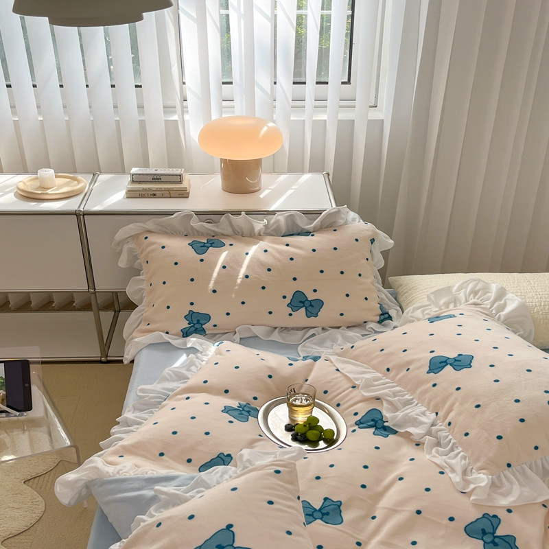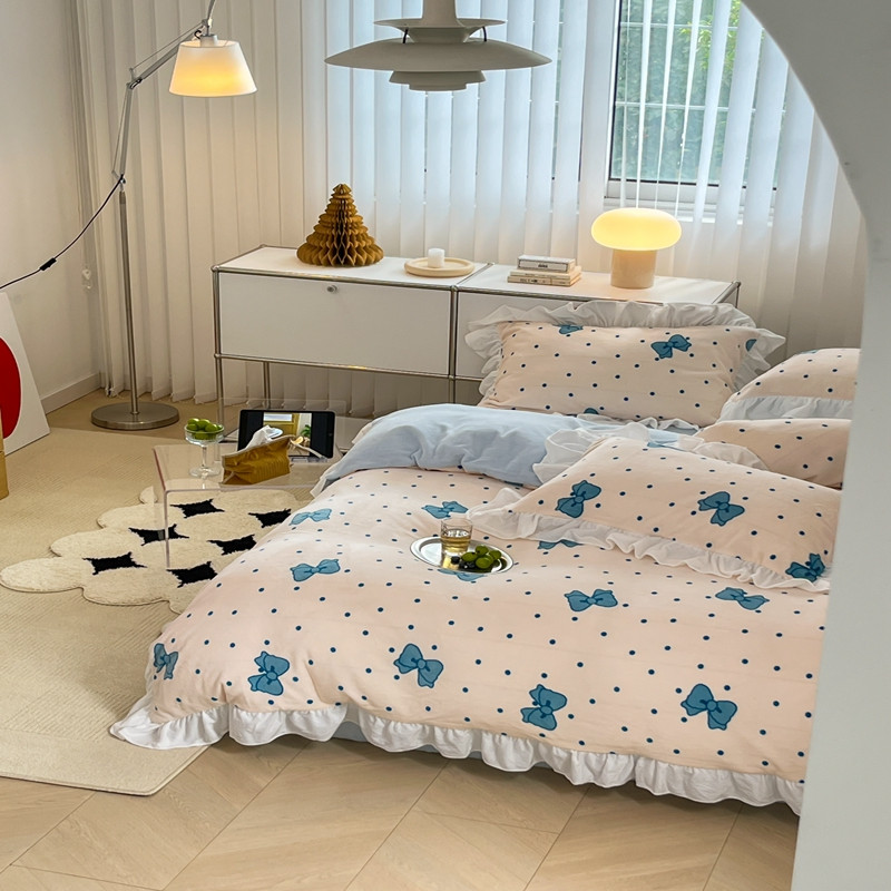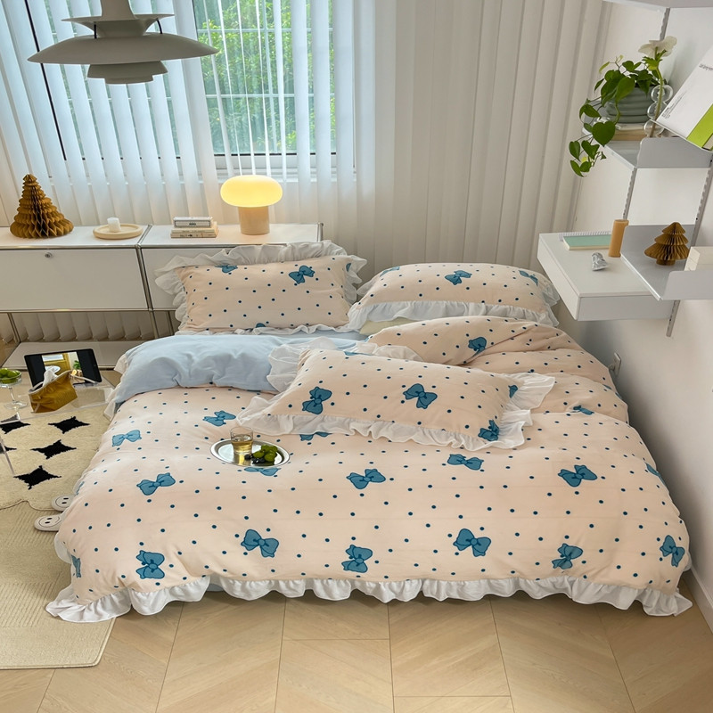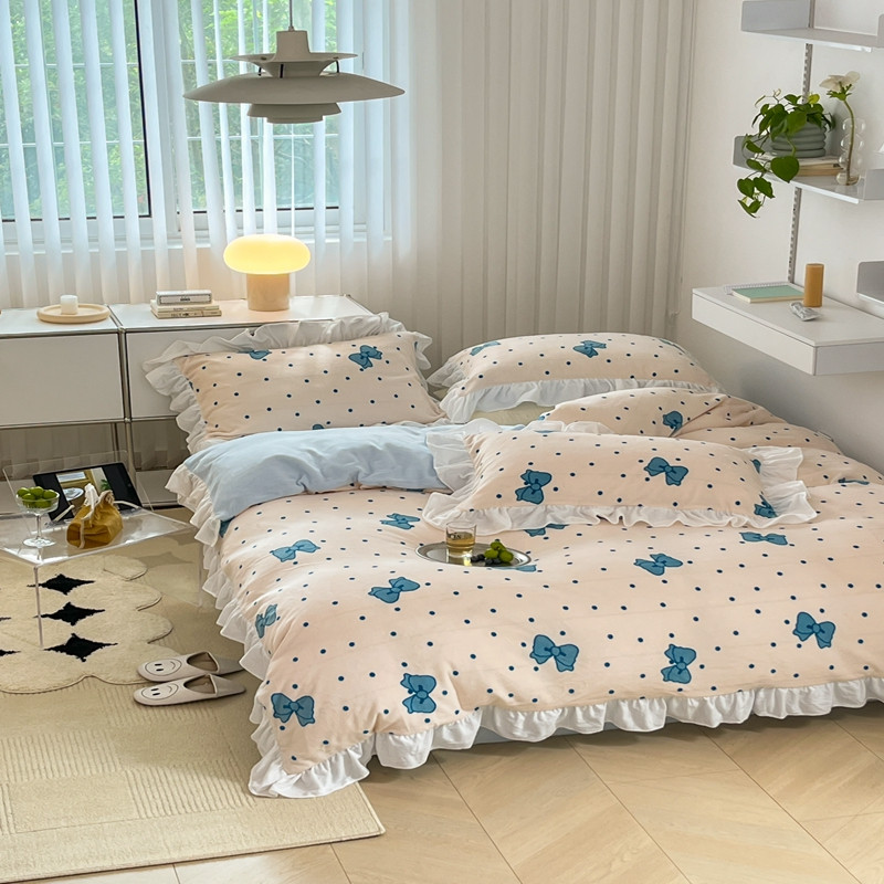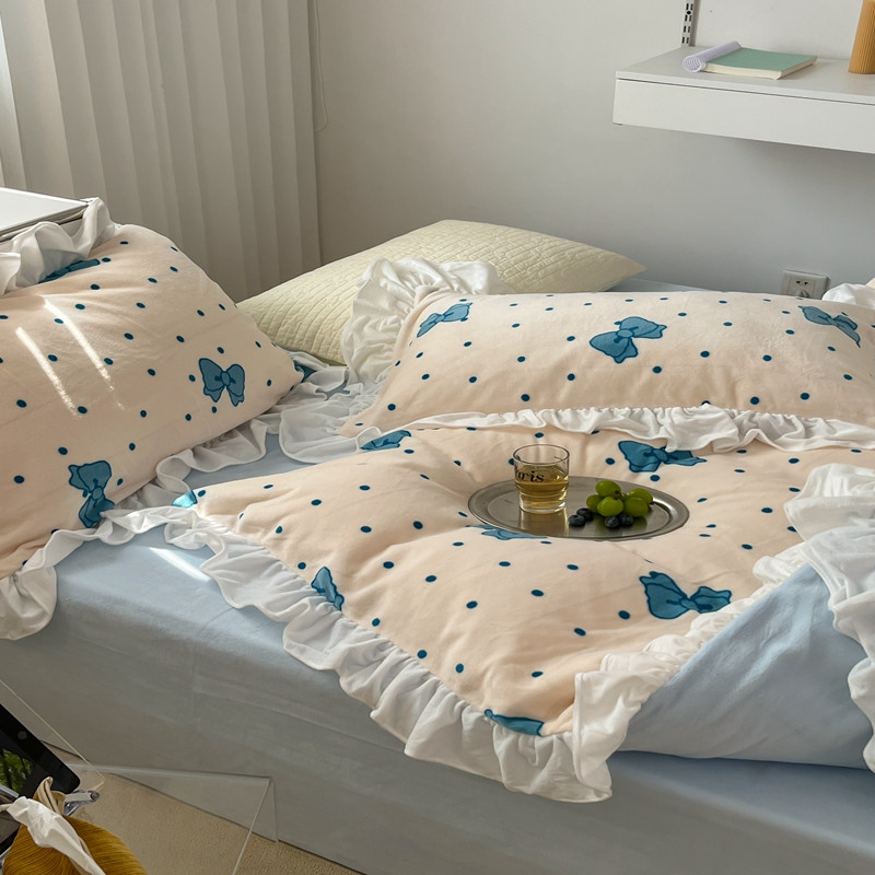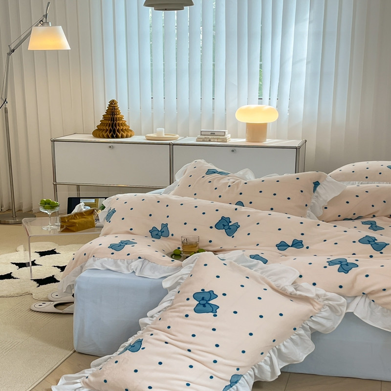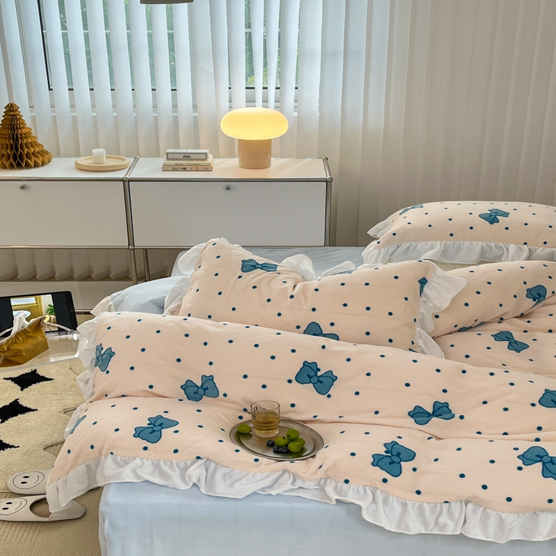 昔可 2022新款花边牛奶绒四件套 蓝波点蝴蝶结