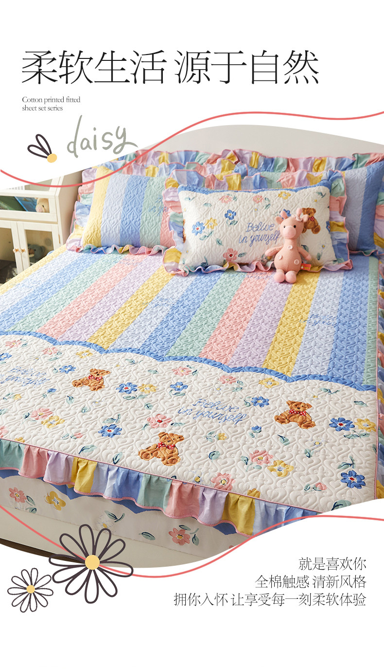 宜凡 2023新款全棉印花床笠三件套 假日小熊