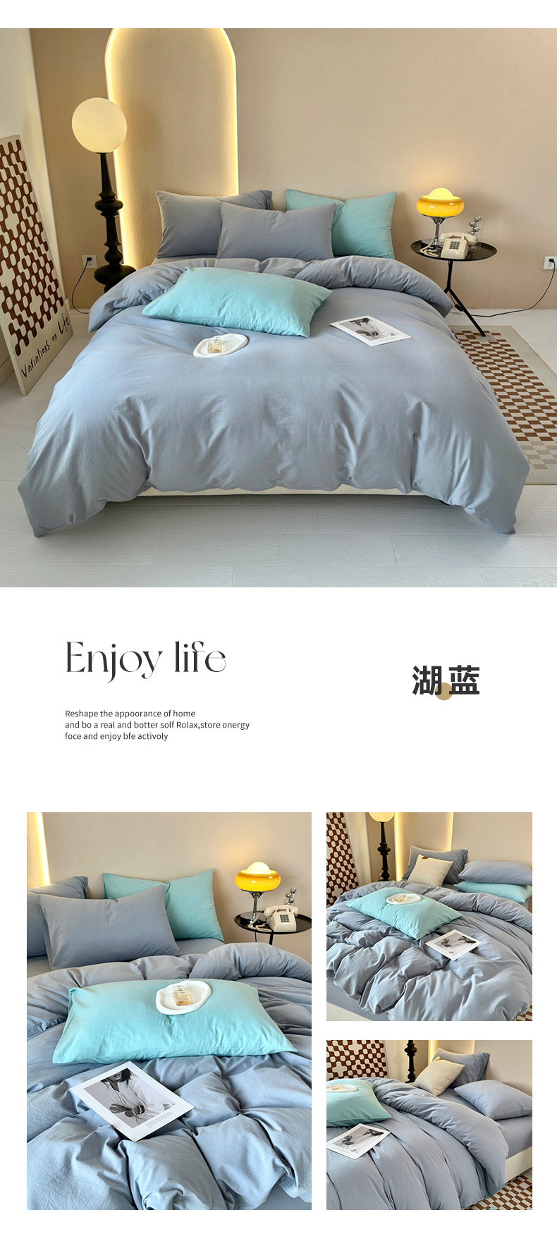 商品名称:三沁 2023新款直播爆款A类全棉纯棉水洗棉简约无印风纯色四件套 湖蓝