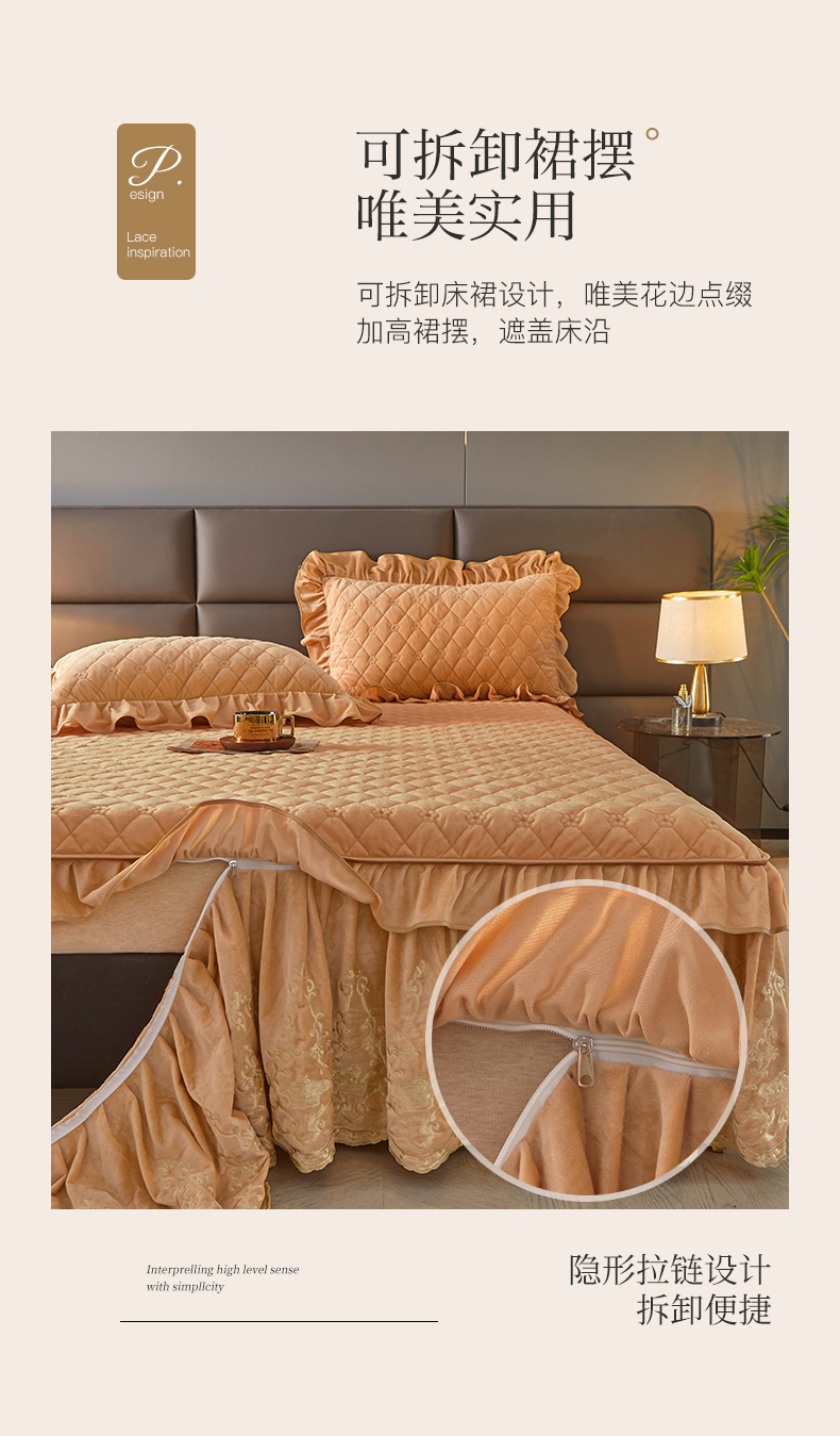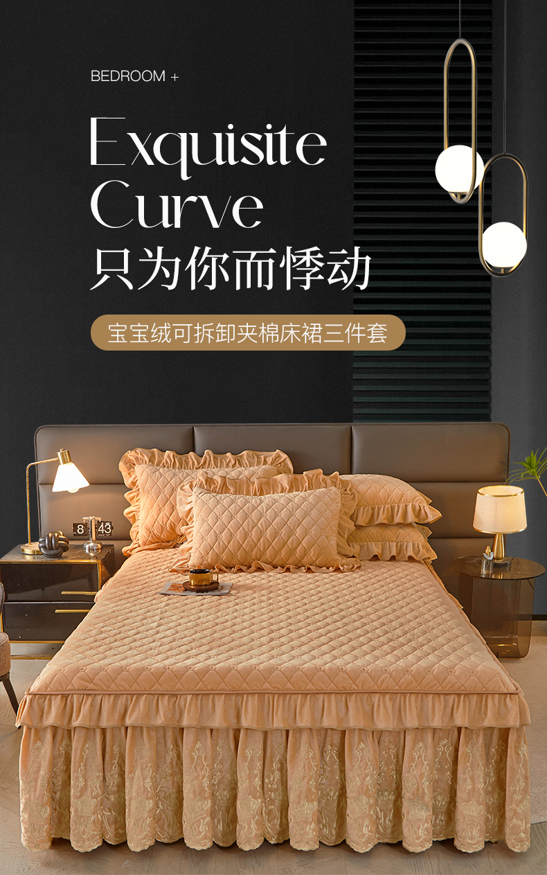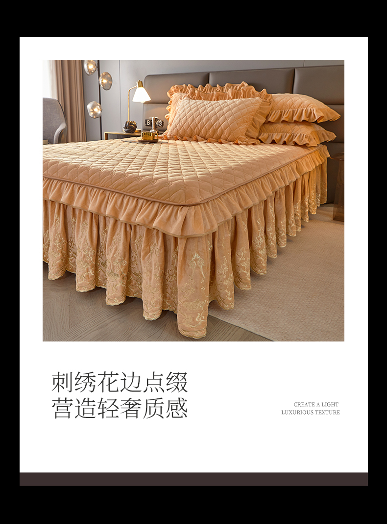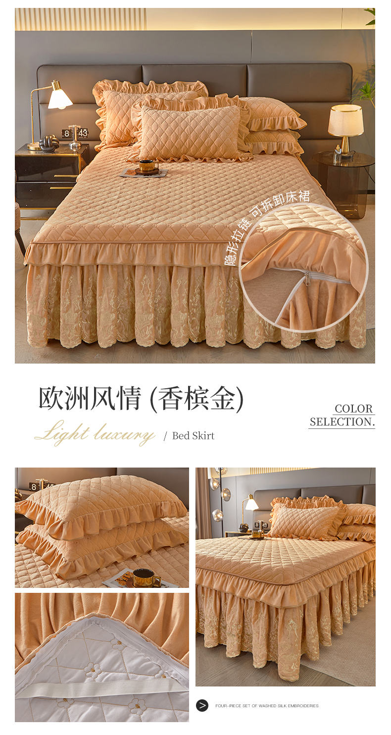 当前位置: 91家纺网 > 商品网购 > 床品套件 > 三件套 > 罗艺轩 2024新款欧洲风情宝宝绒可拆卸夹棉床裙三件套 香槟金