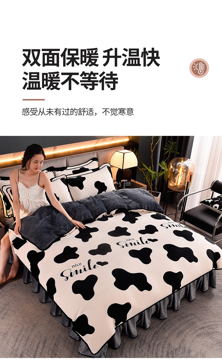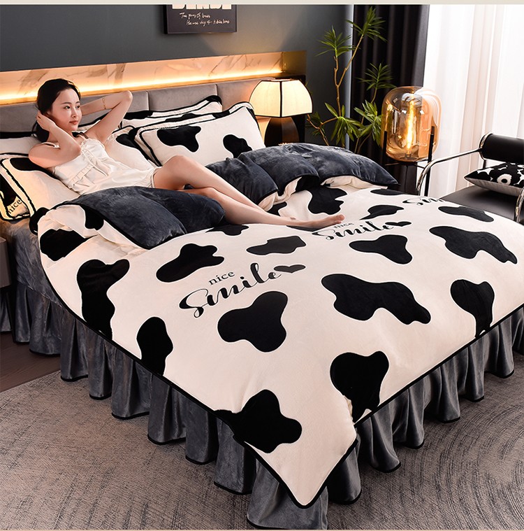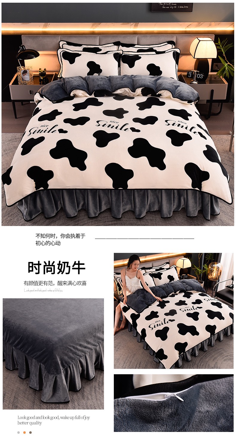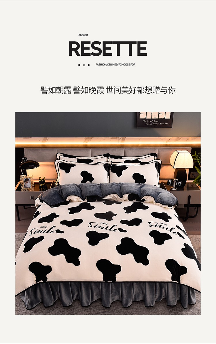 商品名称:盈超2023新款A类高克重印花牛奶绒金貂绒床裙款保暖绒四件套 时尚奶牛