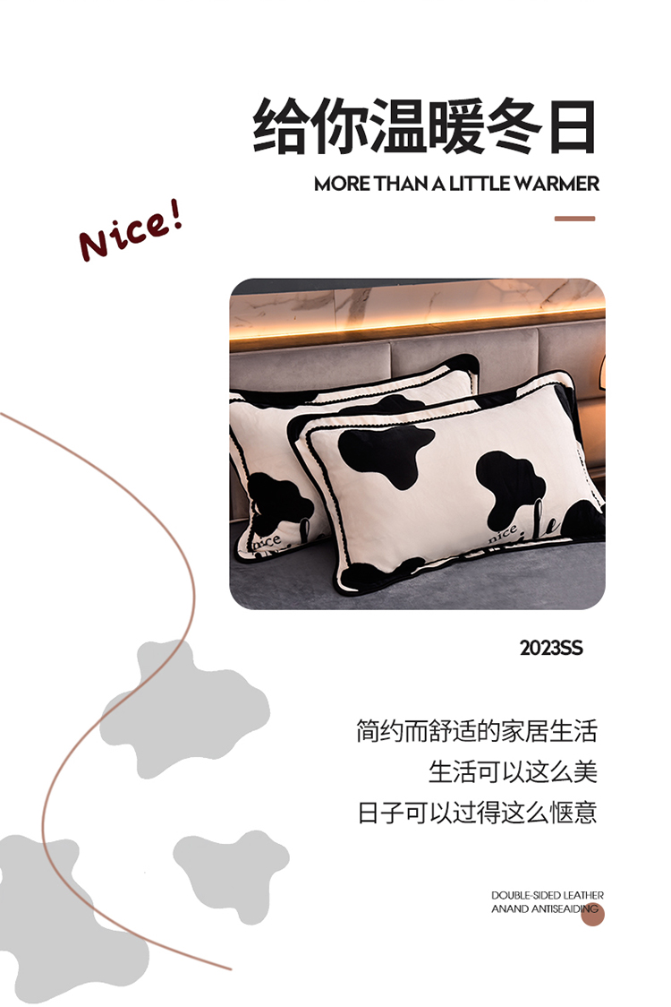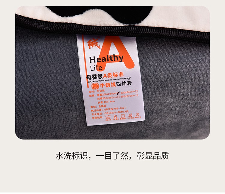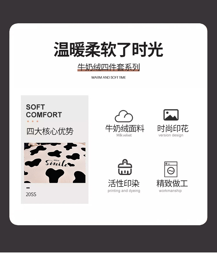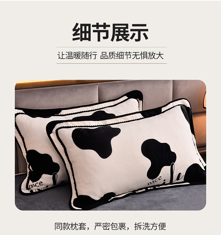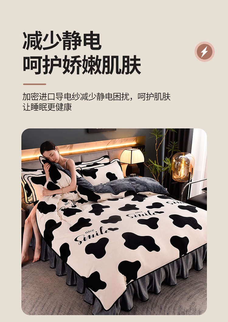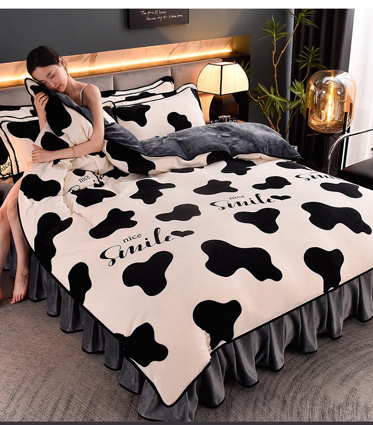 商品名称:盈超2023新款A类高克重印花牛奶绒金貂绒床裙款保暖绒四件套 时尚奶牛