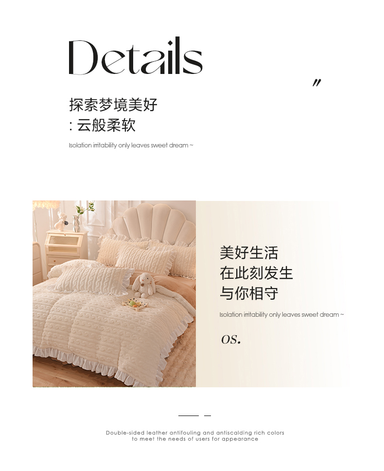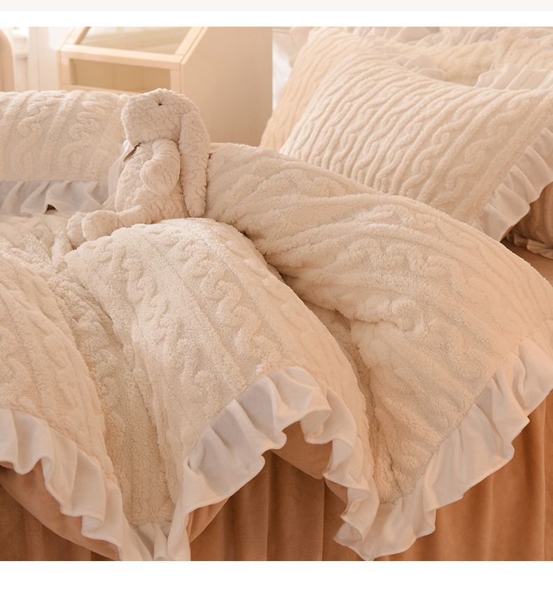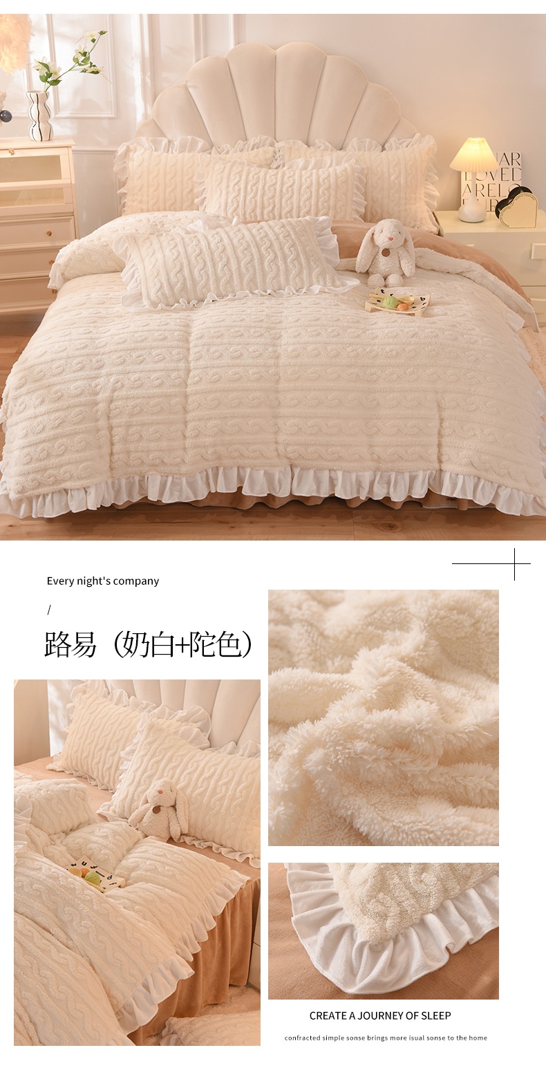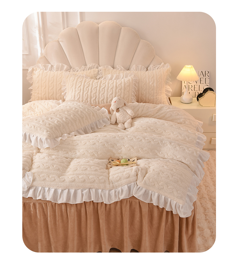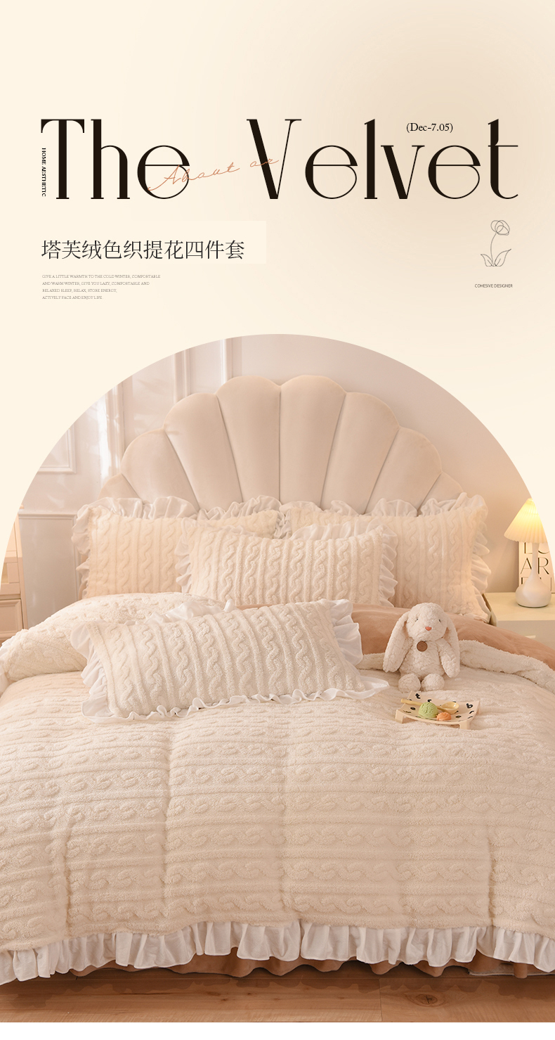 当前位置: 91家纺网 > 商品网购 > 床品套件 > 四件套 > 韩约2023新款塔芙绒色织提花牛奶绒四件套-床裙款 路易(奶白+陀色)