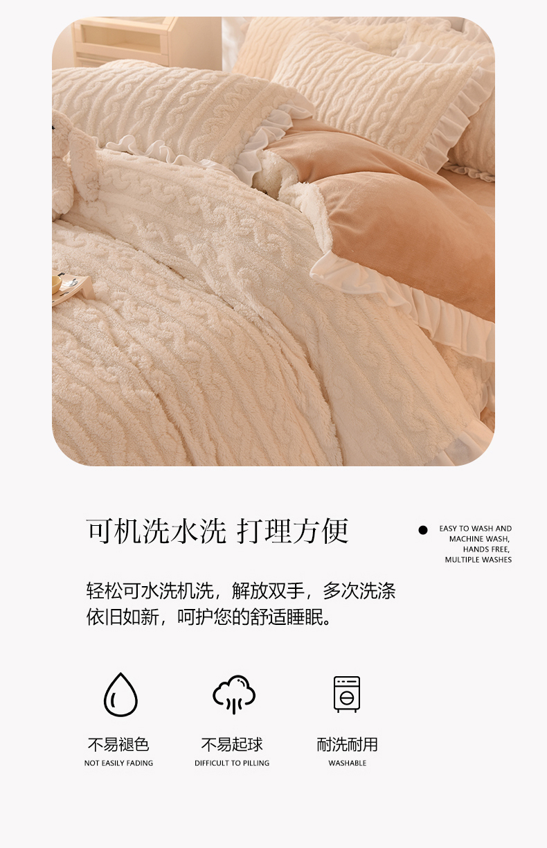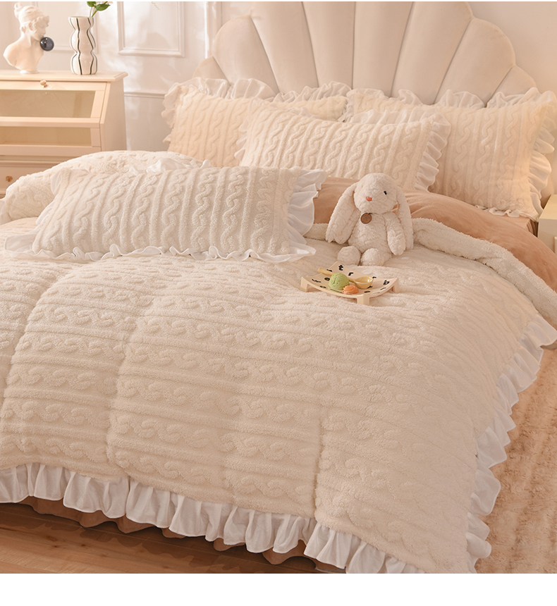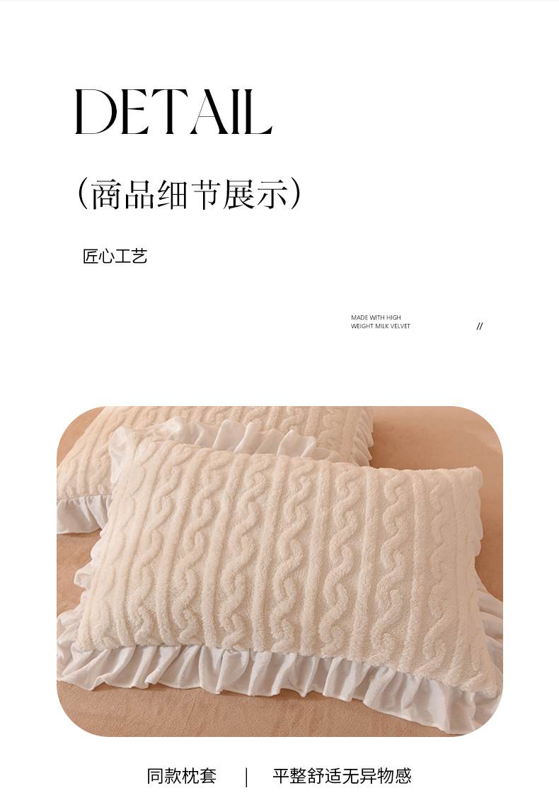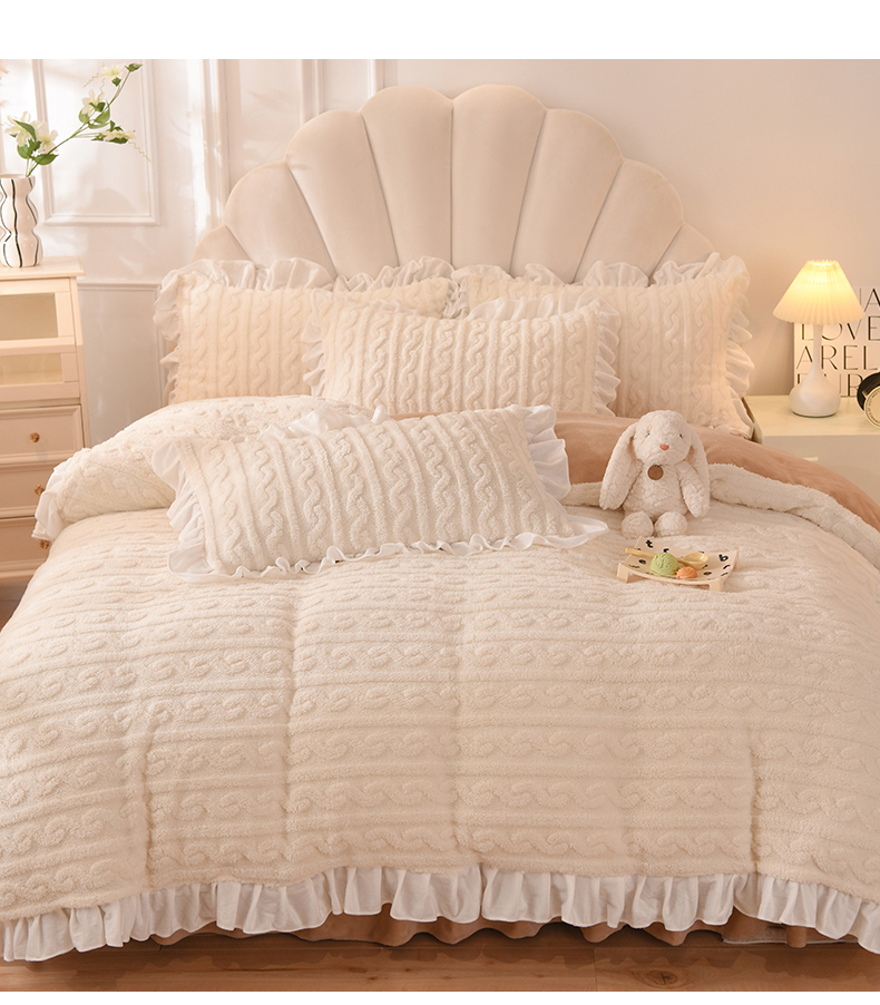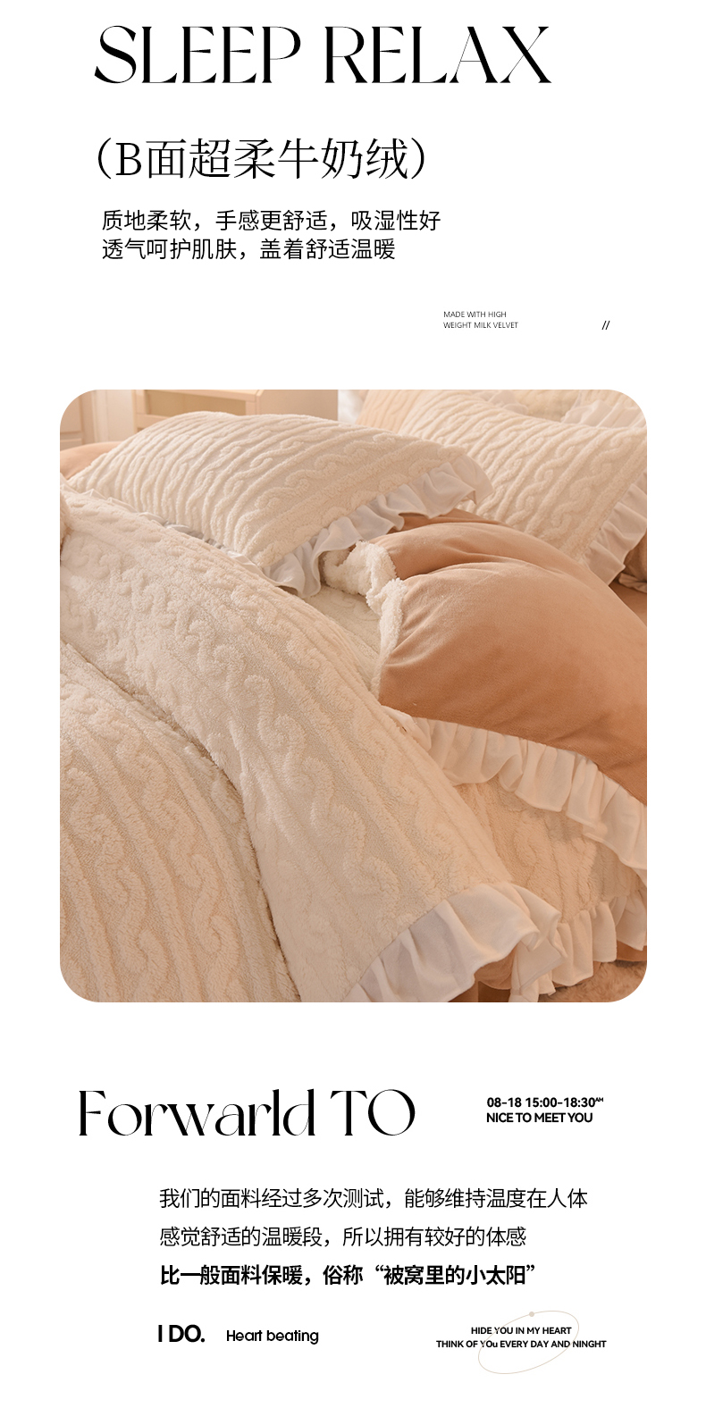 当前位置: 91家纺网 > 商品网购 > 床品套件 > 四件套 > 韩约2023新款塔芙绒色织提花牛奶绒四件套-床裙款 路易(奶白+陀色)