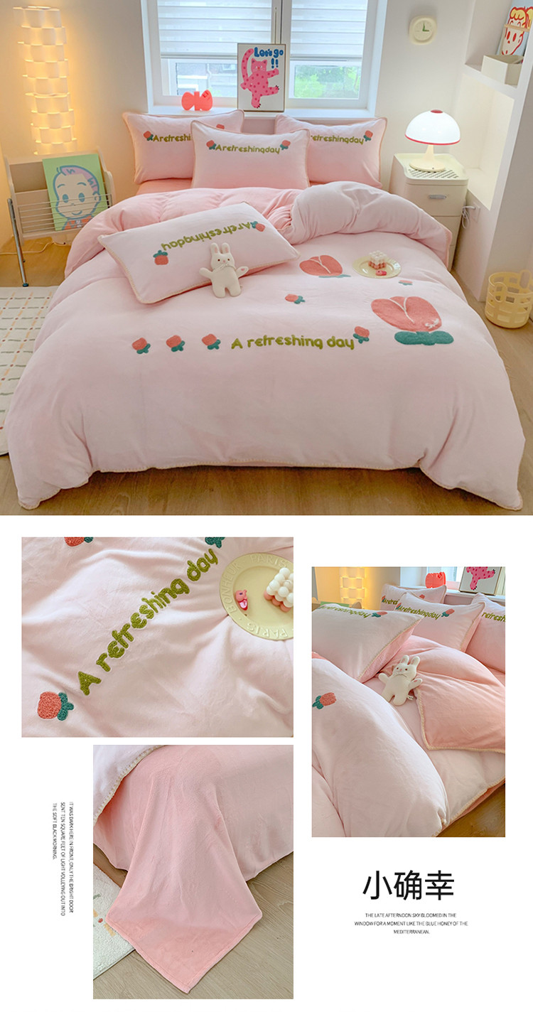 当前位置: 91家纺网 > 商品网购 > 床品套件 > 四件套 > 牛奶绒四件套 > 蜜柚 2024新款牛奶绒贝壳边毛巾绣四件套 小确幸