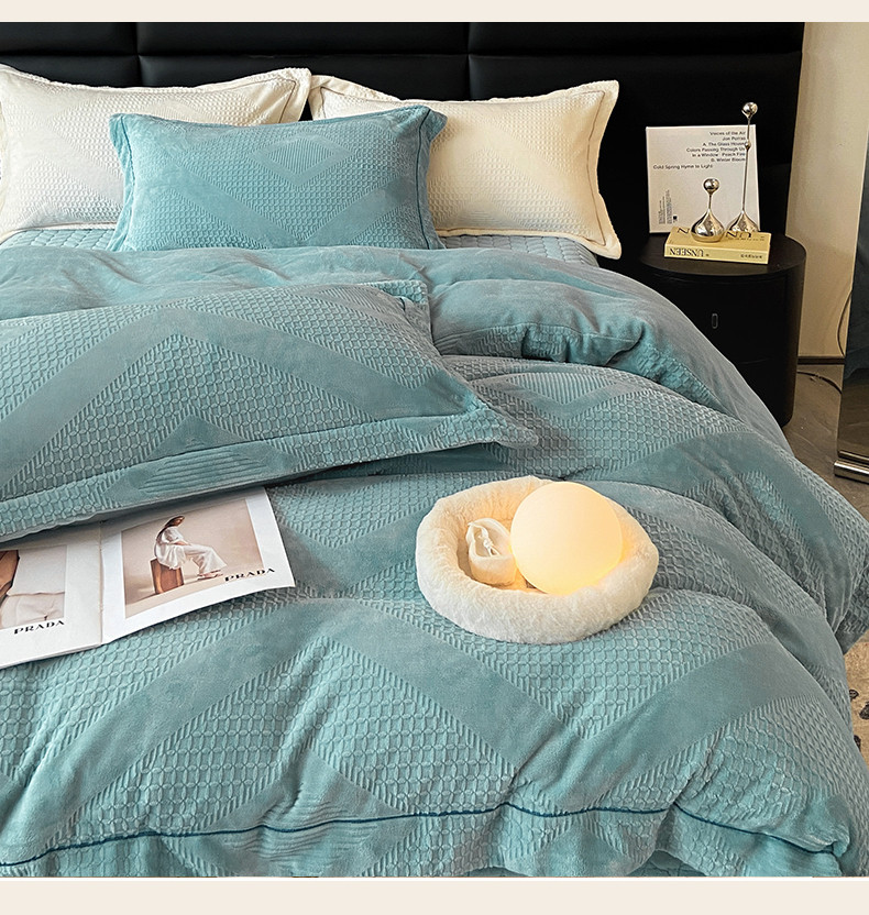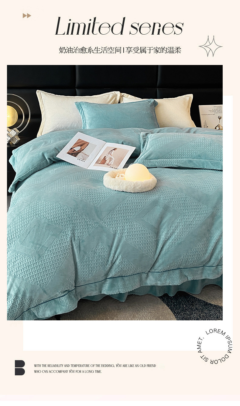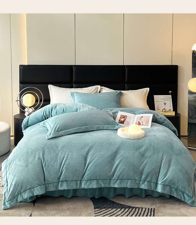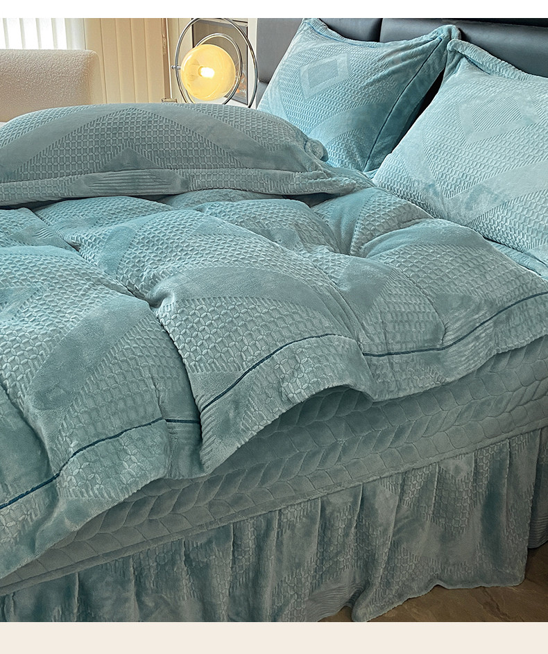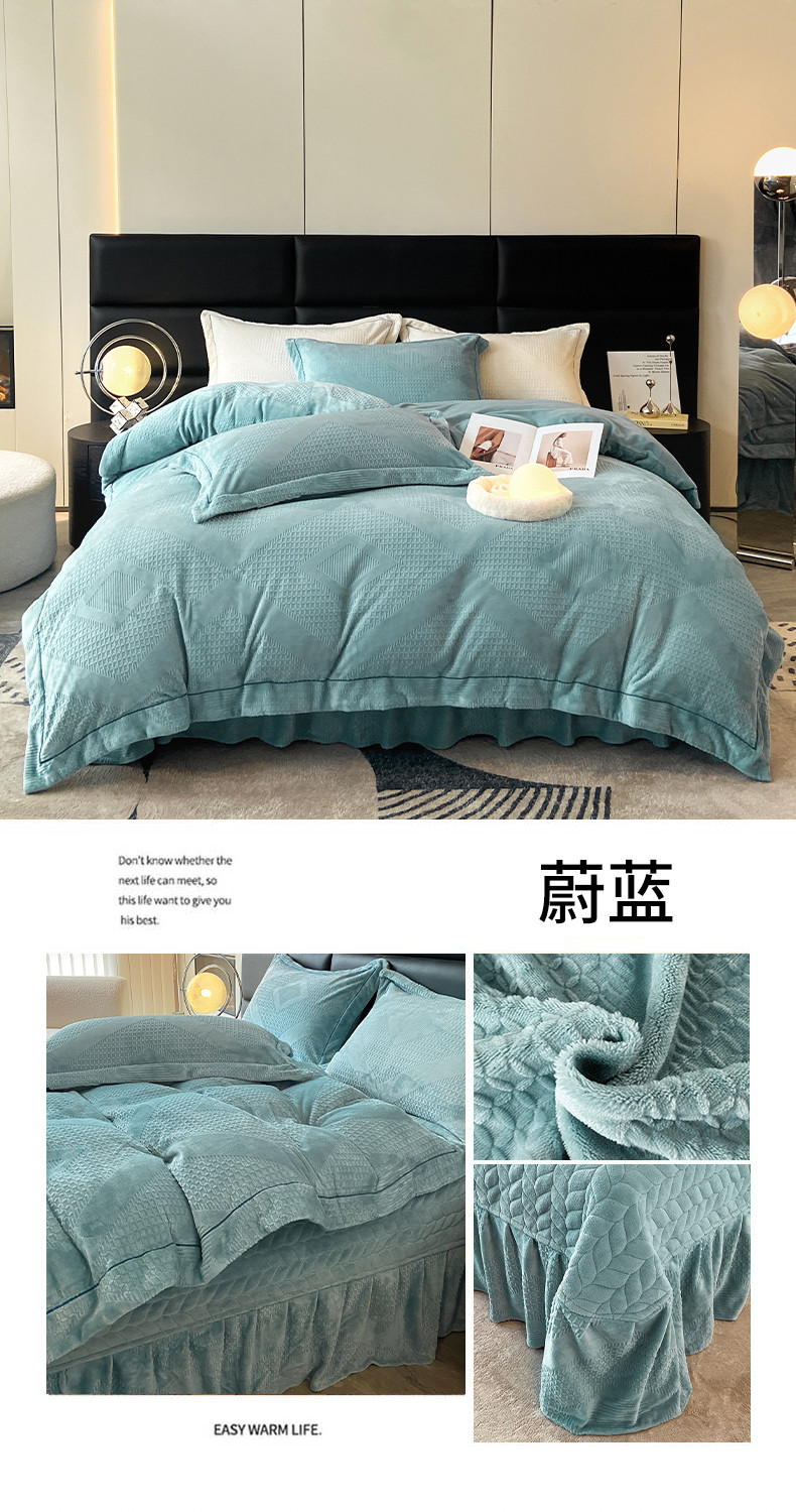 美伦美焕2023新款纯色立体雕花牛奶绒床盖四件套床裙款式 蔚蓝