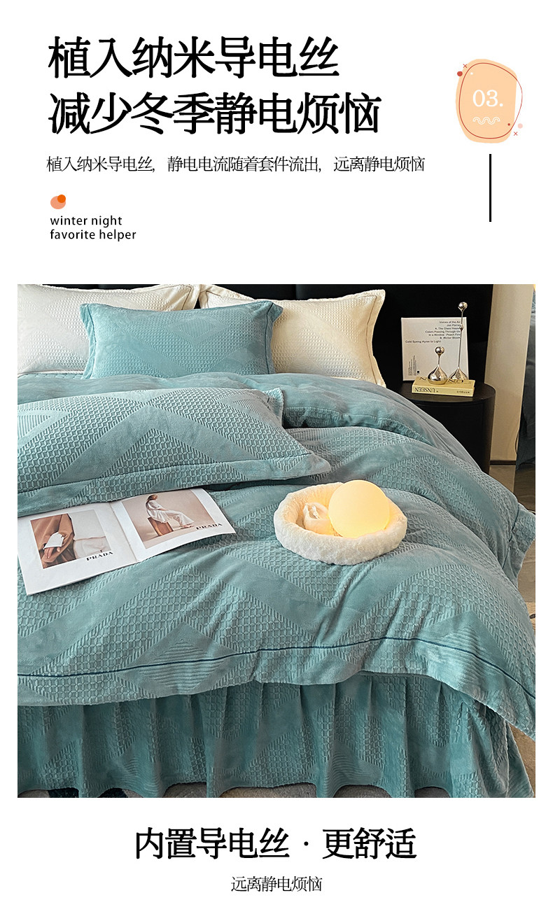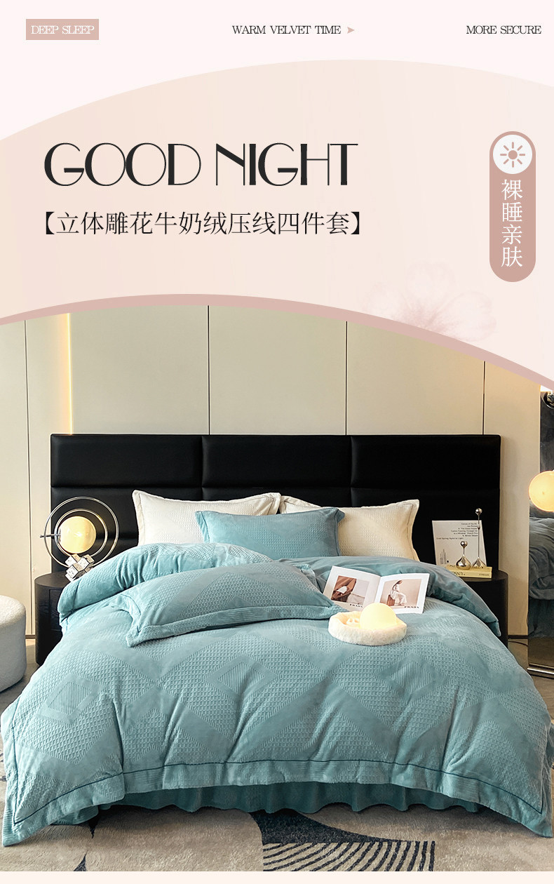 商品名称:美伦美焕2023新款纯色立体雕花牛奶绒床盖四件套床裙款式 蔚蓝