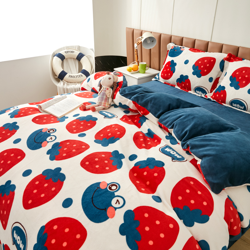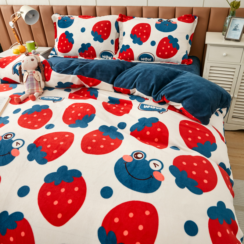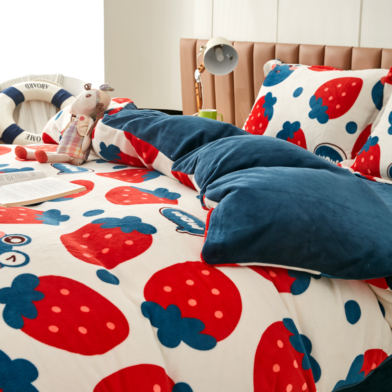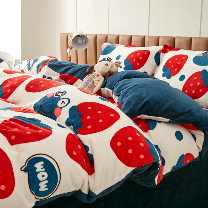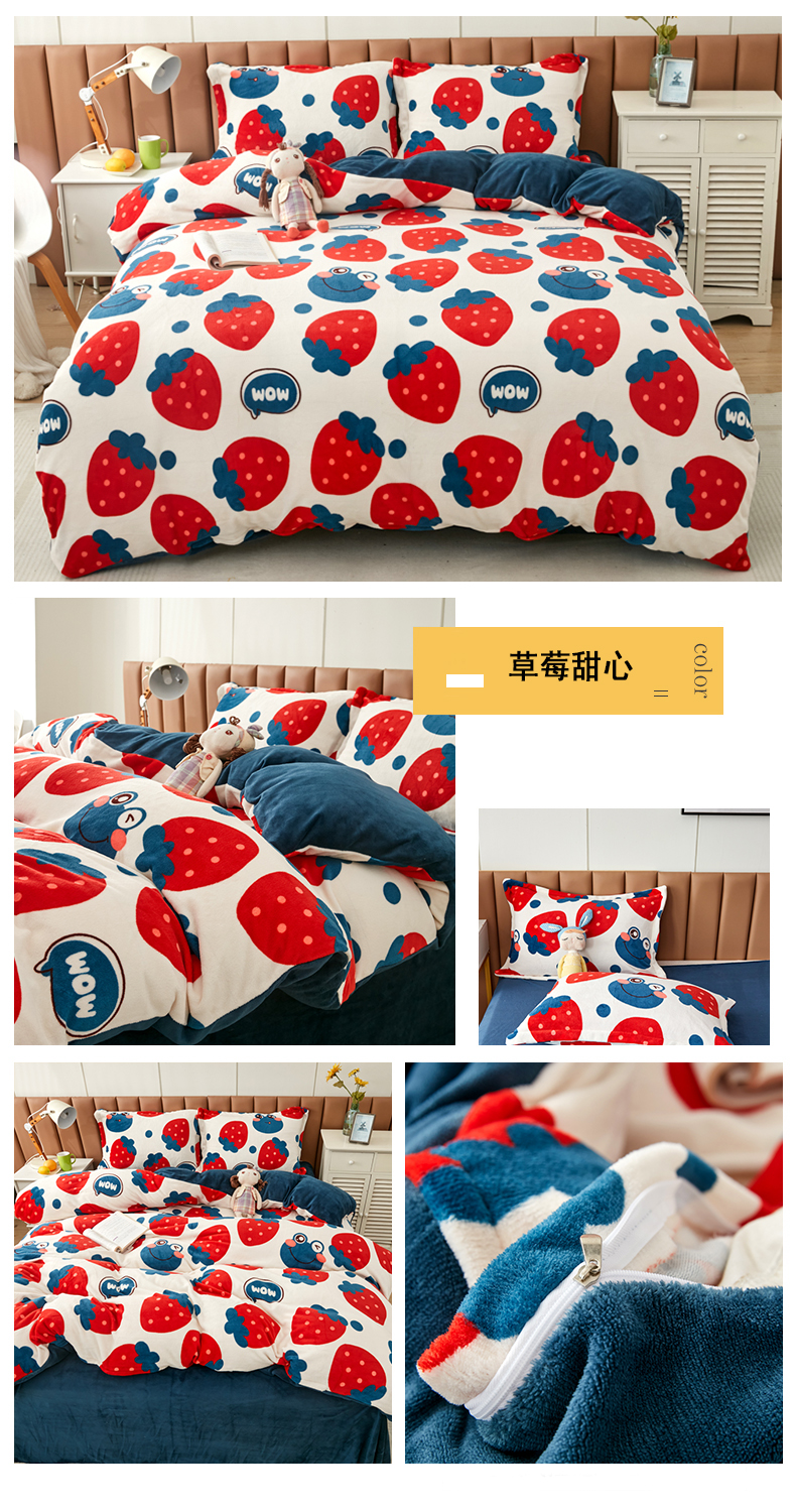 • 91家纺网 家纺一手货源 找家纺 乐居坊 2023新款高克重牛奶绒印花保暖四件套 草莓甜心