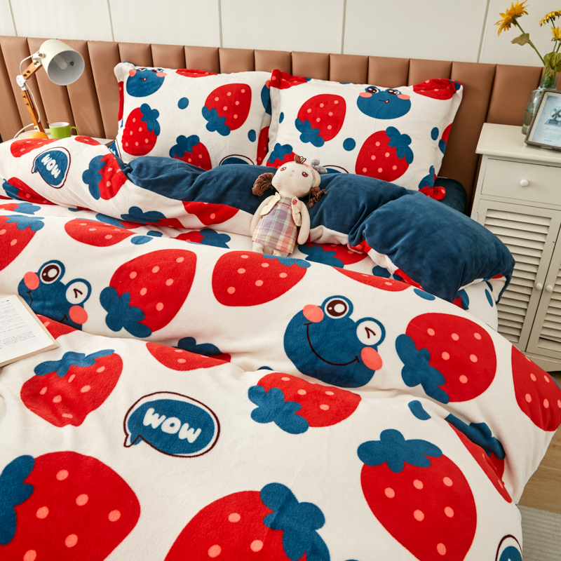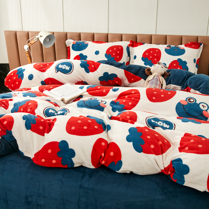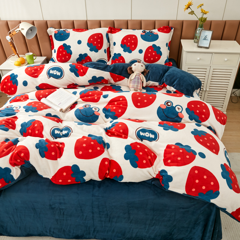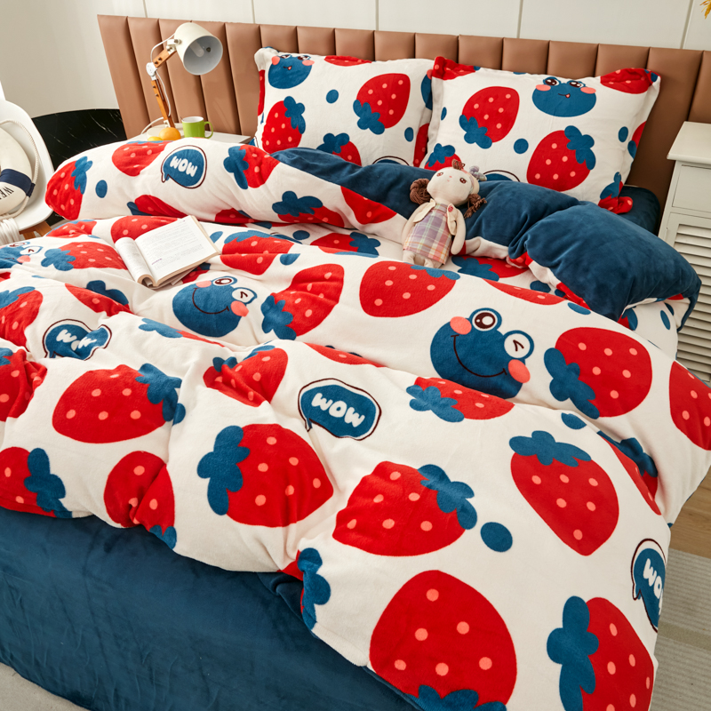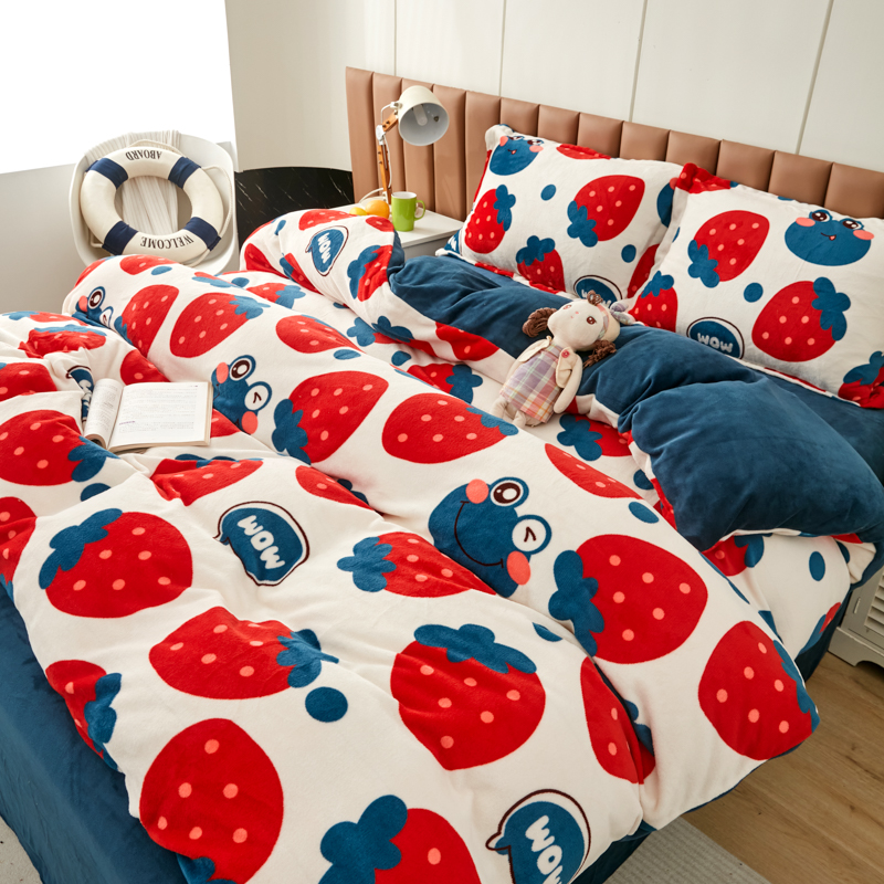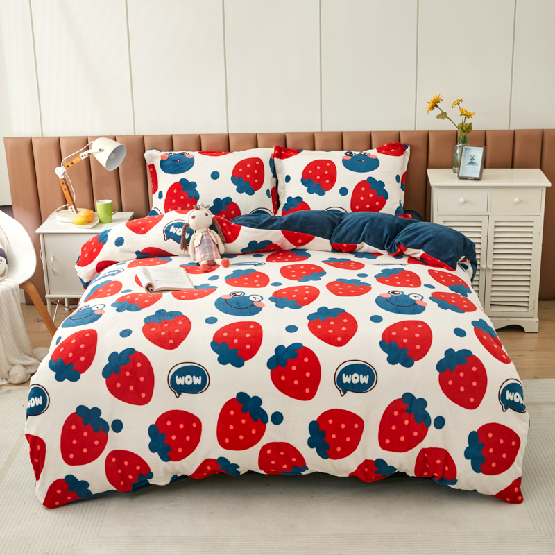 • 91家纺网 家纺一手货源 找家纺 乐居坊 2023新款高克重牛奶绒印花保暖四件套 草莓甜心