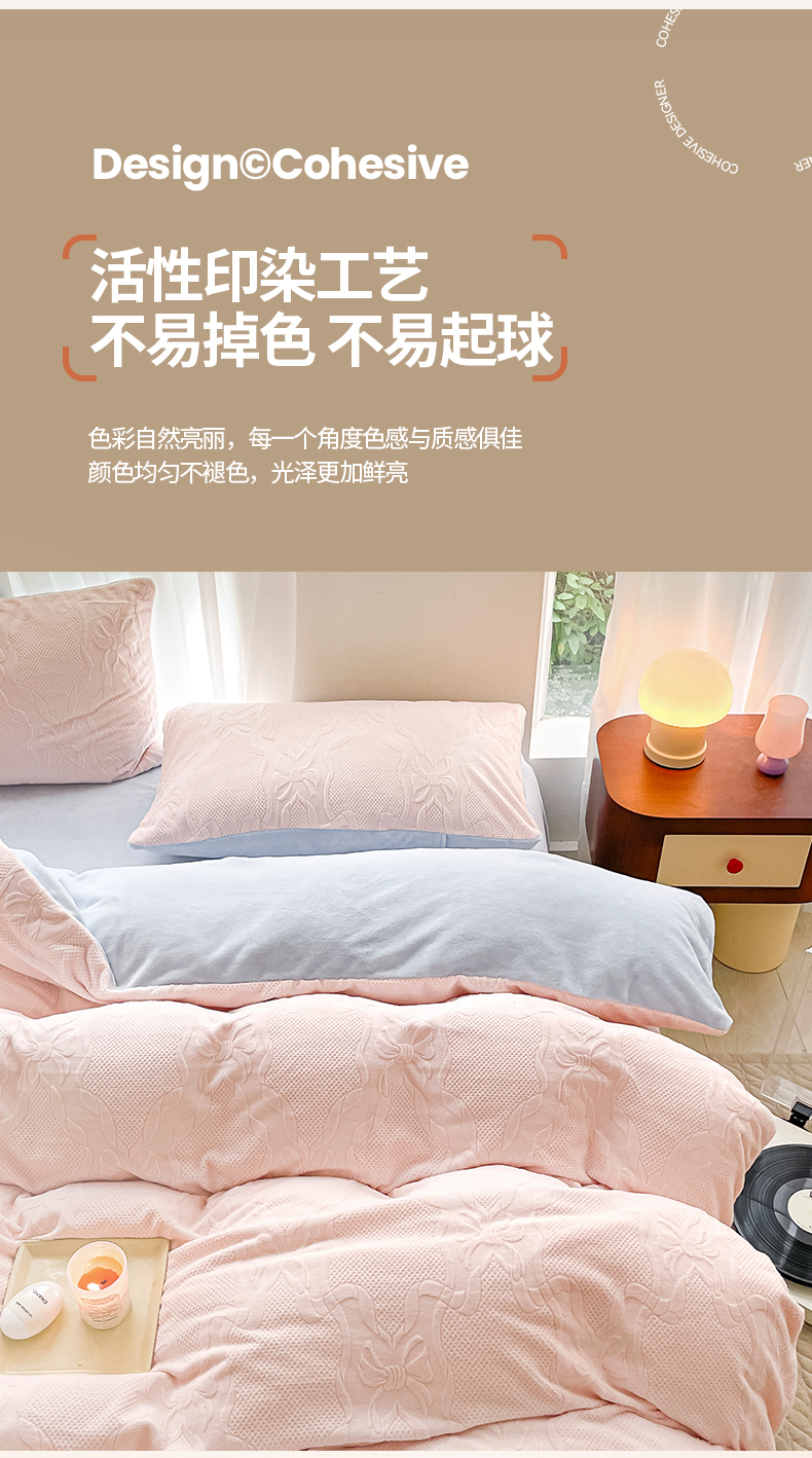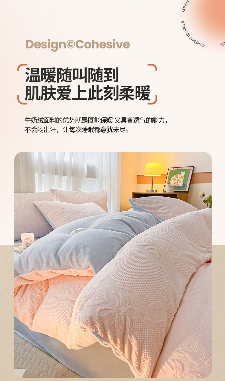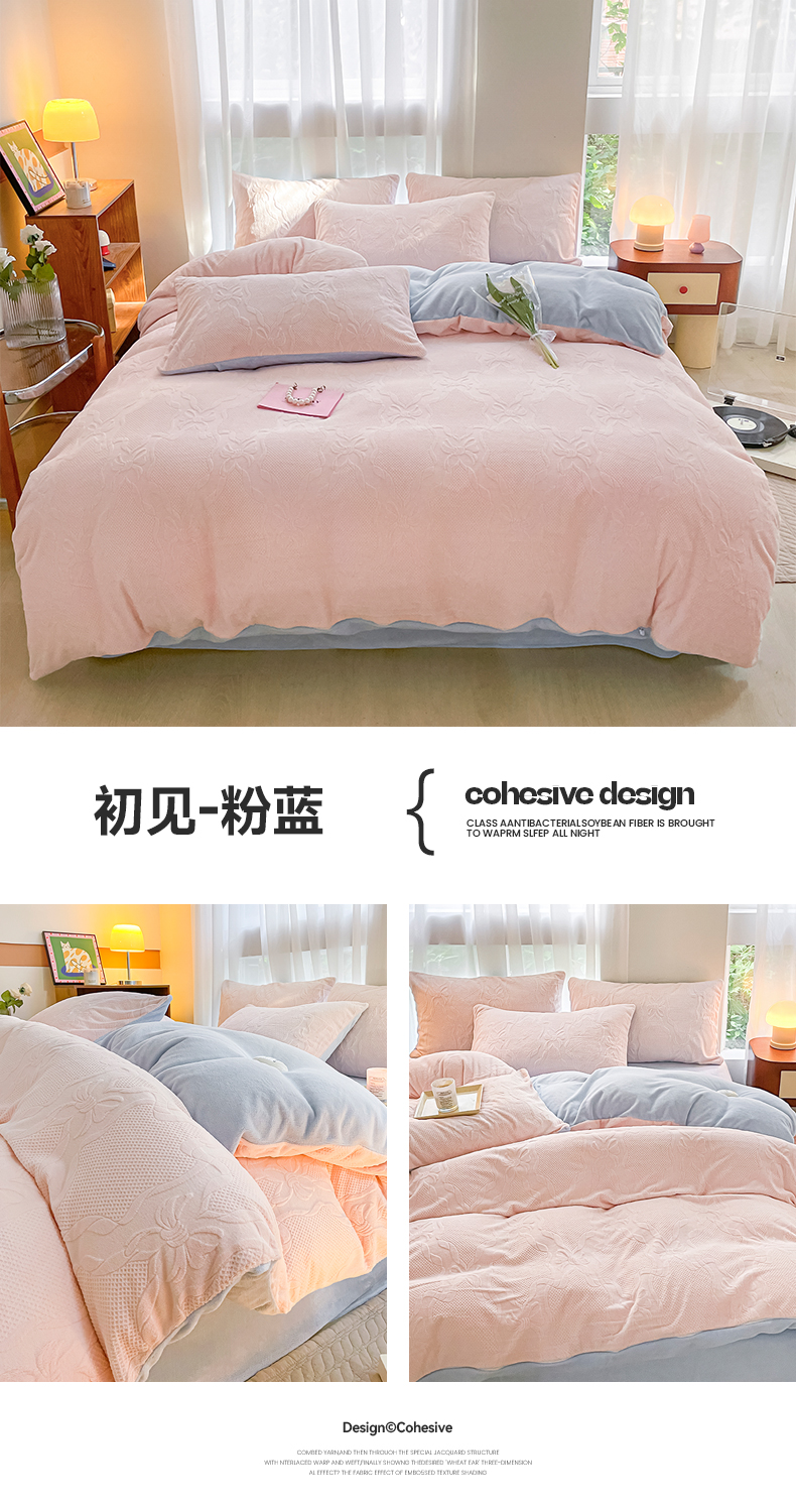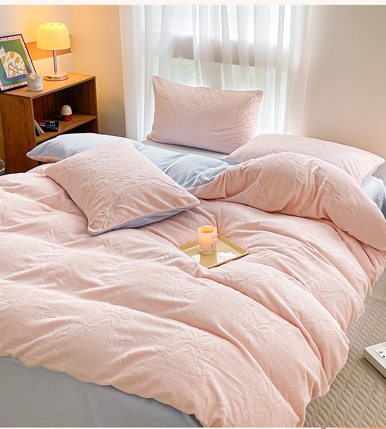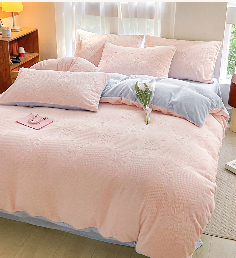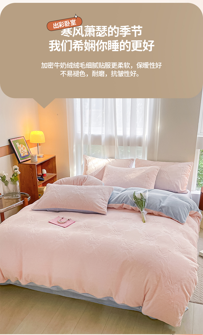 商品名称:蜜柚 2024新款全消光200克牛奶绒温柔治愈系奶油风雕花烂花极简牛奶绒四件套 初见-粉蓝