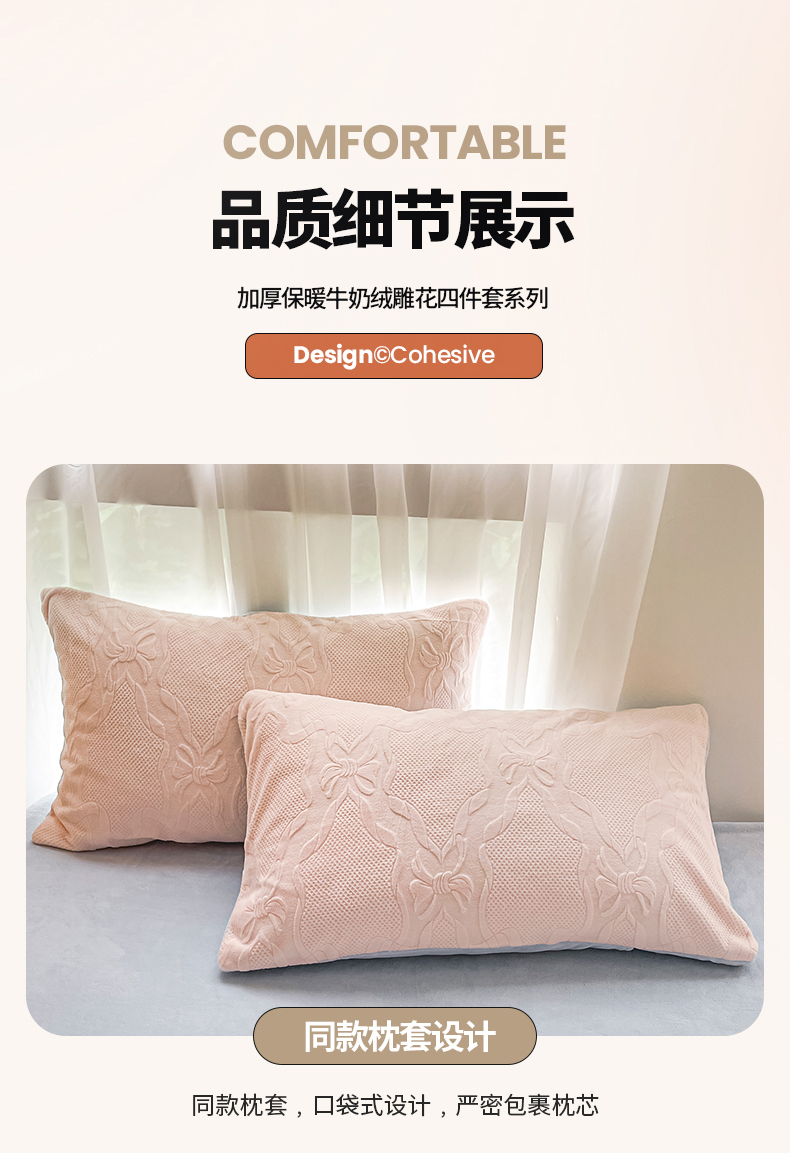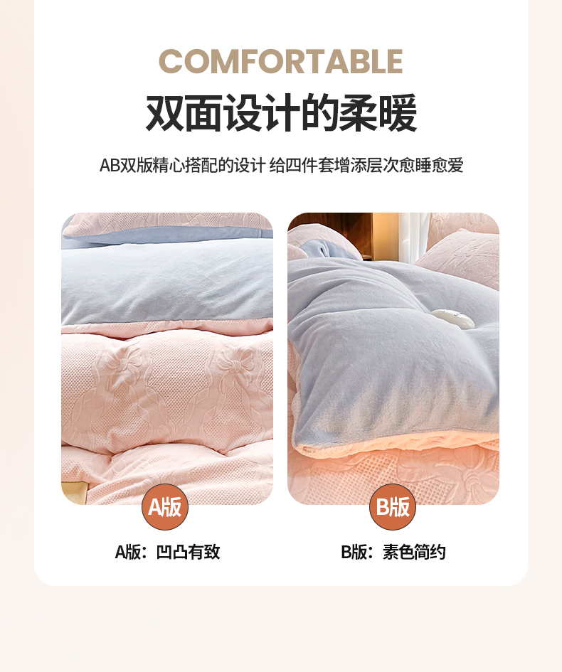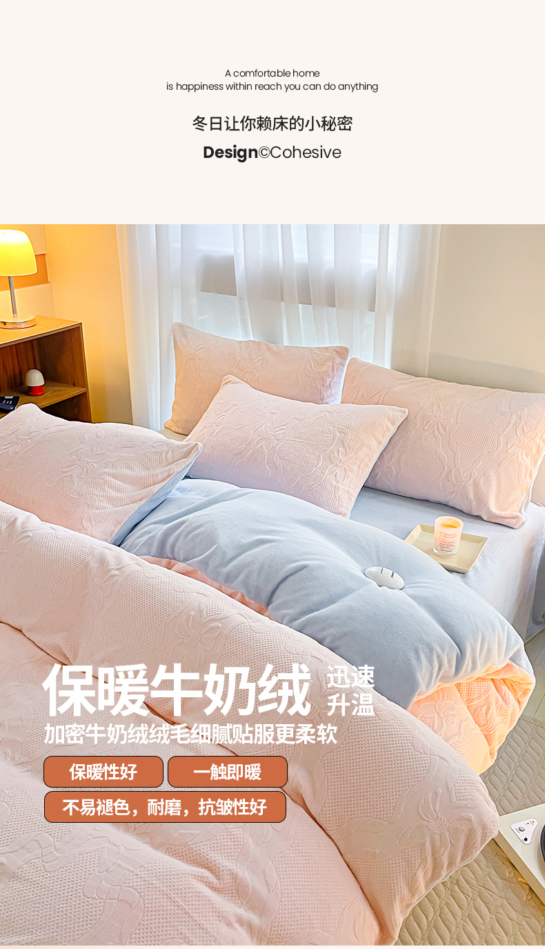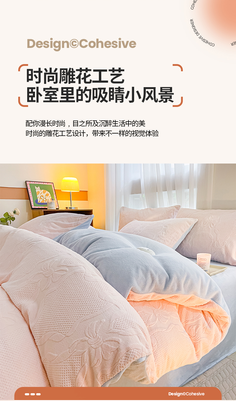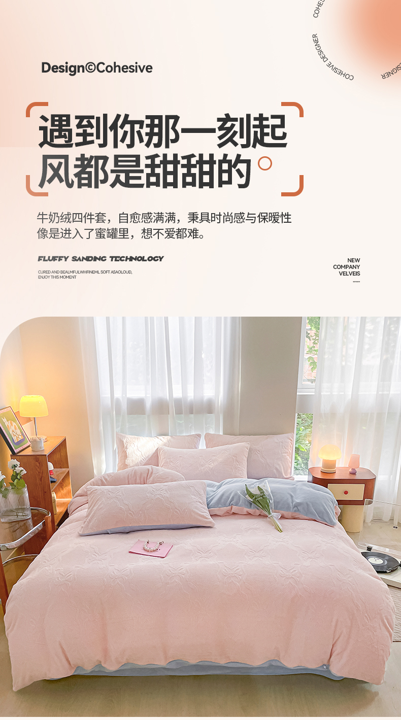 商品名称:蜜柚 2024新款全消光200克牛奶绒温柔治愈系奶油风雕花烂花极简牛奶绒四件套 初见-粉蓝