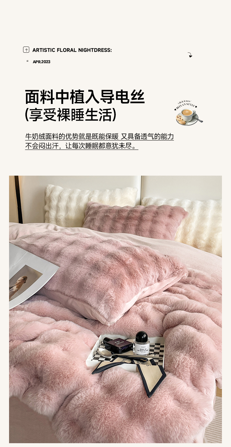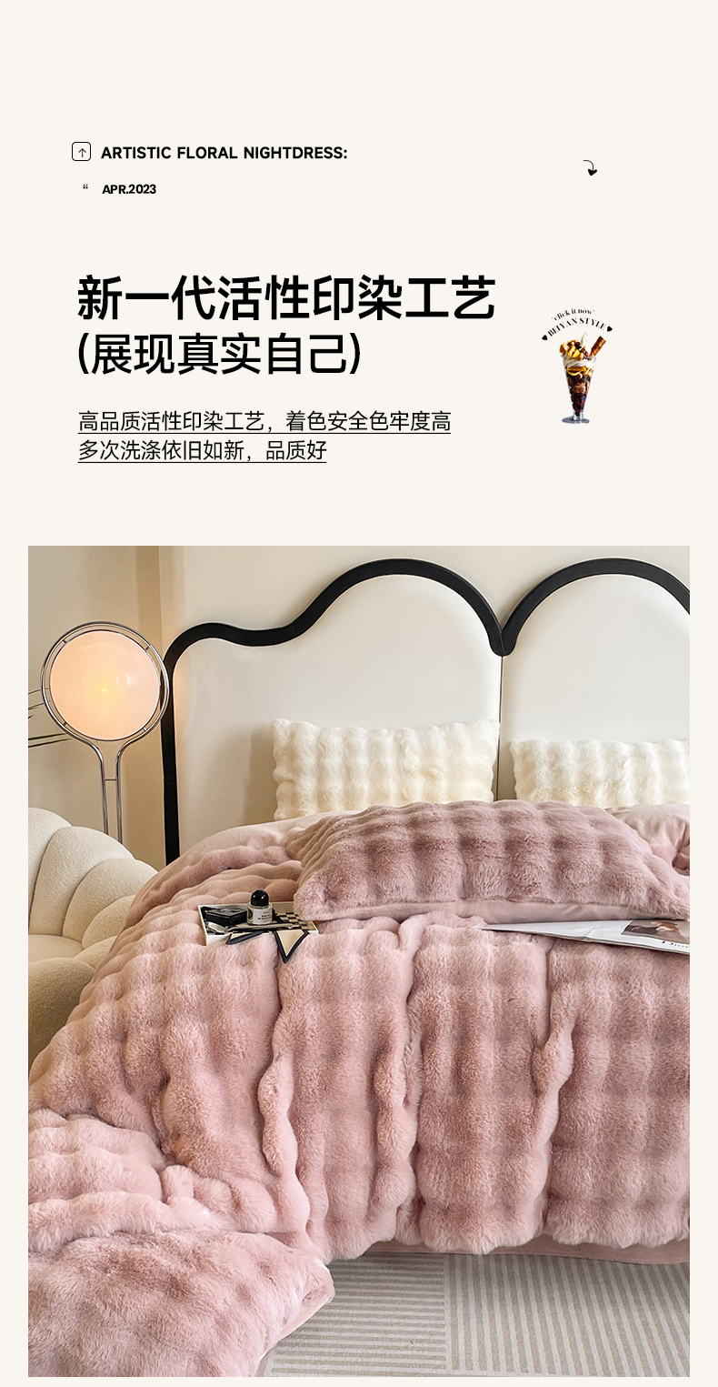 商品名称:寐居家纺 2023新款高克重大泡泡兔毛绒四件套系列 粉豆沙
