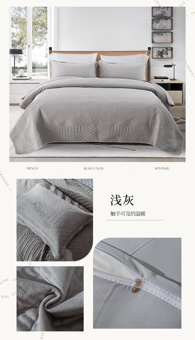 恩和家纺 2024新款水晶绒牛奶绒法兰绒床盖线条款 线条款-浅灰