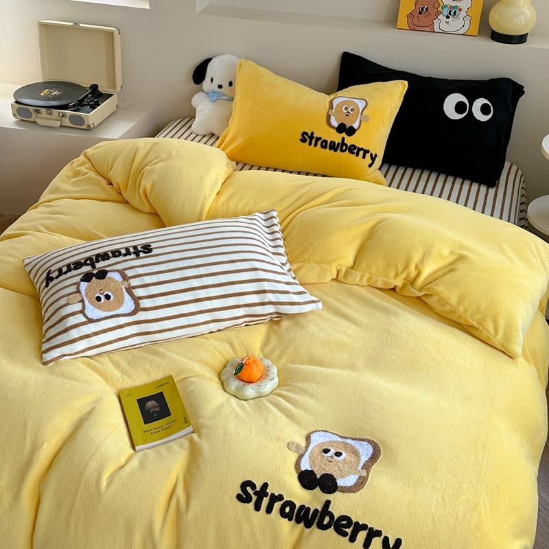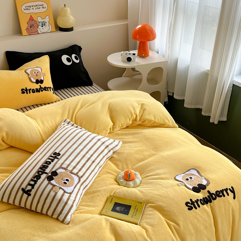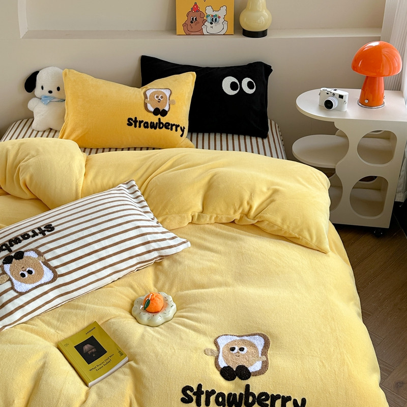 柚子 2023新款高克重牛奶绒多巴胺条纹毛巾绣四件套 面包超人