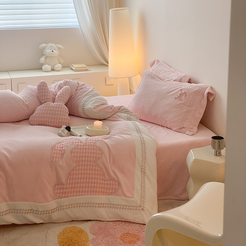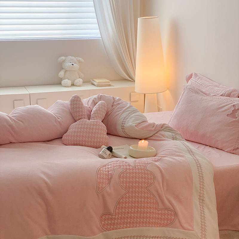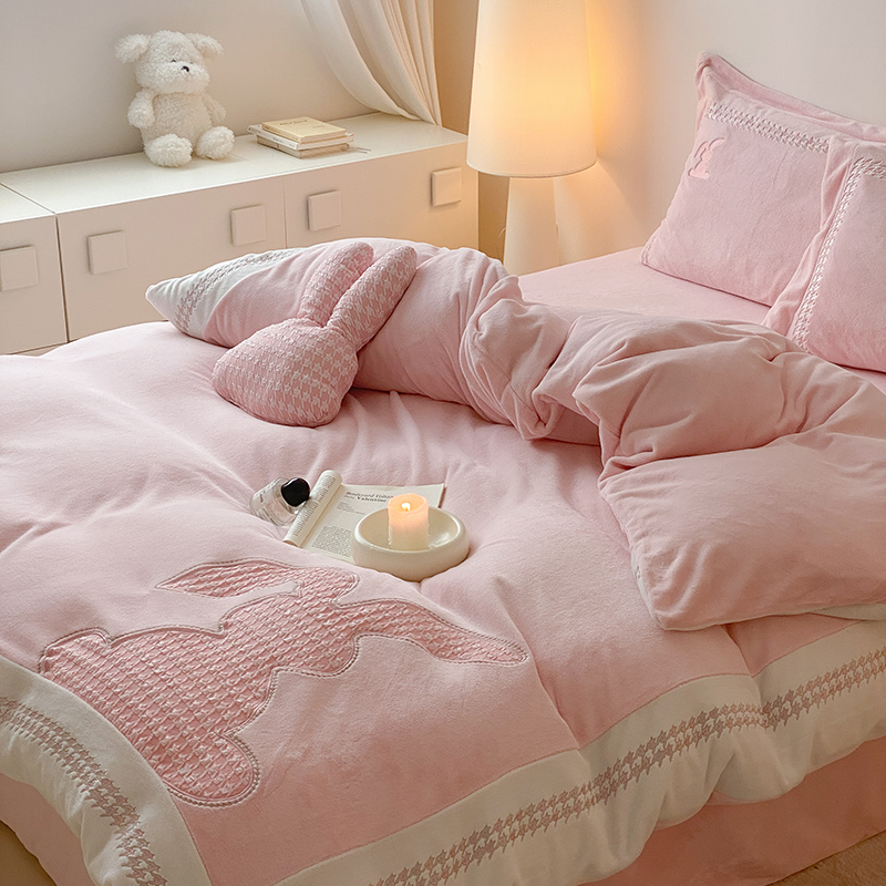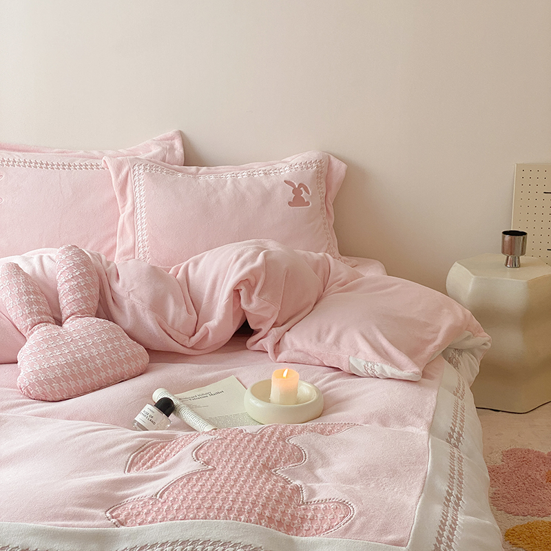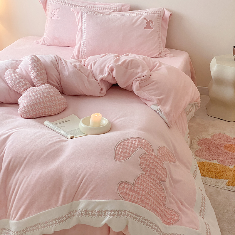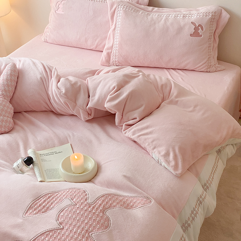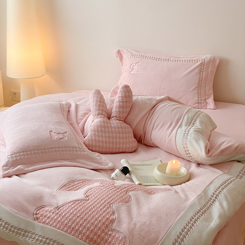 曼布缇 2025新款牛奶绒贴布绣花款四件套--艾娜兔绒(风格二) 绒艾娜兔-粉