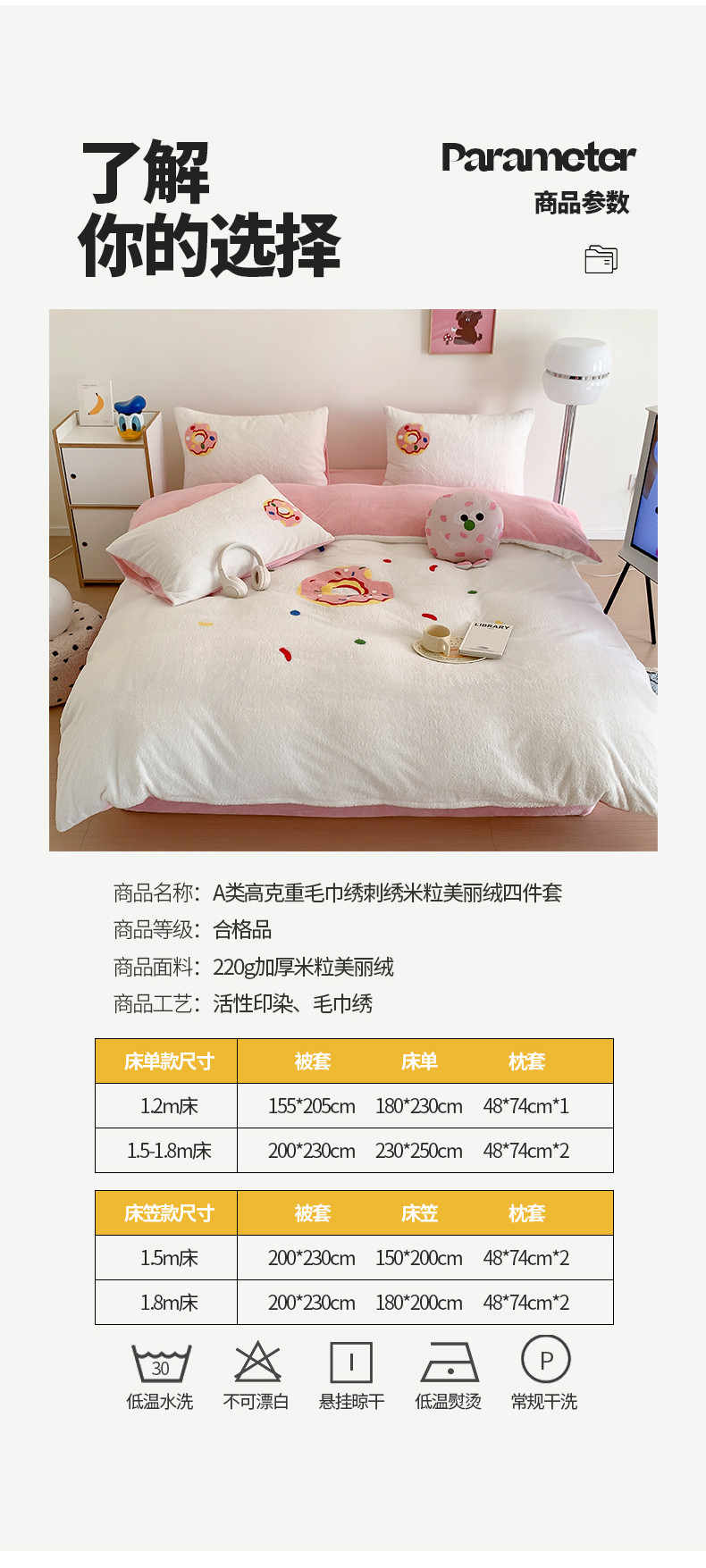 商品名称:桃子家居 2023新款A类高克重毛巾绣刺绣米粒美丽绒牛奶绒四件套 绒毛巾绣-甜甜圈